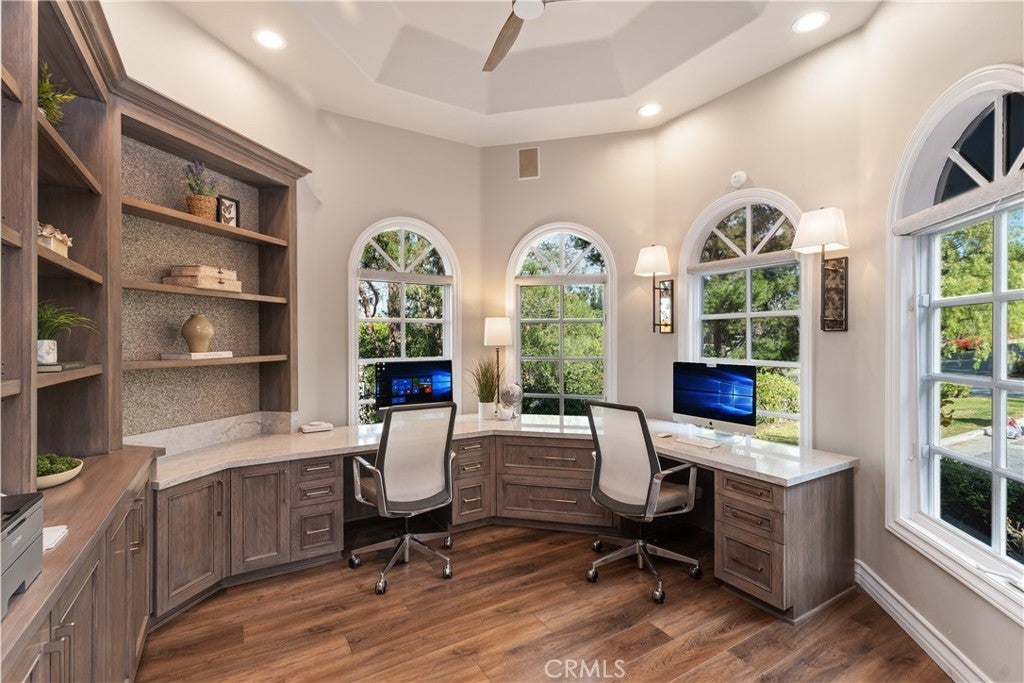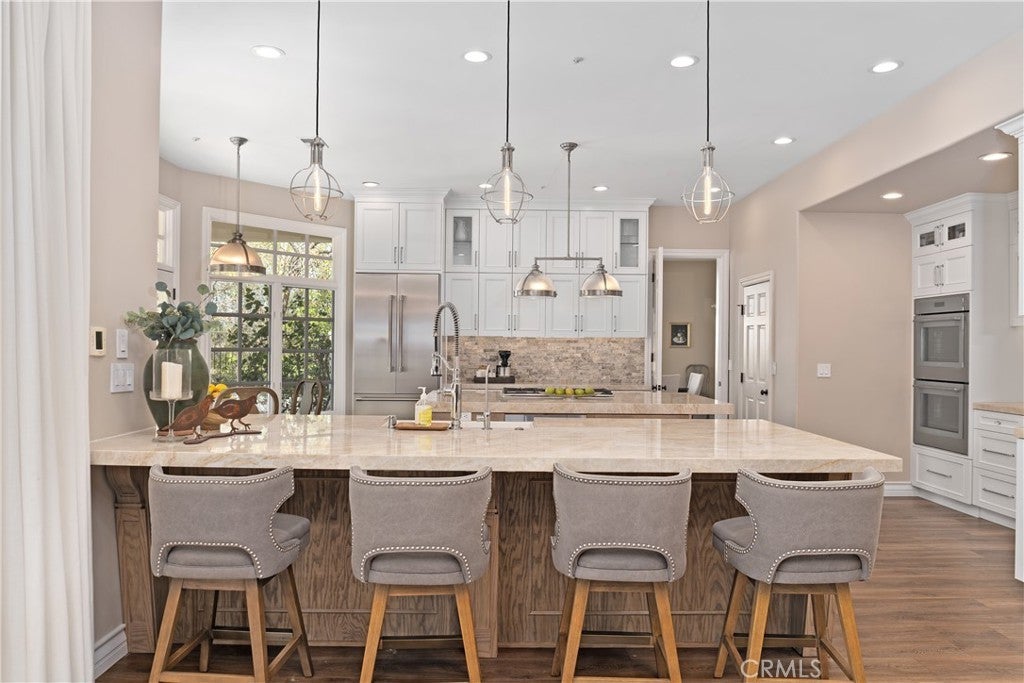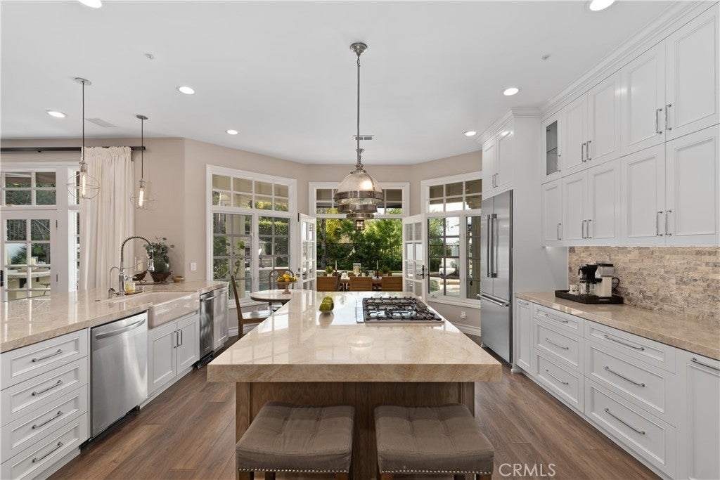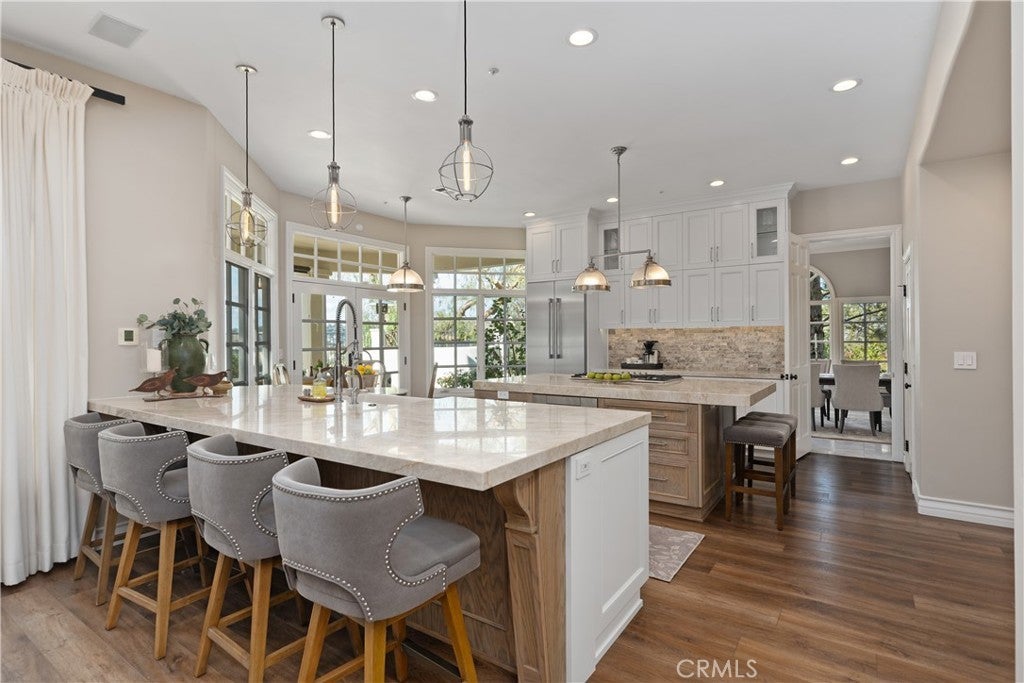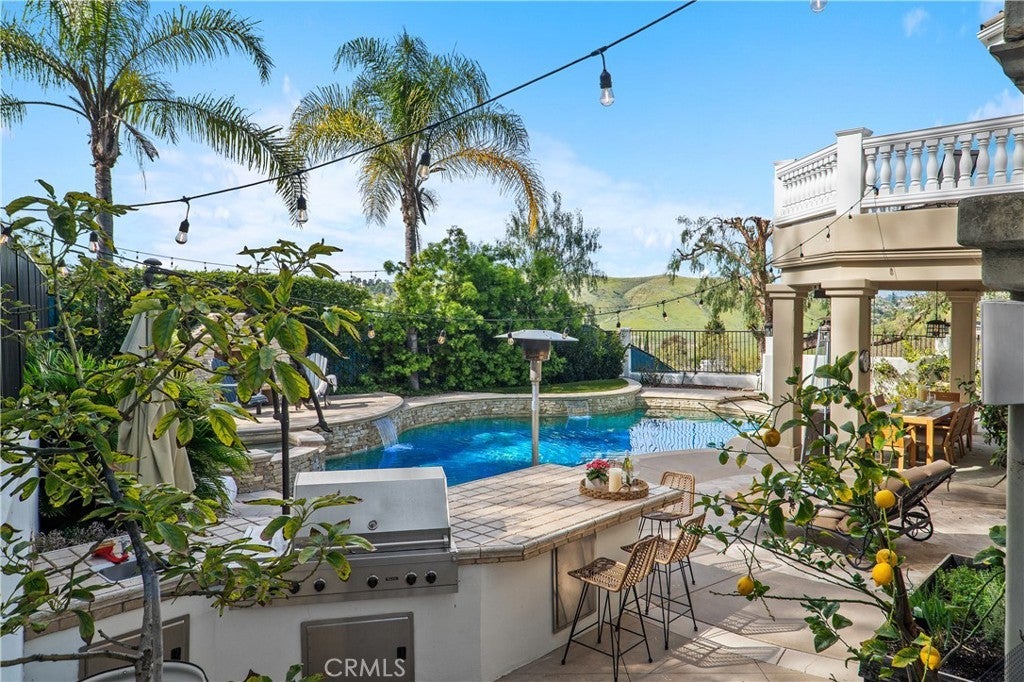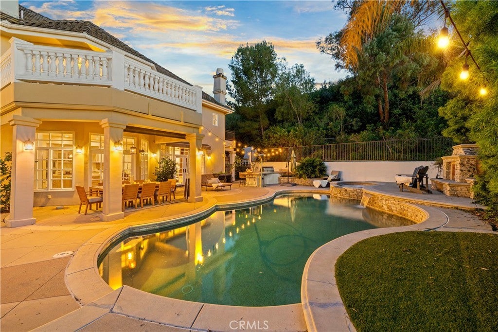 Impressive and secluded this Hunt Club secluded view home offers approximately 5,644 square feet of upgraded 'livable' living space with five bedrooms and four and a half bathrooms to include a bright custom downstairs office and spacious great room that wraps to a Newly Turfed side yard! With over an acre in property, this home offers privacy and an elegant timeless architectural design that includes an inviting entryway with impressive, coffered ceilings, dramatic staircase and an illuminating crystal chandelier. The long driveway provides ample parking for multiple cars while the backyard offers you an intimate and peaceful sunset setting! Enjoy a backyard boasting tranquil saltwater pool, spa, stone fireplace, and built-in BBQ surrounded by lush tropical landscaping and hillside views! The backyard also features a covered outdoor living area, perfect for ‘al fresco’ dining and entertaining guests. Inside, the home offers an abundance of natural light, complemented by charming architectural details. Professionally designed and gourmet inspired kitchen has been gorgeously remodeled in recent years with sophisticated soft tones, featuring Taj Mahal countertops, custom cabinetry, upgraded Thermador appliances and dual ovens, creating an exceptional cooking and entertaining space. Stone tile back splashes and accents adorn the kitchen with a large island, extensive counter area with wine refrigerator and drawer microwave. From kitchen to family room the flow is seamless and an inviting marble fireplace which creates a large setting for entertaining and family gatherings. Sunken living room- ONLY ONE STEP DOWN IN ENTIRE HOME- is a cozy retreat off entry and has a marble fireplace centered with coffered ceilings. Downstairs bedroom with an ensuite is perfect for in-laws or guests for added living flexibility! Primary bedroom is spacious with tall ceilings & a deck that captures sunsets and canyon views! The spa-like suite has Carrera white/black marble shower and tub plus newer cabinetry and black matte marble countertops. Three more en-suited bedrooms encompass the upstairs that also anchors a spacious great room & wet bar that has wraps around a side deck, large turf area to the backyard! The Hunt Club is a guard gated equestrian community that is close to downtown San Juan Capistrano with restaurants/shopping galore. Moments from Dana Pt Harbor & Doheny Bch. Blue Ribbon public schools and well-known private schools of St Margaret's & JSerra are nearby.