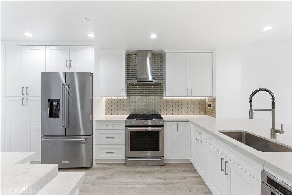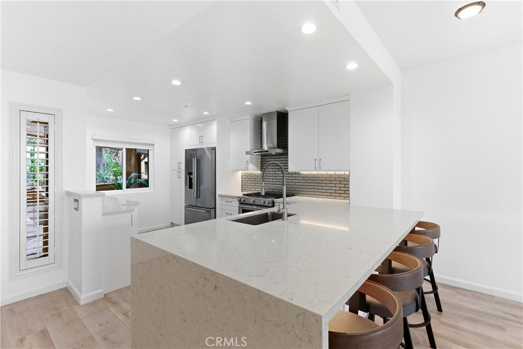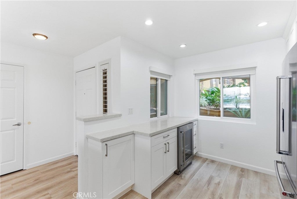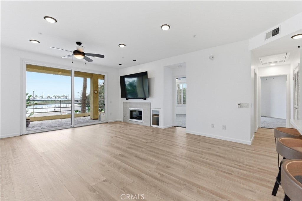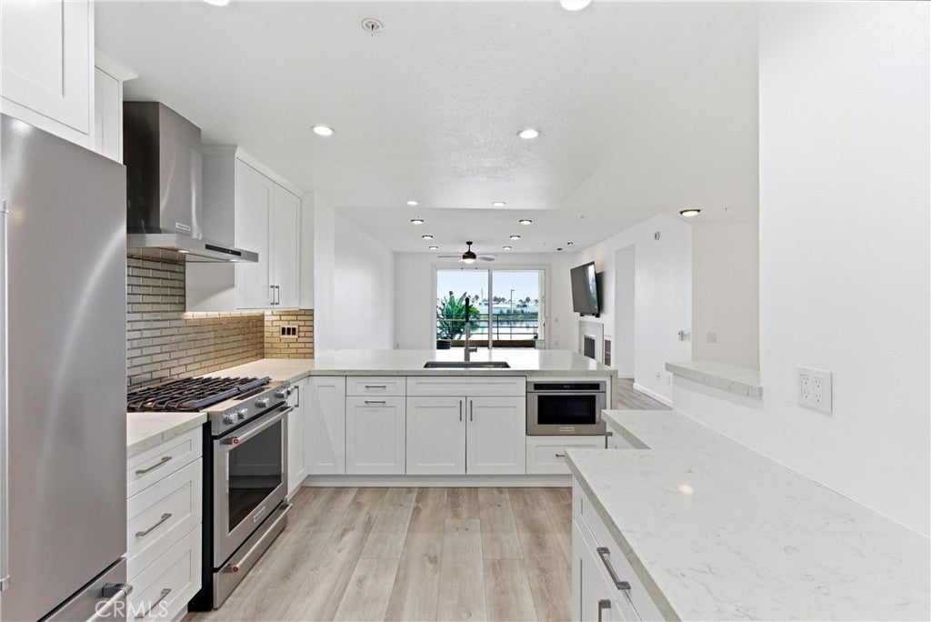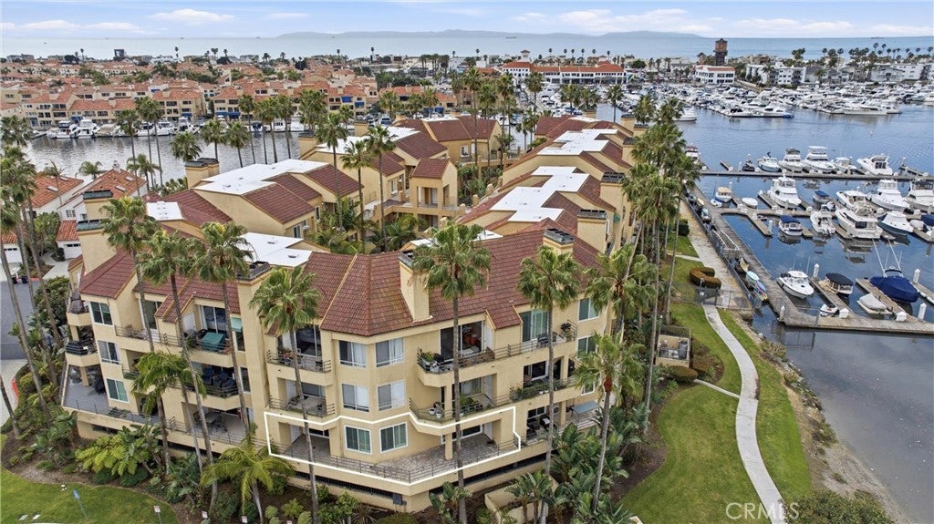 WOW! Welcome to this beautiful, single level, corner unit condo in the highly desirable and sought after Portofino Cove in Huntington Harbour. This home features 2 bedrooms and 2 bathrooms, with 1243 sq feet of living space plus a huge semi-wrap around deck which is perfect for morning coffee and evening sunsets while viewing harbor, channel and park views! This home has some fantastic upgrades including recessed lighting, vinyl plank flooring, brand new heating, and dual pane windows. The updated kitchen features quartz countertops, soft closing kitchen cabinets, newer appliances, including a wine refrigerator, as well as a coffee/cocktail counter space plus a breakfast bar open to the living room. The spacious floor plan in this home is perfect for all needs, including private space, shared space and office space. The primary suite includes an en suite bathroom with double vanity and a large walk-in closet. The secondary bedroom has great views and an attached full bathroom. Super giant wrap around patio great for cook outs and watching the sunset. Portofino Cove is resort style living on the water - a premier gated community with a relaxing pool, spa, sauna and outdoor kitchen overlooking the main channel in Huntington Harbour. There are two assigned parking spots in the subterranean parking garage that are close to the elevator and super convenient. Living in Portofino Cove is the ultimate lifestyle..make it yours!