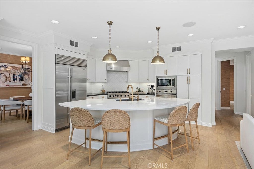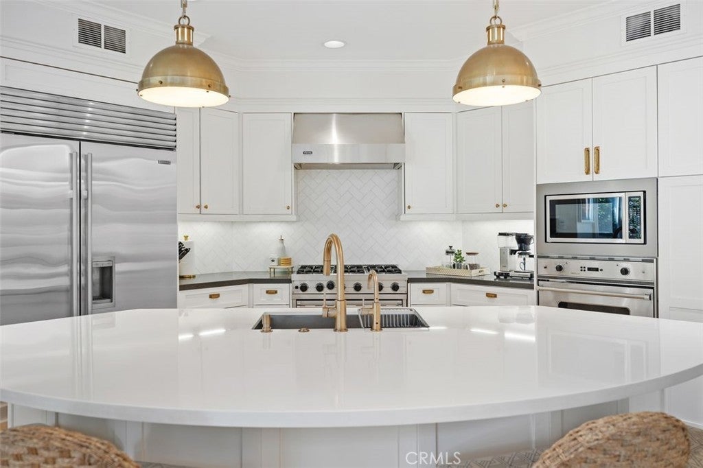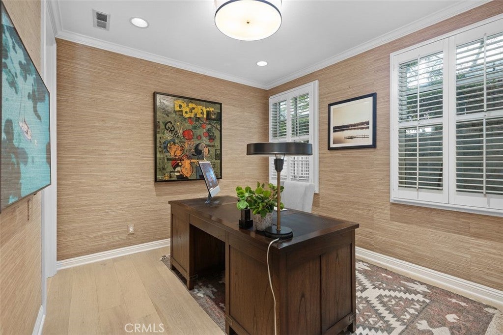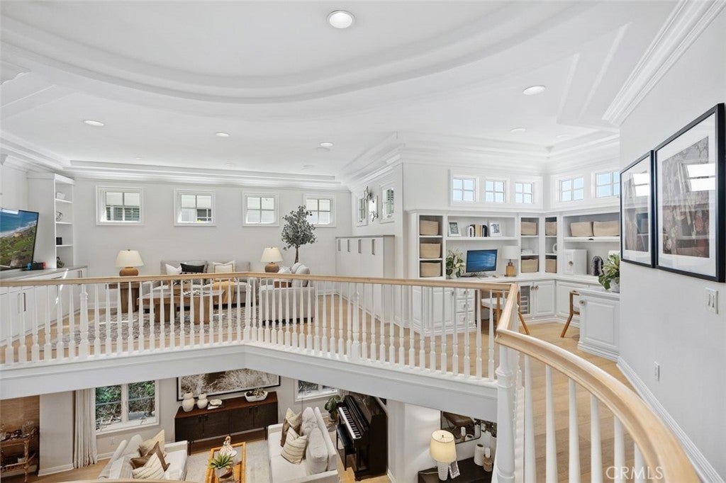 Tucked away on a tranquil cul-de-sac in one of Newport Beach’s most desirable 24-hour guard-gated communities, 4 Turtle Bay Drive presents an expanded Carmel 3 plan blending timeless architecture, thoughtful design, and exceptional modern upgrades. Meticulously maintained and beautifully appointed, this five-bedroom residence offers a highly versatile floor plan ideal for both everyday living and elegant entertaining. A welcoming entry features warm wood flooring throughout and neutral stone and quartz surfaces, creating a sophisticated yet inviting aesthetic throughout. The chef’s island kitchen is the heart of the home, showcasing premium Viking and Sub-Zero appliances, abundant prep space, generous cabinetry, and a whole-home Culligan water filtration system. Seamlessly open to the family room, with a custom entertainment wall unit, this space encourages effortless gatherings, whether hosting large celebrations or enjoying quiet evenings at home. The freshly painted, flexible five-bedroom layout includes two bedrooms on the main level—one without a closet, ideal for a private study or home office—and three en suite bedrooms upstairs with custom California Closet systems. The expansive primary suite is a true retreat, featuring a private balcony, oversized dual walk-in closets, and a spa-inspired bath complete with dual vanities, soaking tub, and separate shower. A dedicated attached office provides an ideal work-from-home environment with privacy and convenience. Upstairs, an oversized loft functions beautifully as a media or game room and includes a built-in library shelving, homework or study station, offering additional living space to suit a variety of needs. Designed for year-round enjoyment, the landscaped backyard offers exceptional privacy and resort-style amenities. Elegant stone hardscaping frames a built-in gas fireplace, sparkling pool, and relaxing spa—creating the perfect setting for outdoor entertaining or tranquil evenings under the stars. Professionally designed with an irrigation drip system. Combining a coveted cul-de-sac location, 24-hour guard-gated security, refined upgrades, and a thoughtfully expanded floor plan, this exceptional home delivers comfort, style, and versatility in one of Newport Beach’s premier communities.