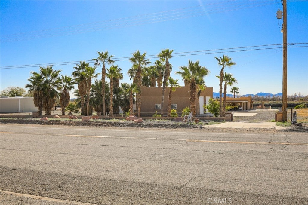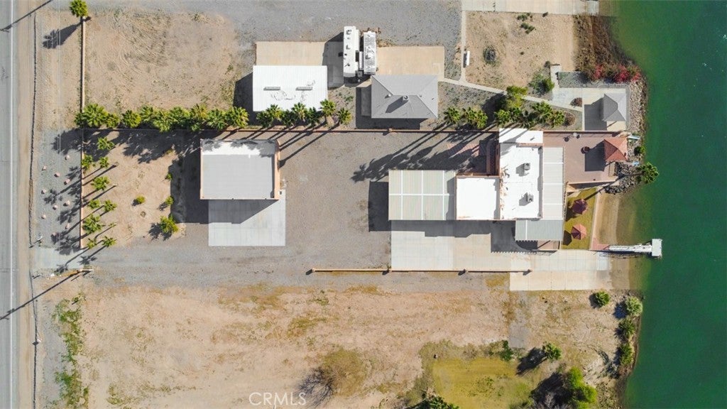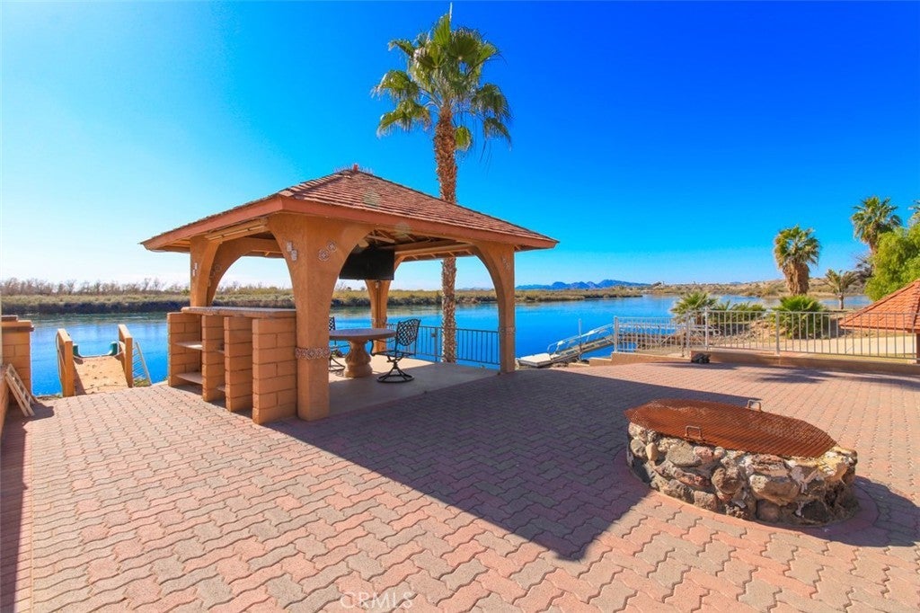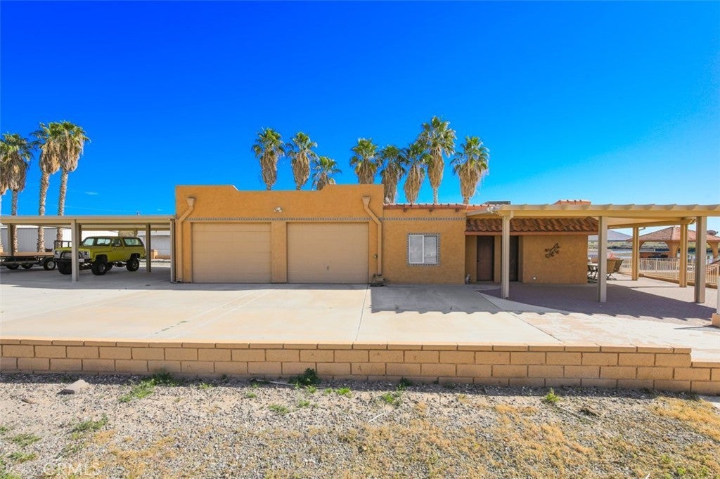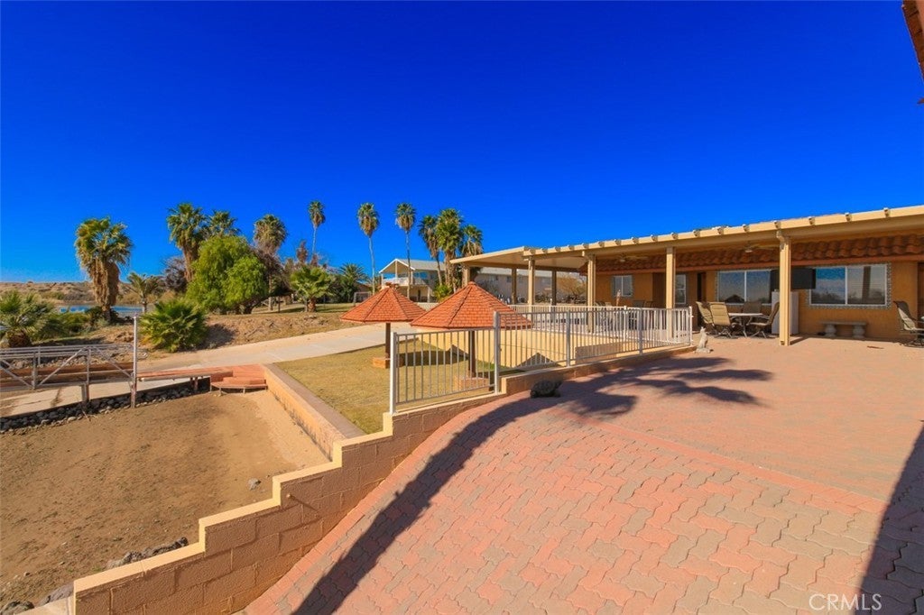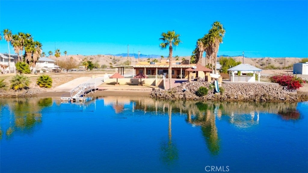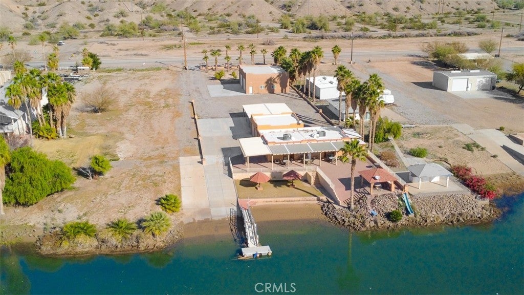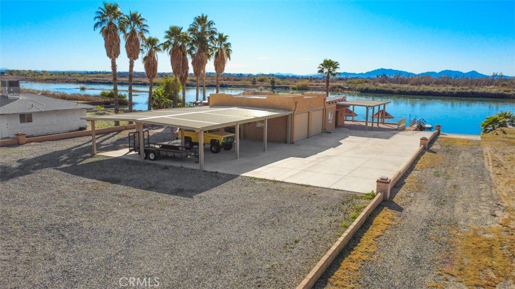 MAJESTIC – One-of-a-Kind Riverfront Property! Located just six miles west of Parker on the California side of the Colorado River, this Spanish-style custom home was designed to embrace and share the ultimate river lifestyle. Thoughtfully set up like a duplex, one side offers 2 bedrooms, a bathroom, living/dining area, full kitchen, covered side patio, and storage shed. The other side features an oversized bunk-style bedroom designed to accommodate multiple beds, plus its own bathroom, living/dining area, and kitchen—perfect for hosting family and friends. The property also includes a massive stucco garage, plenty of room for 8 cars, boats and all your toys, complete with an additional room and bathroom inside, 5th-wheel hookups with patio, and approximately one acre enclosed by brick-lined walls accented with Sedona desert rock, palm trees, and fruit trees, with ample room to build, expand, or plant more. The riverfront is truly exceptional—stylish paved brick shoreline, stone fire pit, gazebo at the water’s edge, built-in bar and table, water slide, diving board, private beach area with retaining wall and sand, two palapas with tiled tables, outdoor shower, private boat ramp, dock, and designated swim area when water levels allow. Ideal as a retirement retreat, vacation getaway, or multi-family river compound.