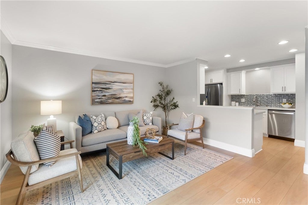 Huntington Beach move in ready downstairs unit with a large enclosed patio and no stairs, featuring brand new luxury vinyl flooring, recessed lighting, smooth ceilings, fresh designer paint, and crisp 5 inch baseboards with crown molding for a bright, finished look throughout. The updated quartz kitchen is both stylish and functional with custom cabinetry, stainless steel appliances, a farmhouse sink, designer tile backsplash, and a decorative chandelier that sets the tone for everyday living and entertaining. The spacious primary bedroom offers excellent storage, including three full sized mirrored closet doors plus built in dresser and cabinetry for effortless organization. The private ensuite bathroom showcases designer fixtures and custom tile finishes, creating a clean, spa inspired retreat. One of the standout lifestyle advantages is the ground level location, delivering easy access and a large enclosed patio that feels like an extension of the living space. Perfect for morning coffee, quiet evenings, or a bit of outdoor living without the upkeep. Additional storage adds everyday convenience. Residents enjoy community amenities including a sparkling pool, recreation room with pool table, and on site laundry. Monthly utility costs are simplified and often reduced because HOA dues include gas, water, trash, and sewer, offering meaningful built in savings and easier budgeting. Ideally located near the best of Huntington Beach, including a short drive to world renowned beaches, wetland walking trails, epicurean dining, and shopping. Enjoy quick access to Meadowlark Golf Course and driving range, plus neighboring parks for outdoor time year round. A great opportunity to enjoy comfort, style, and a low maintenance coastal lifestyle.