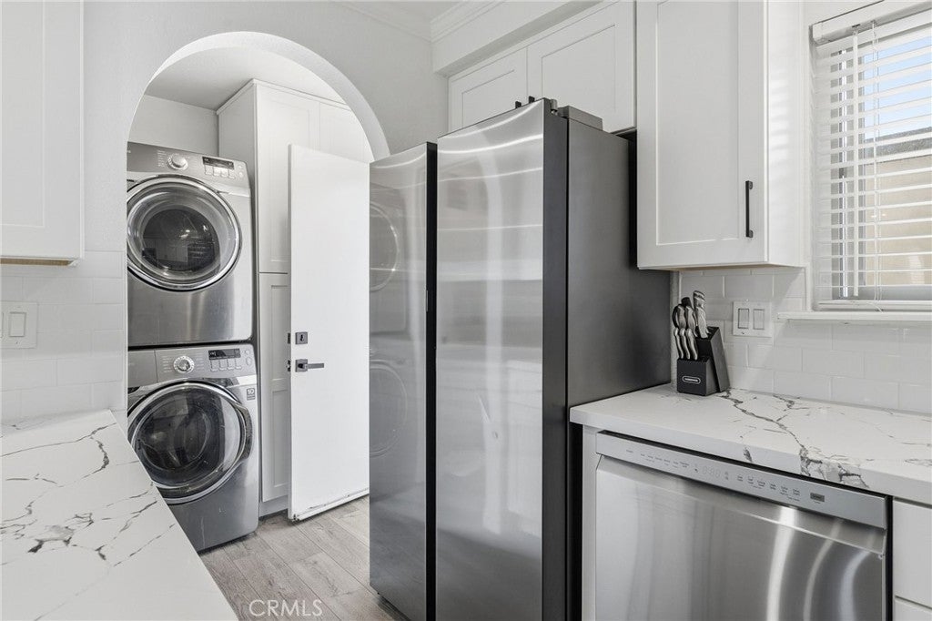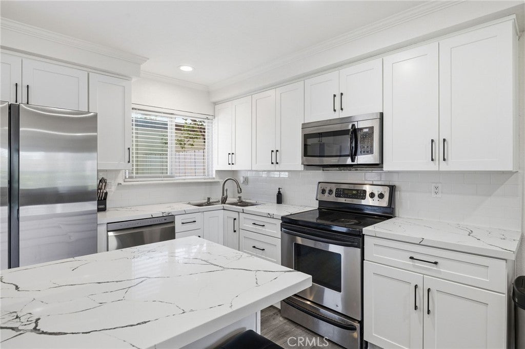 COMPLETELY RENOVATED TURNKEY HOME WITH DIRECT 2 CAR GARAGE ACCESS AND IN UNIT LAUNDRY. This beautifully remodeled Tustin Place residence has been extensively upgraded and renovated. The brand new gourmet kitchen is the centerpiece of the home, featuring all new custom cabinetry with soft close drawers and doors, quartz countertops, a full custom tile backsplash, stainless steel appliances, and new modern recessed lighting with updated wiring. Home also has highly sought after in unit laundry for double stacked washer and dryer and custom built cabintery allowing for plenty of extra storage. The flooring has been completely redone throughout the entire home, creating a seamless, modern look from top to bottom. Additional interior upgrades include fresh neutral paint, dual pane windows, custom crown molding, and new baseboards. The electrical panel has been upgraded along with new wiring and recessed lighting throughout. Major improvements also include a new water heater, new toilets, and updated vanities and shower. One of the most desirable features is the rare direct access private 2 car garage, complete with a new door, motor, and newer epoxied flooring. The entire row of garage exteriors throughout the community has also been fully redone, enhancing curb appeal and long term value. Lightly lived in for only two years since completion of the renovation.