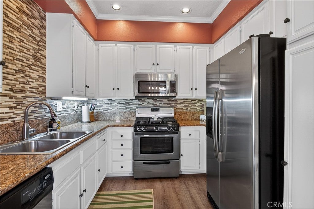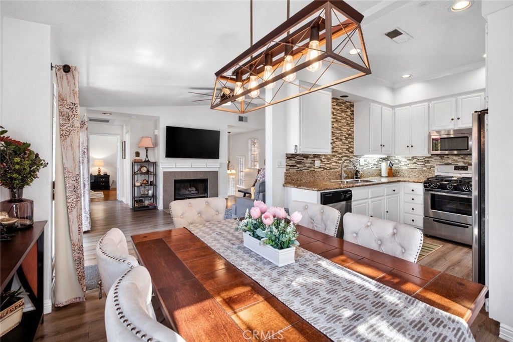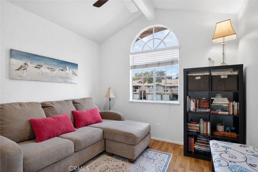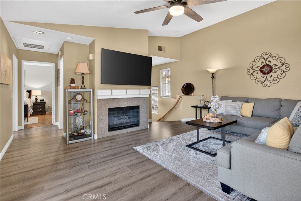 BACK ON THE MARKET AT NO FAULT OF SELLER! BUYER LOST THEIR JOB AND COULD NO LONGER PERFORM. This meticulously cared-for carriage-style condo features an interior sweeping stairway leading to a spacious single-level floor plan. All living areas are located on one level above the attached one-car garage, offering the added benefit of no one above or below. Step inside to dramatic high ceilings and an abundance of natural light that fills the open floor plan. The living room is enhanced by a cozy fireplace and sliding doors that lead to a sunny deck, an ideal spot to unwind at the end of the day. Designed with both style and function in mind, the kitchen showcases granite counters, crisp white cabinets, stainless steel appliances, a pantry, and a glass tile backsplash. The generously sized dining area, just off the kitchen, provides flexibility for everyday meals and special occasions alike. Vaulted ceilings enhance the sense of space in the inviting primary suite, complete with a walk-in closet and a dressing area with dual sinks and a shower-tub combination. The secondary bedroom is perfect for guests, a home office, or a den. Additional highlights include Luxury Vinyl flooring, a newer HVAC system, a tankless water heater, and a community-wide repiping was completed. Located in the desirable Serabrisa community, residents enjoy a beautifully updated pool, spa, and BBQ area. Just across from Arroyo Vista Park, and close to Tijeras Creek Golf Course, shopping, dining, schools, and trails. With SAMLARC membership, enjoy access to Lago Santa Margarita Beach Club, multiple pools, sports courts, scenic hiking and biking trails, and year-round community events.