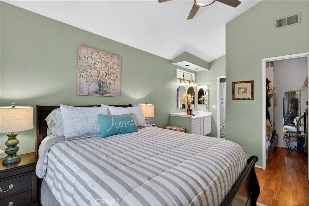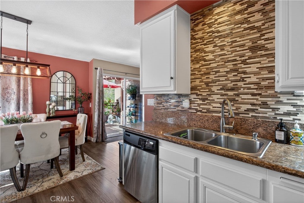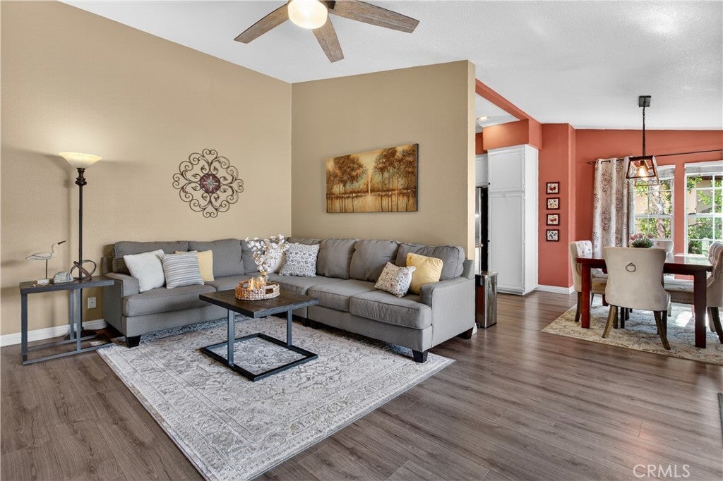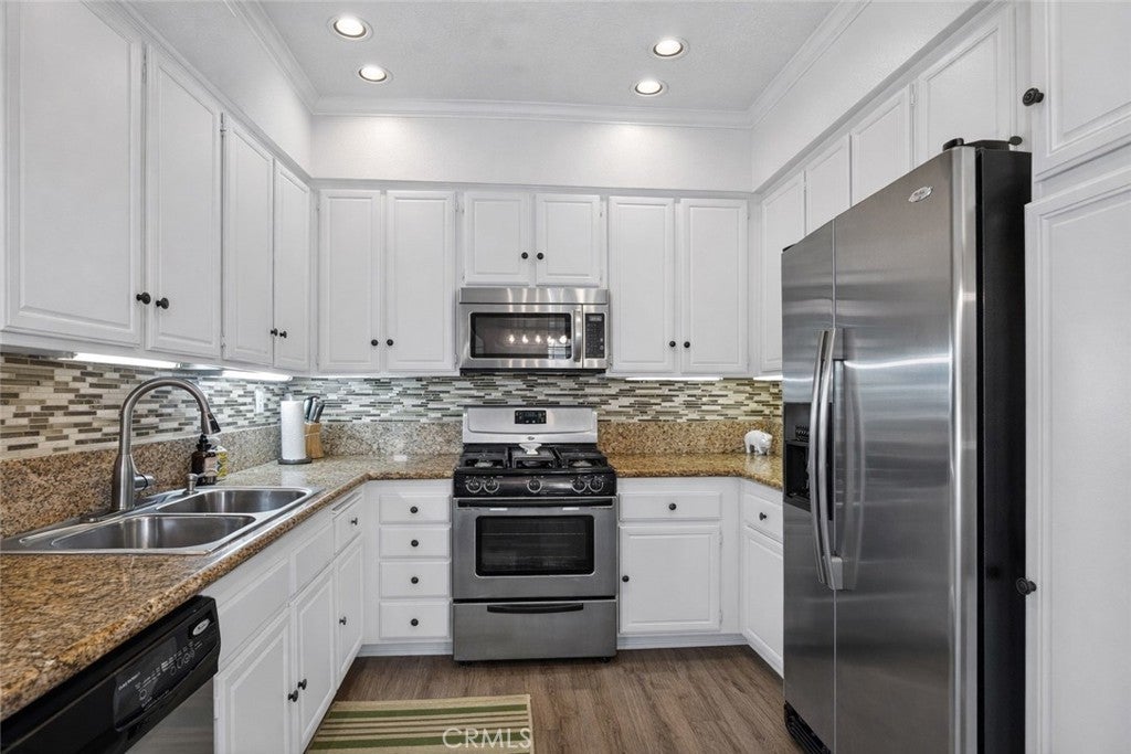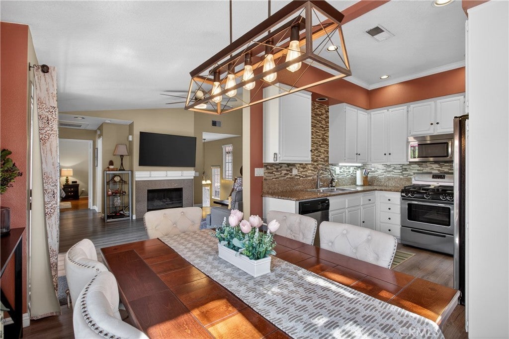 BACK ON THE MARKET AT NO FAULT OF SELLER! BUYER LOST THEIR JOB AND COULD NO LONGER PERFORM. This meticulously cared-for carriage-style condo features an interior sweeping stairway leading to a spacious single-level floor plan. All living areas are located on one level above the attached one-car garage, offering the added benefit of no one above or below. Step inside to dramatic high ceilings and an abundance of natural light that fills the open floor plan. The living room is enhanced by a cozy fireplace and sliding doors that lead to a sunny deck, an ideal spot to unwind at the end of the day. Designed with both style and function in mind, the kitchen showcases granite counters, crisp white cabinets, stainless steel appliances, a pantry, and a glass tile backsplash. The generously sized dining area, just off the kitchen, provides flexibility for everyday meals and special occasions alike. Vaulted ceilings enhance the sense of space in the inviting primary suite, complete with a walk-in closet and a dressing area with dual sinks and a shower-tub combination. The secondary bedroom is perfect for guests, a home office, or a den. Additional highlights include Luxury Vinyl flooring, a newer HVAC system, a tankless water heater, and a community-wide repiping was completed. Located in the desirable Serabrisa community, residents enjoy a beautifully updated pool, spa, and BBQ area. Just across from Arroyo Vista Park, and close to Tijeras Creek Golf Course, shopping, dining, schools, and trails. With SAMLARC membership, enjoy access to Lago Santa Margarita Beach Club, multiple pools, sports courts, scenic hiking and biking trails, and year-round community events.