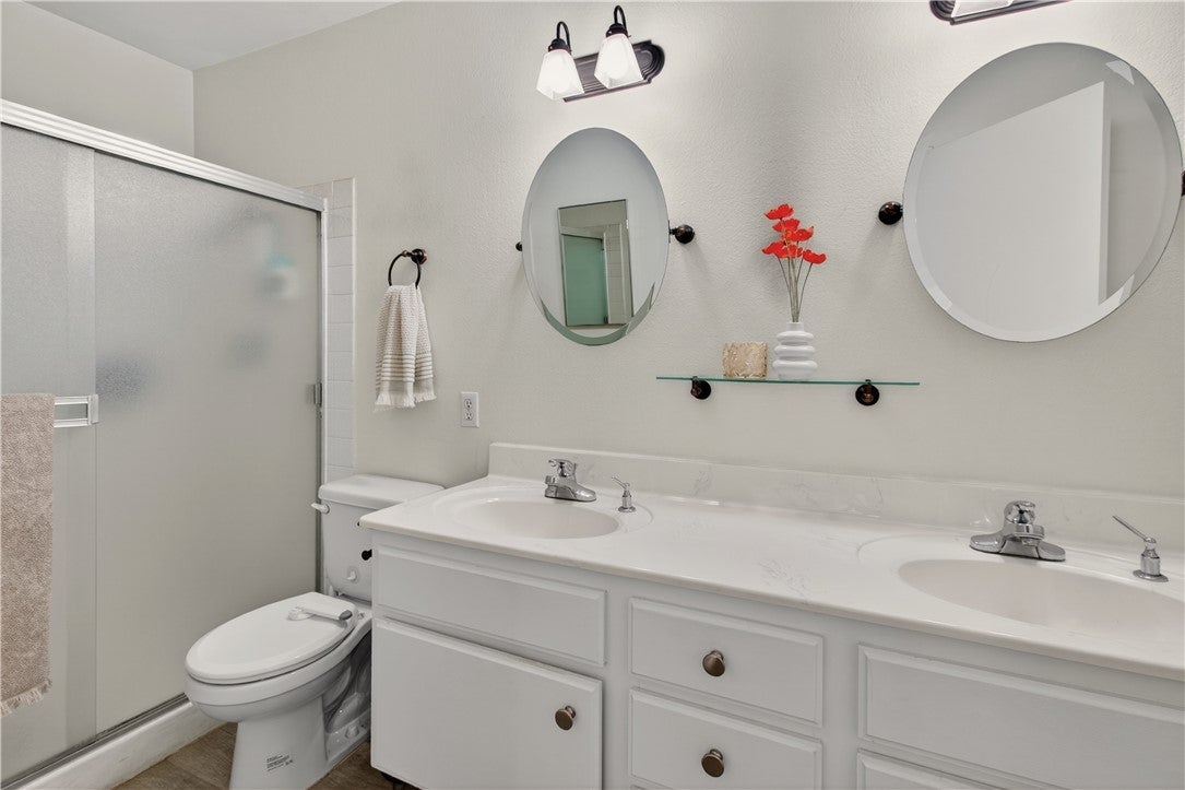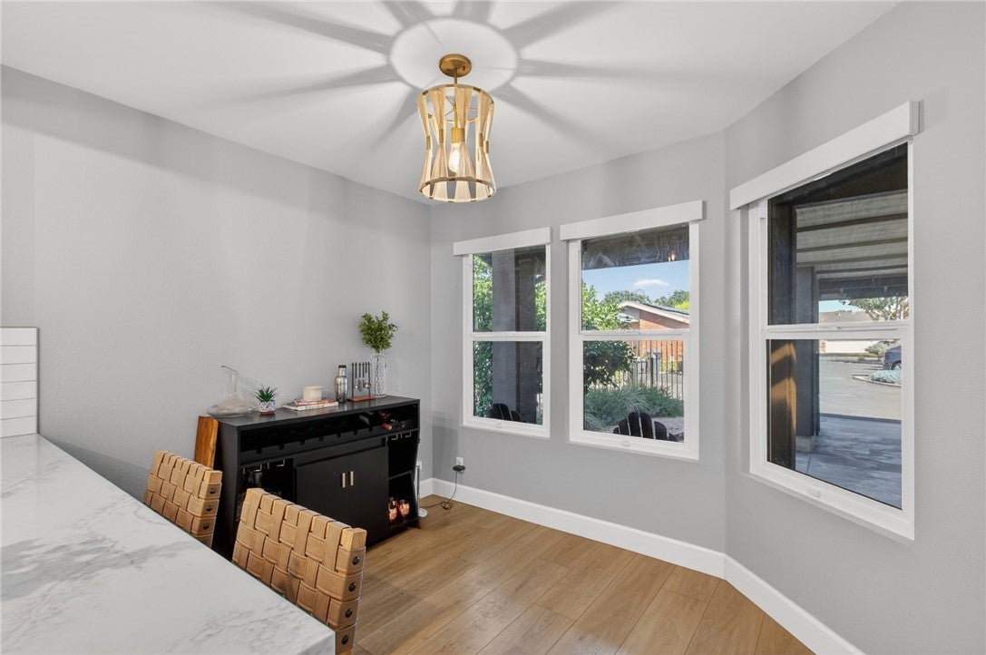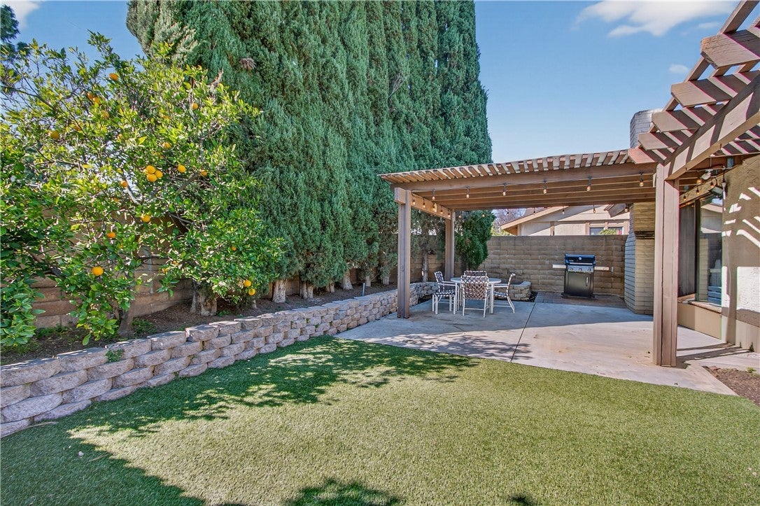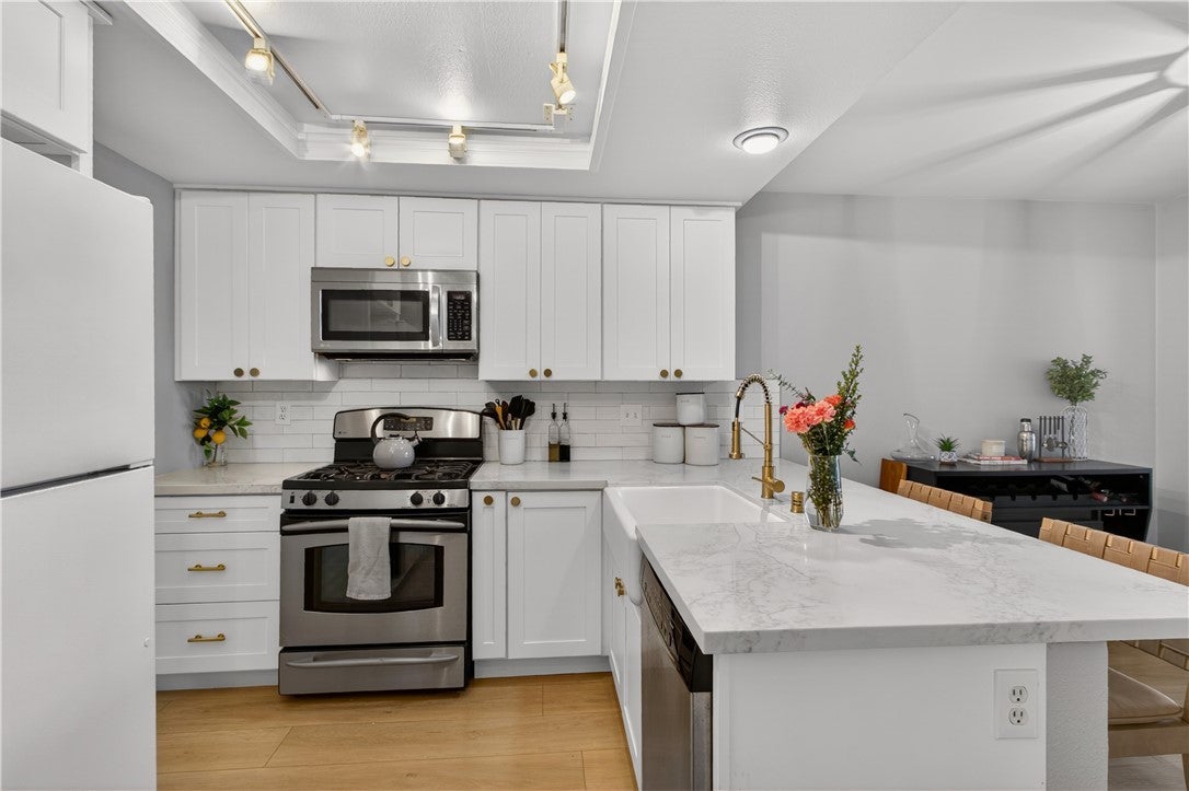 Tustin School District* Single Story* No Common Walls* 2 Car Garage* This home has it all! Enter through your gated courtyard and the impressive double doors reveal a bright and open floorplan with LVP white oak style floors throughout. The kitchen has been remodeled with crisp white cabinetry, quartz counter tops, a breakfast bar and modern details. The stunning primary suite features vaulted ceilings, 2 closets, en-suite bathroom with dual sinks, and separate shower and bathtub. The oversized secondary bedroom has dual closets and close proximity to the second full bathroom. The large living room and dining space flow seamlessly to the outdoor patio and private backyard with mature landscaping and citrus trees. The location within the community can’t be beat with the corner lot and cul-de-sac with ample parking IN ADDITION to your 2 car garage. HOA amenities include a pool, spa, and central grassy area.
