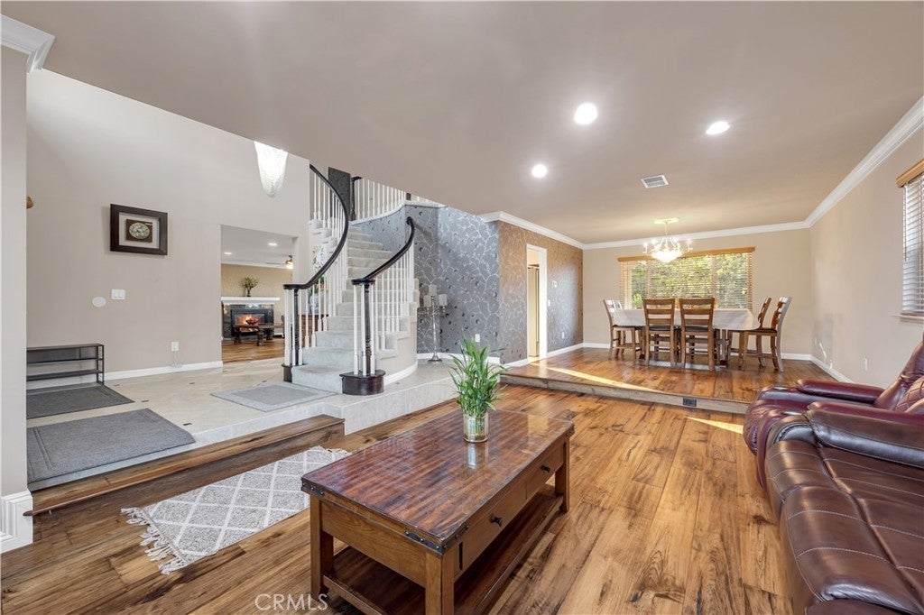 Located in one of the most desirable neighborhoods in Rowland Heights, this hilltop home sits on higher ground and offers nice mountain views. The property is well maintained and move-in ready. Upon entry of the home, you are welcomed by a chandelier and a grand staircase with high vaulted ceilings, creating a bright and open feeling. The home offers 4 bedrooms and 2.5 bathrooms with a spacious floor plan that works well for everyday living and entertaining. The kitchen features black granite countertops, tiled backsplash, and stainless steel appliances. Upstairs, French doors lead to the primary suite with cathedral ceilings, recessed lighting, textured wallpaper, and a bright bathroom with a large soaking tub, separate shower, double vanities, makeup area, and a walk-in closet. Three additional bedrooms are located down the hallway along with a full bathroom with double sinks. The home includes a 3-car garage and a long driveway, providing plenty of parking and storage space. The indoor laundry room is located on the main floor across from the powder room and includes cabinets with space to add a sink. The backyard features a new wood-look aluminum patio that stretches across the yard. The center section is fully covered with a ceiling fan, while the lattice sides allow natural light to come through. The yard is nicely landscaped with a variety of fruit trees. Other upgrades include PEX plumbing, NEW carpet, newer exterior paint, water heater, AC, and furnace. Washer and dryer are included. One of a kind hilltop luxury home with great views in a prime Rowland Heights location.