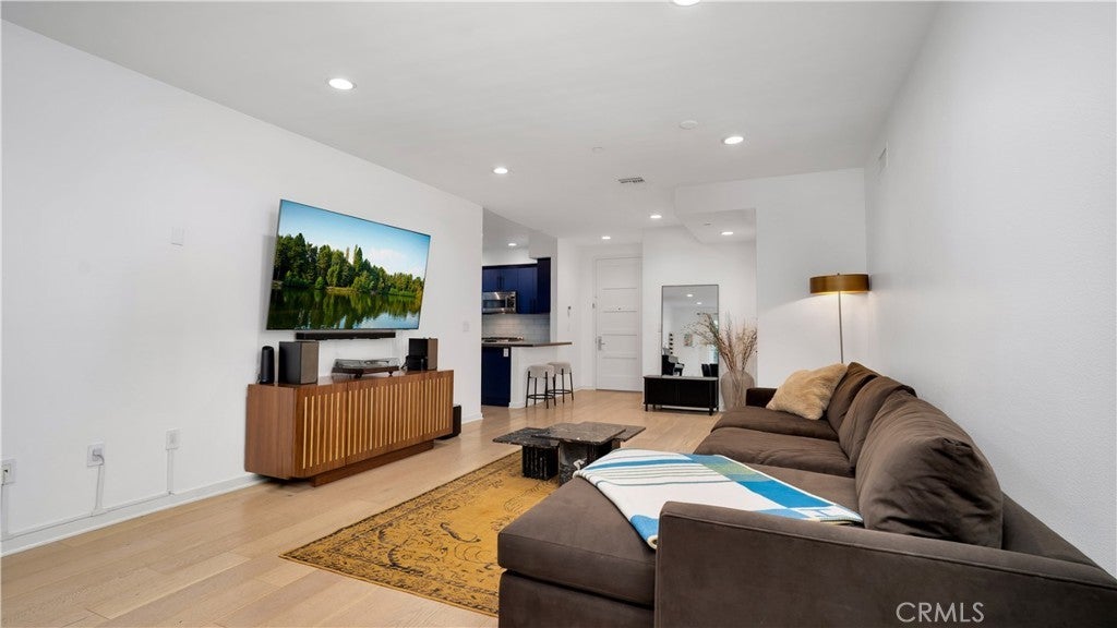 Experience refined contemporary living in this beautifully designed single-level condo within one of the area’s most desirable newer buildings, offering an effortless blend of style, comfort, and city convenience. Featuring three spacious bedrooms and three beautifully appointed bathrooms, the home is filled with natural light and a sense of easy sophistication throughout. Inside, 9-foot ceilings, wide-plank oak flooring, and dual-pane windows create a bright, airy feel. Sleek interior doors with opaque glass, recessed LED lighting, and a thoughtfully designed layout make the space ideal for both daily living and entertaining. The chef’s kitchen pops as you enter the home, showcasing a peninsula shaped seating with Caesarstone countertops, and top-tier GE stainless steel appliances, all flowing seamlessly into a generous family room designed for gathering and unwinding. The primary suite offers a private retreat with a spa-inspired bathroom featuring a soaking tub, glass-enclosed shower with built-in bench, dual vanities, and a walk-in closet. French doors open to a private balcony, perfect for morning coffee or a quiet evening wind-down. A dedicated laundry closet accommodates full-size stackable units for added convenience. The unit already comes pre-installed for EV Charging in the garage! Residents enjoy resort-style amenities including a fully equipped fitness center, resident meeting room, rooftop patio with BBQs and lounge seating, secure bicycle storage, ample guest parking, and a comprehensive security system. Ideally located within the highly sought-after Carpenter Community Charter School District, and just moments from Erewhon, popular cafés, restaurants, shops, major studios, Ventura Boulevard, and the 101 freeway, with easy access over the hill to West Hollywood and Beverly Hills. This is a rare opportunity to enjoy refined living in one of Studio City’s most coveted locations.