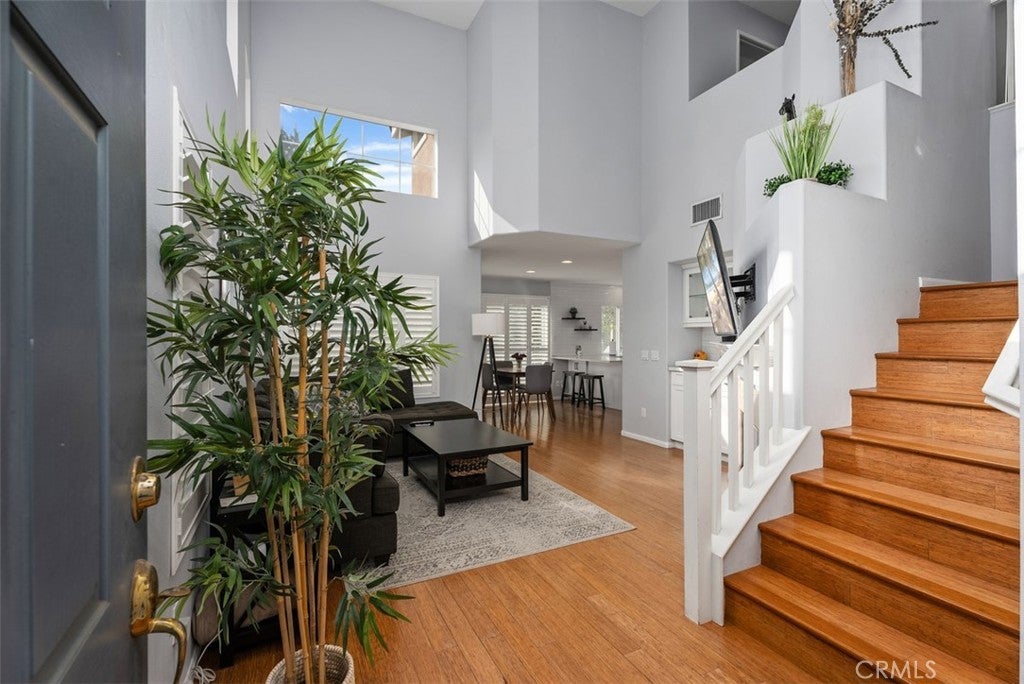 Located on a quiet cul-de-sac in the highly desirable Promenade neighborhood, this beautifully maintained home offers comfort, convenience, and scenic city lights views. Positioned on an elevated lot, the property enjoys added privacy along with a peaceful neighborhood setting just minutes from parks, shopping, and dining. The home features a bright, open floor plan with soaring ceilings and large windows that fill the living spaces with natural light and refreshing cross breezes. The inviting living room centers around a cozy fireplace, creating a warm and welcoming space to relax or entertain. A recently remodeled kitchen serves as the heart of the home, thoughtfully updated with modern finishes and designed to flow seamlessly into the dining and living areas—perfect for everyday living and hosting guests. With 3 bedrooms and 3 full bathrooms, the layout is both versatile and functional. A main-floor bedroom with a full bath offers ideal flexibility for guests, a private home office, or future single-level living. Upstairs you'll find two spacious primary suites, each with its own en-suite bathroom, including one with a walk-in closet. Sliding glass doors open to a wraparound hardscaped backyard where you can unwind while enjoying beautiful city lights views. Additional features include bamboo flooring throughout, central heating and air conditioning, and a direct-access two-car garage conveniently located off the kitchen. The home is located within the boundaries of highly rated Don Juan Avila Elementary and Middle School and Aliso Niguel High School. Residents also enjoy being walking distance to Aliso Viejo Town Center, offering theaters, restaurants, shopping, and entertainment, and just minutes from Laguna Beach. This home offers the ideal combination of location, lifestyle, and modern updates in one of Aliso Viejo’s most sought-after communities. The home is also outfitted with solar panels