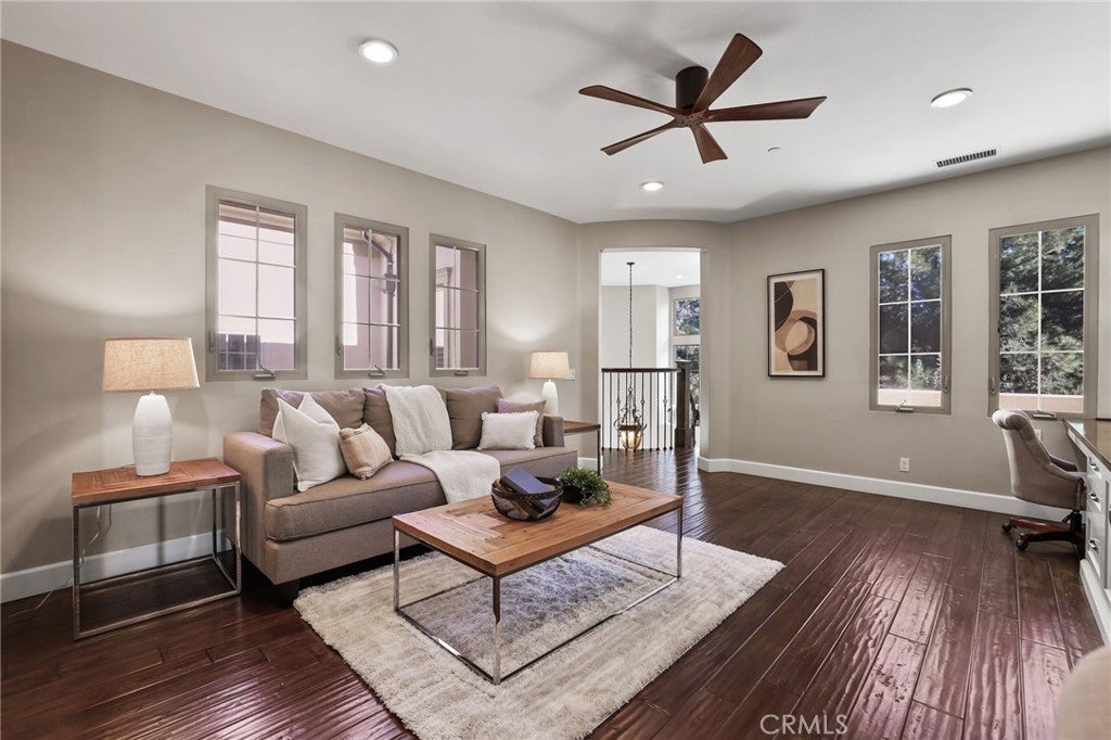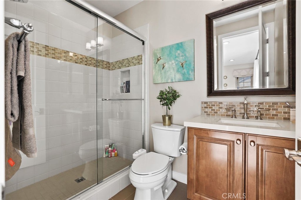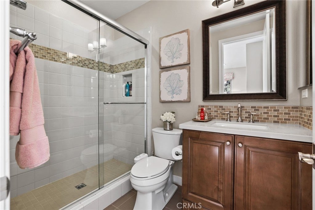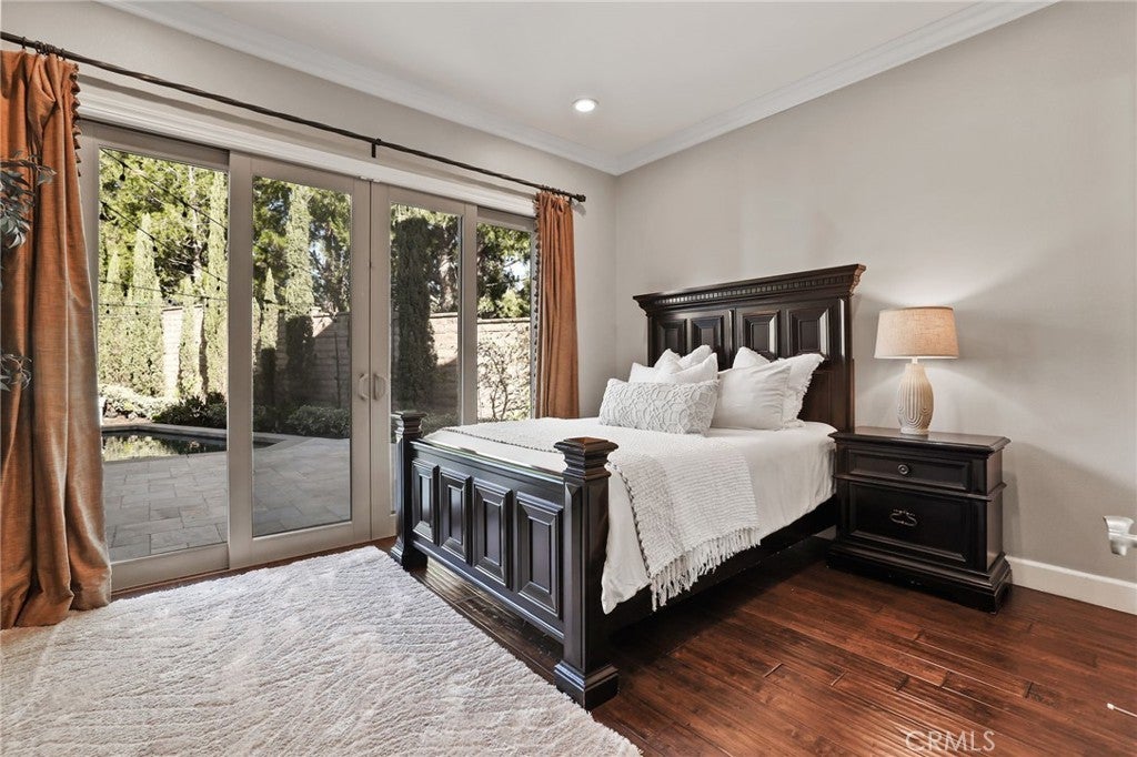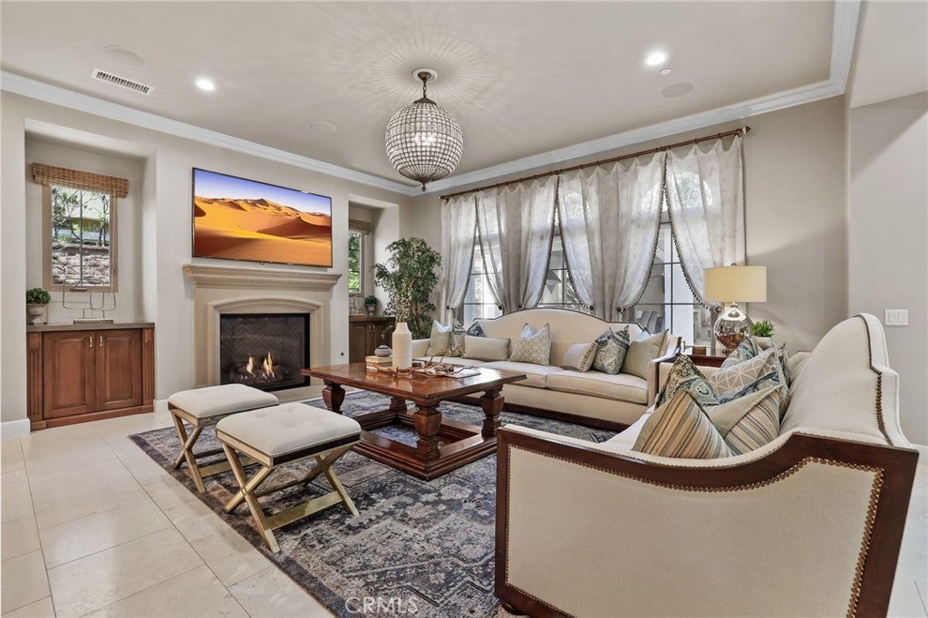 Tucked away on a quiet cul-de-sac, this exceptional Mediterranean-inspired residence blends timeless architecture with refined interiors and true resort-style indoor-outdoor living. A manicured front yard and elegant covered entry lead into a private courtyard, setting an immediate tone of sophistication and privacy. Inside, soaring ceilings, custom columns, crown molding, and abundant recessed lighting enhance the open and airy floor plan. Formal living and dining areas flow effortlessly, offering ideal spaces for both everyday living and elegant entertaining. Durable tile flooring spans the main level, adding warmth, durability, and an elevated sense of luxury. The gourmet kitchen serves as the heart of the home, featuring rich cabinetry, granite countertops, a generous center island with seating, high-end built-in appliances, and designer lighting. It opens seamlessly to a spacious family room with a cozy fireplace, custom built-ins, and expansive windows that fill the space with natural light. The main level offers outstanding flexibility with a private bedroom and en-suite bathroom, ideal for guests or multi-generational living along with a dedicated entertainment or media room and a stylish powder room for added convenience. Upstairs, a spacious loft with built-in cabinetry provides versatile space for a secondary family room, study area, or home office. The luxurious primary suite features a sitting area and spa-inspired bathroom with dual vanities, a soaking tub, and a large walk-in shower. Three additional bedrooms each include private en-suite bathrooms, offering comfort and privacy. Sliding doors create seamless indoor-outdoor flow to beautifully designed exterior spaces. The side yard offers a peaceful retreat with stone hardscape, café lighting, a water feature, and fire pit. The expansive backyard is an entertainer’s dream. A covered California room anchors the space and includes a built-in outdoor kitchen, bar seating, dining area, heaters, ceiling fans, and a cozy fireplace, designed for year-round enjoyment. Beyond, a stunning resort-style salt water pool and spa are surrounded by lush landscaping and dramatic lighting, creating a serene and private oasis. Other features include solar panels owned and paid off and the whole house water softening system. Community amenities include pools, a clubhouse, playgrounds, and sports courts, all within walking distance to shopping and award-winning schools. A truly exceptional place to call home.