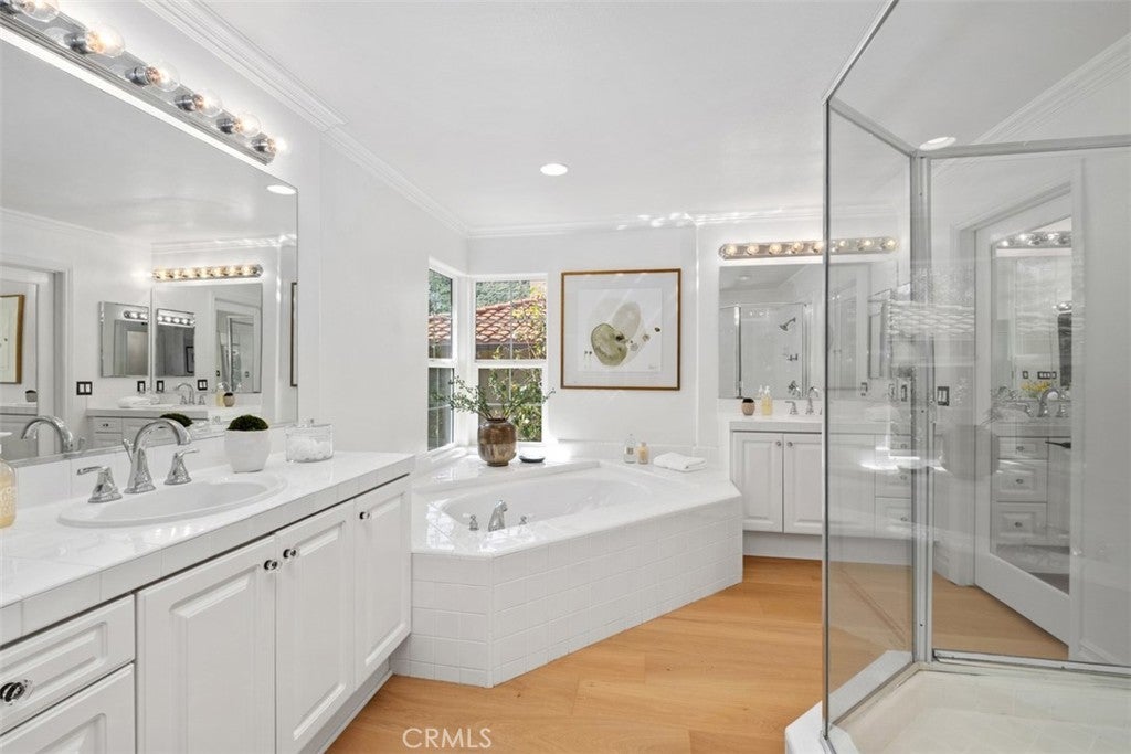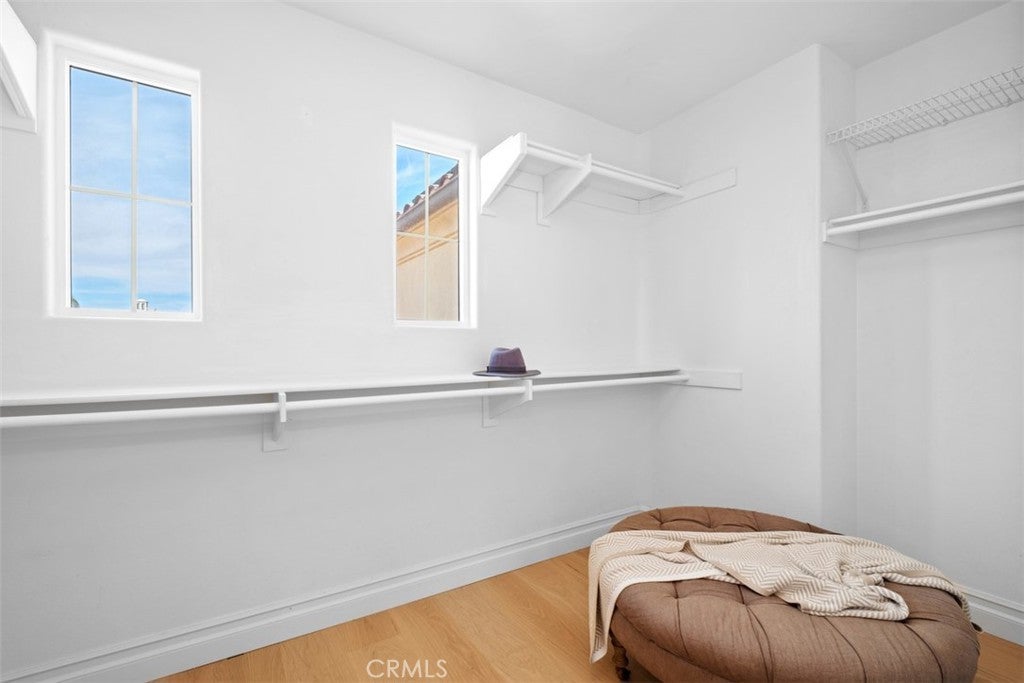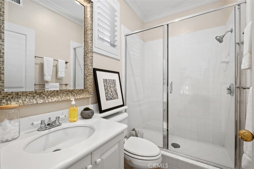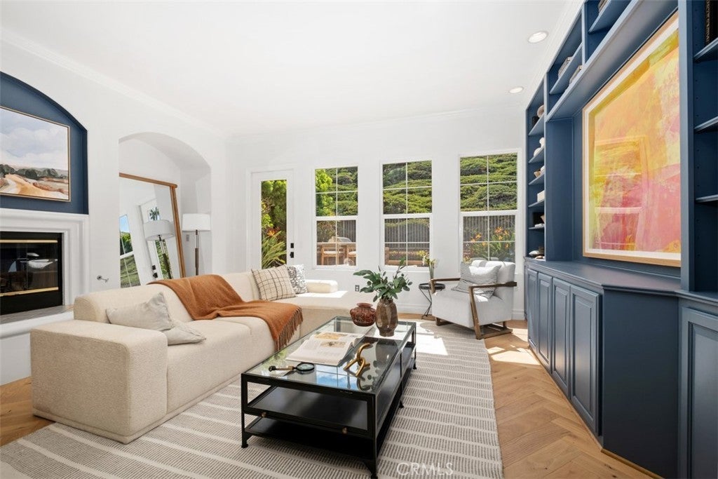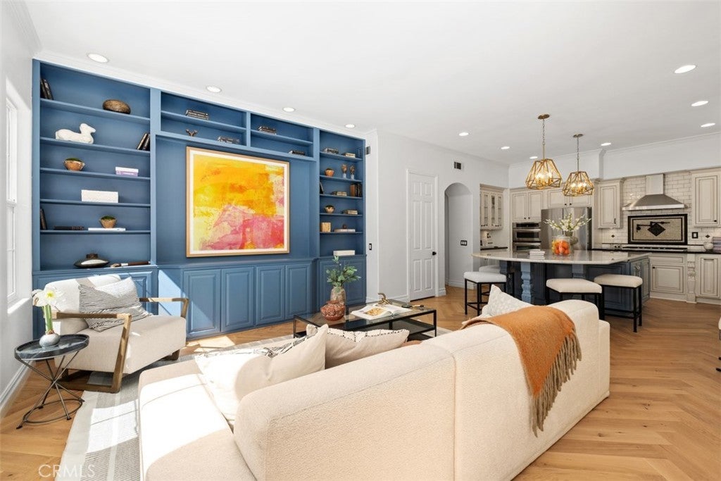 Set on an expansive 10,200 sq. ft. lot within the gated community of San Juan Hills, this beautifully upgraded home showcases peaceful neighborhood and hillside views. Offering 4 bedrooms, 3.5 bathrooms, and a spacious loft, the home provides a versatile layout designed for both comfortable living and entertaining. A grand formal entry welcomes you with soaring ceilings, crown molding, and European White Oak flooring in a classic herringbone pattern. The thoughtfully designed floor plan includes a formal dining room with a butler’s pantry, an inviting family room with a gas fireplace, and multiple French doors that create seamless indoor-outdoor flow. The gourmet kitchen features an open-concept design with a massive quartzite island, and designer details including a pot filler, walk-in pantry, and high-end soft-close cabinetry, all opening to the main living areas. Upstairs includes three bedrooms plus a large loft, while a rare downstairs bedroom with full ensuite bathroom provides ideal accommodations for guests or multigenerational living. The spacious primary suite offers two walk-in closets and a luxurious bath with dual vanities, a dedicated makeup station, soaking tub, and separate shower. Two additional bedrooms share a Jack-and-Jill bathroom. The entertainer’s backyard features professional landscaping, multiple seating areas, a built-in grill, fountains, exterior lighting, and a built-in fireplace—perfect for relaxing evenings outdoors. Additional highlights include paid solar, dual-zone HVAC, plantation shutters, designer recessed lighting, custom built-in cabinetry, a dedicated laundry room, and 2 separate garages, featuring a 2 car garage with built-in storage cabinets and hardwired-Tesla charging station and an additional 1-car garage for extra parking or storage.