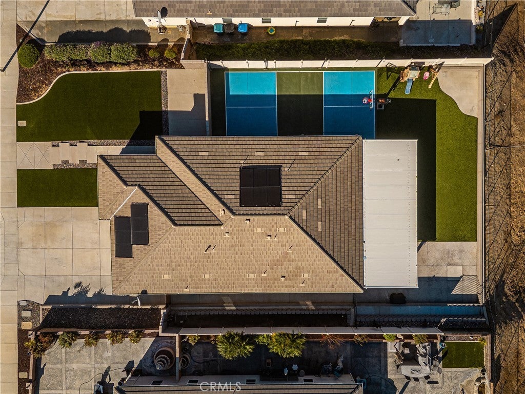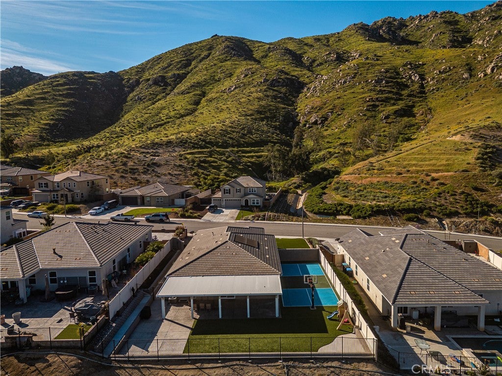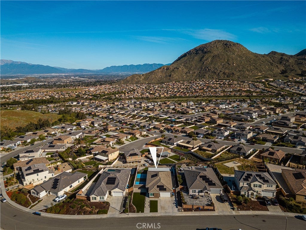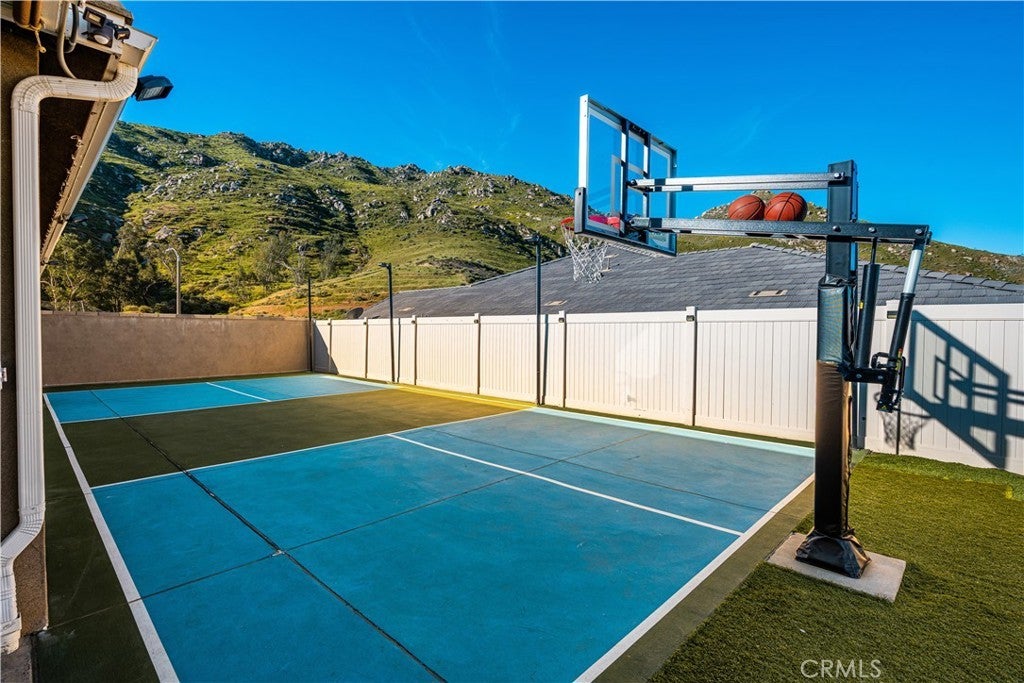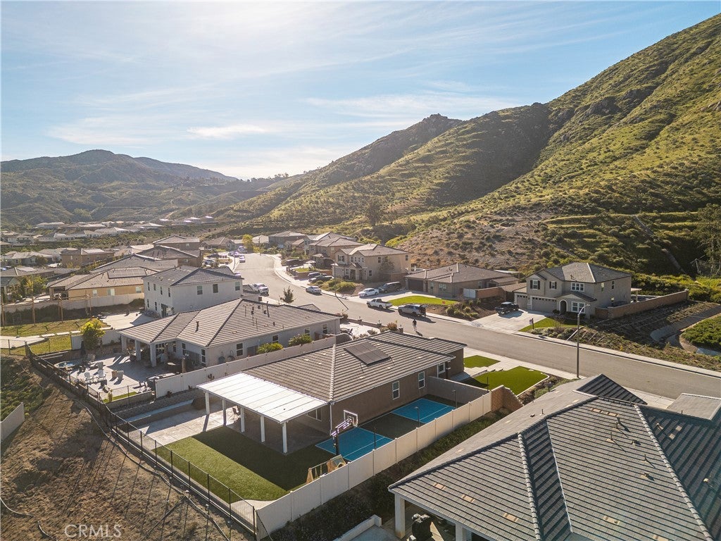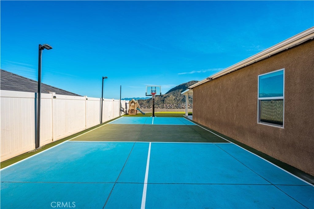 Welcome to 20996 Mountain Gate Drive, a masterfully designed single level VIEW property built in 2020 that perfectly blends modern efficiency with an indoor outdoor lifestyle. Located in the highly desired Spring Mountain Ranch community in Riverside, sitting on over a quarter of an acre of land, this 4 bedroom home is framed by majestic mountain vistas from both the front and the rear. Step inside to discover an airy, open concept floor plan featuring soaring 9 foot ceilings and sleek recessed lighting throughout. The heart of the home is the expansive Great Room, anchored by a dramatic floor to ceiling stack stone surround and a high efficiency electric fireplace. This space flows seamlessly into the backyard, making it an entertainer’s dream. The thoughtful layout provides maximum privacy, with the primary en suite tucked away at the rear of the home. This private retreat features a spacious walk in closet and a remodeled bath complete with a walk in shower and a separate soaking tub. The other three bedrooms and guest bath occupy their own wing at the front of the house. Nearby, the large laundry room offers additional storage and ample space for an extra refrigerator. The backyard is a true private resort. Take in the fabulous 180 degree mountain views with ideal North exposure under your premium Alumawood patio cover, complete with integrated lighting and a ceiling fan. Active living is built in with your very own private pickleball court and a lighted half basketball court. The low maintenance grounds feature high quality turf and stamped concrete, plus a dedicated side yard perfect for starting your own vegetable garden. Enjoy the freedom of no HOA and significantly reduced utility costs thanks to 12 owned solar panels and a tankless water heater. The property also features a wide driveway with excellent potential for RV parking. Located just minutes from Riverside’s best amenities, you’ll enjoy easy access to local favorites like Sycamore Canyon Wilderness Park for hiking and Mount Rubidoux for iconic views. This neighborhood offers the perfect balance of peaceful mountain living with city conveniences just a short drive away. Don’t miss this rare opportunity to own a newer construction, energy efficient gem with some of the best views in the Inland Empire.