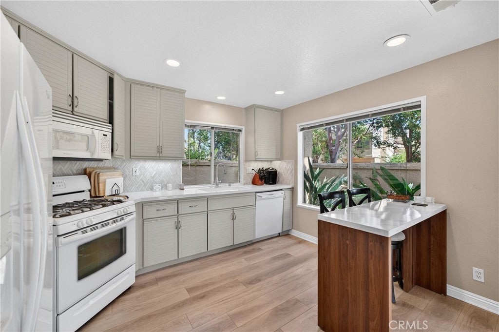 Welcome to 1 Encantado Canyon, a beautifully upgraded single-story end-unit located in the highly sought-after Belterraza community of Rancho Santa Margarita. Ideally situated on the lower level for effortless access, this light-filled residence offers approximately 1,230 square feet of thoughtfully designed living space, blending comfort, functionality, and seamless indoor-outdoor living. Upon entry into an open-concept layout which creates an immediate sense of space and airiness, enhanced by abundant natural light. The main living areas feature luxury vinyl wood-style flooring and are centered around a cozy fireplace, creating a warm and inviting environment ideal for both everyday living and entertaining. The kitchen is tastefully updated with Corian countertops, a modern tile backsplash, and direct access to the expansive wraparound patio—perfect for effortless indoor-outdoor flow. The private, fenced-in yard provides multiple areas to relax, entertain, or enjoy peaceful mornings and evenings. The primary suite offers a tranquil retreat, complete with plush carpeting, dual closets, a beautifully appointed en-suite bathroom, and private patio access highlighted by a mature, fruit-producing lemon tree. A spacious secondary bedroom and full bathroom provide versatility for guests, a home office, or additional living needs. Additional highlights include fresh interior paint, an attached one-car garage with direct access, and a separate detached one-car garage—offering both convenience and valuable additional storage. An interior laundry area further enhances the home’s practicality. Residents benefit from low HOA dues and access to the highly desirable SAMLARC amenities, including resort-style pools, parks, scenic trails, and the exclusive Rancho Santa Margarita Beach Club and Lagoon. Ideally located, the home is also just moments from Tijeras Creek Golf Club, offering easy access to one of the area’s premier golf destinations. Rancho Santa Margarita continues to be recognized for its exceptional quality of life and has been named one of California’s safest cities multiple times, including in 2025—making this an outstanding opportunity to own in one of Orange County’s most desirable communities.