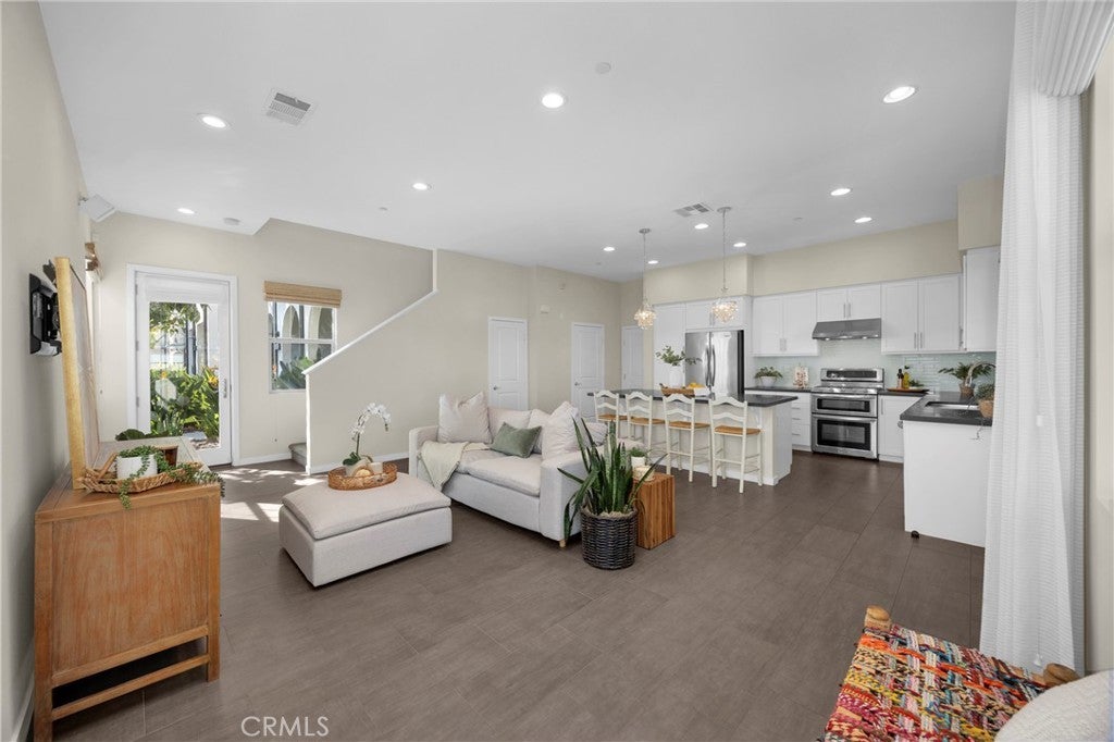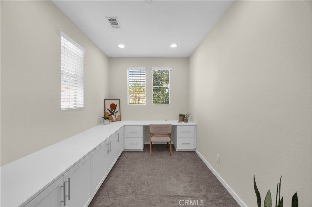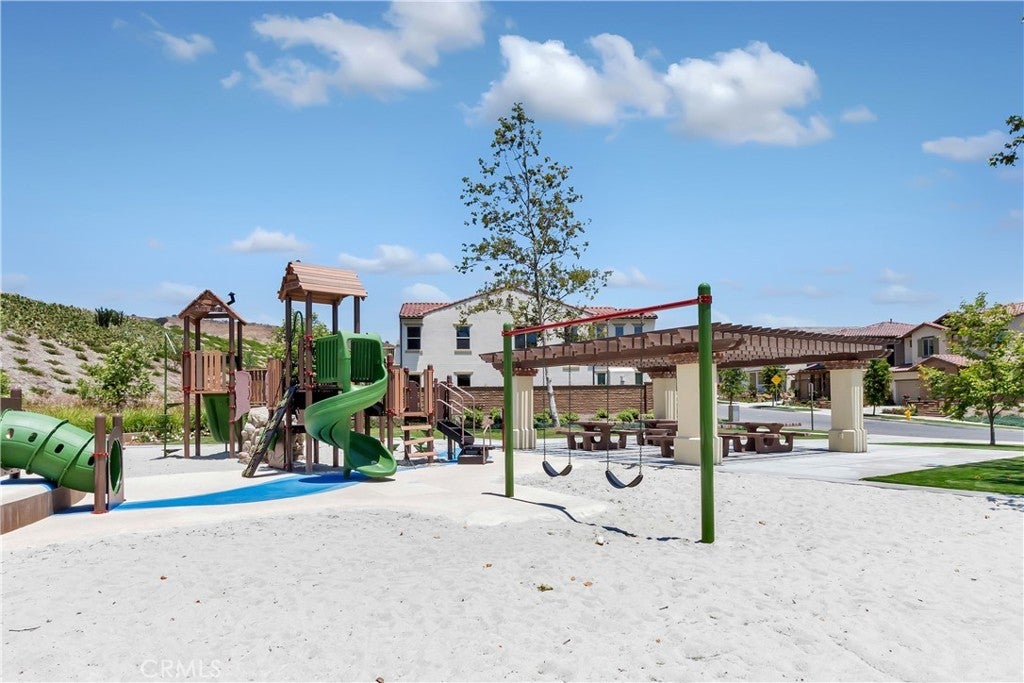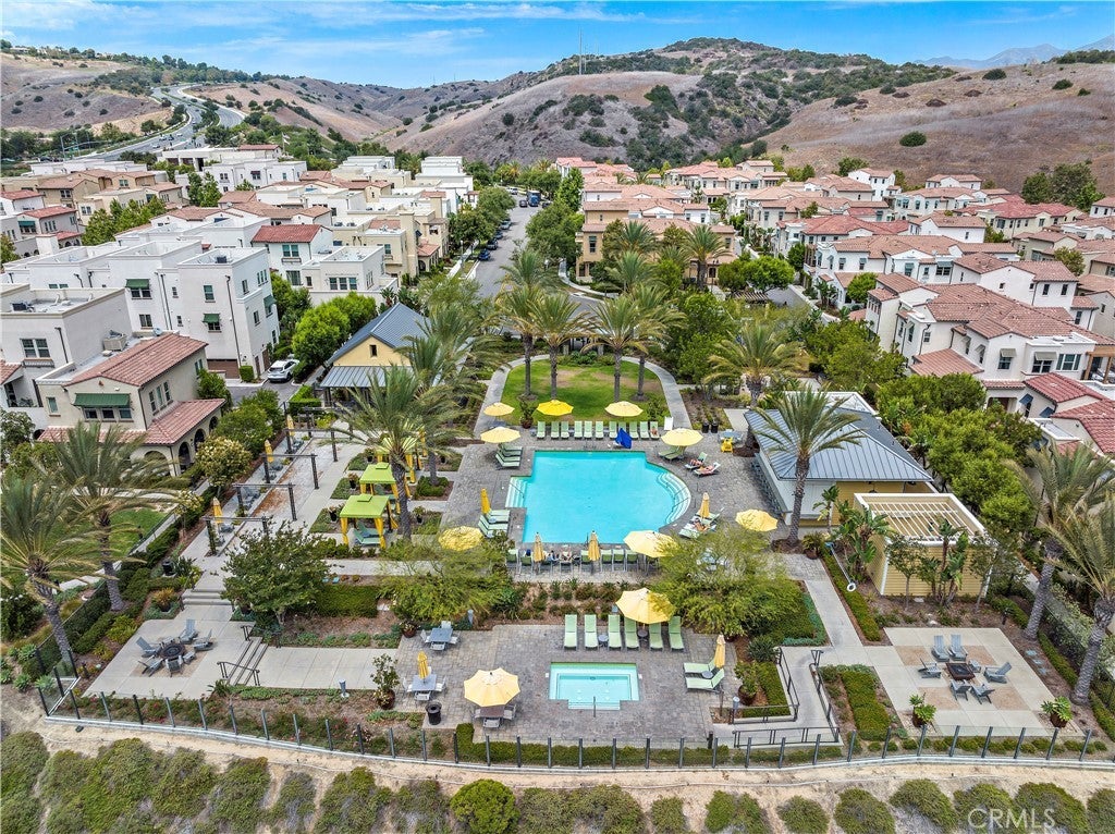 Perched on this elevated location in Sendero Lyon Cabanas, this FORMER MODEL HOME boasts panoramic views of the rolling hills, canyons and peekaboo ocean views allowing for cool breezes and gorgeous sunsets. Only attached on one wall, this 2 story property feels like a single family home. The kitchen includes gray quartz countertops and oversized island with seating for 4, white cabinetry with ample storage, glass subway tile backsplash, beautiful RH Glass pendants and stainless appliances including a 5-burner double oven range and full sized refrigerator. The adjacent great room is bathed in light from all of the windows that showcase the gorgeous view everywhere you look. Also access the large greenbelt in front of the house and take in the sunsets outside the single hung French Door just off the great room. Convenient powder bath with built-in cabinet with quartz counters completes the downstairs. This highly sought after floorplan boasts a spacious master suite with hillside and canyon views, large windows creating a light and airy feel and a large walk-in closet. An ensuite primary bath with dual sinks, quartz counters, custom backsplash and a step in tiled shower complete this primary sanctuary. The second level also features an office with wrap around built-in desk and cabinetry, generous secondary bedroom, secondary bath with quartz counter tops and tub/shower and upstairs laundry with included machines. Easy care oversized tile floors downstairs, plush carpet on the second level, recessed lighting in every room and custom woven grasscloth roman shades create a finished designer look. Attached 2 car garage with custom cabinets, built in workspace and epoxy floors round out this steal of a deal! Step onto the outdoor veranda providing plenty of space to relax, bbq or dine. Steps from the Outpost Pool with resort pool, jacuzzi spa, resort style bar, bocce courts, community clubhouse with full kitchen and BBQ patio. Live the resort lifestyle in this wonderful home with access to walking trails, 8 pools, workout gyms, arcade, firepits and more. Welcome Home!