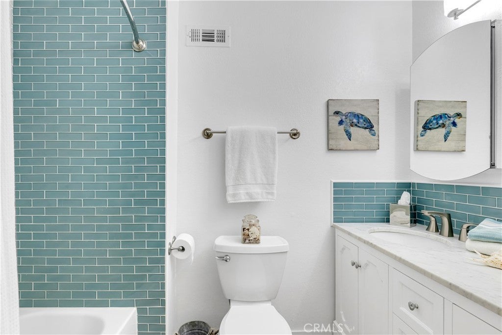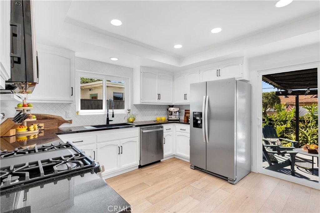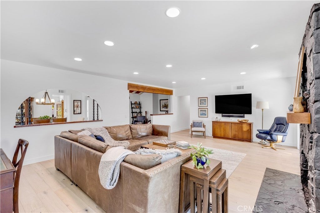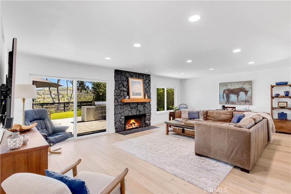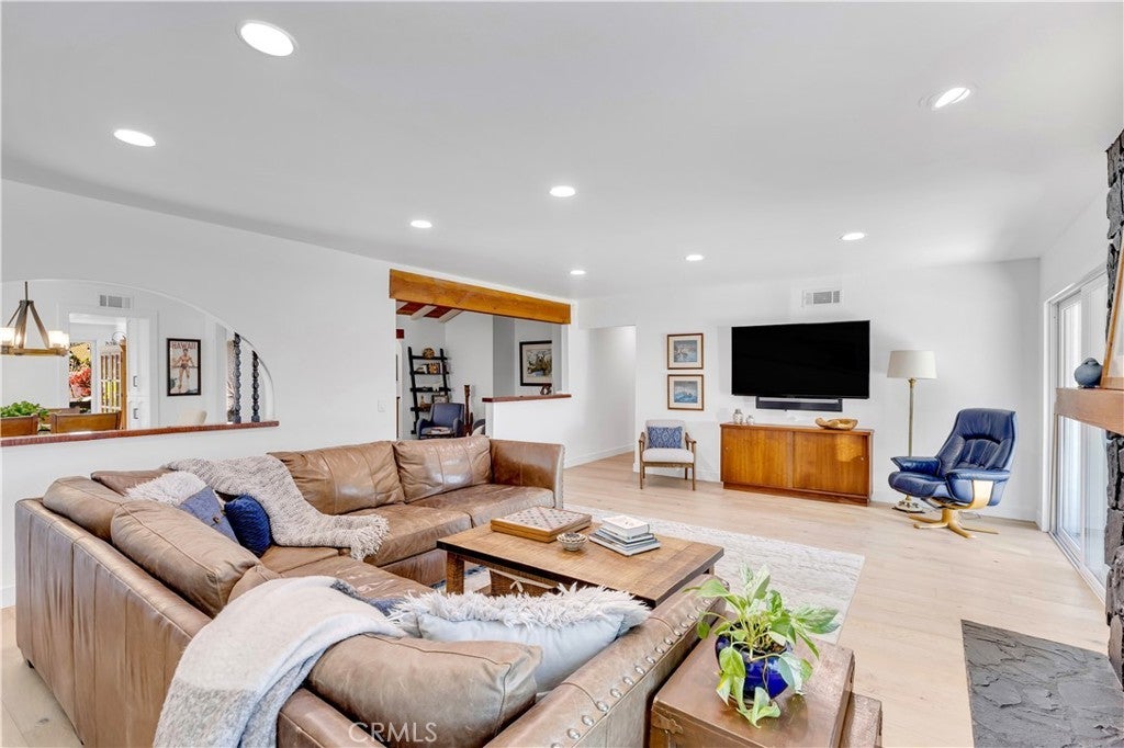 Welcome to your dream single-level mid-century home with a 70’s twist—where style, space, and that unmistakable “let’s have a martini (or mocktail) at sunset” vibe all come together. Set on an expansive 10,065 sq ft lot (rare for the area) this 3 bedroom, 2.5 bathroom home offers approximately 1,951 sq ft of thoughtfully curated living space, all wrapped in effortless coastal energy in one of San Clemente's most desirable areas. Inside, wide plank wood flooring in a soft, beach-inspired finish grounds the space, while curated updates throughout bring a sense of cohesion and ease. The kitchen pairs crisp white cabinetry with solid slab dark stone countertops and a stainless steel appliance suite—both functional and visually striking. Entertaining is elevated here. Designed for both everyday living and entertaining, the oversized dining room is made for dinner parties, while the dedicated bar/lounge room - complete with a plumbed bar and a stunning pitched wood-beamed ceiling - sets the stage for relaxed evenings and unforgettable gatherings. The living room makes a statement of its own, centered around a bold black lava rock fireplace with a custom distressed wood mantle. The primary suite offers a quiet sense of luxury, complete with dual closets, scenic views, and a beautifully remodeled ensuite featuring a soaking tub, step-in shower, and dual vanity. Two additional bedrooms are well-proportioned and share an updated dual-sink hall bath, while a separate powder room adds convenience rarely found in homes of this size. Thoughtful upgrades include new dual-pane windows, a fully updated HVAC system with new ducting and attic insulation, and custom window coverings throughout. Step outside and experience the ultimate backyard setup - complete with new turf and pavers, a pergola with fire table, BBQ bar, spa, and updated fencing with new gates. An outdoor shower adds the perfect coastal touch - ideal for rinsing off after a beach day or surf session. Even the front yard is engaging, with lush landscaping, fruit trees, and a charming seating area under a pergola. With no HOA or Mello Roos, coastal breezes, canyon and Saddleback mountain views, and a location just minutes from the beach and the iconic downtown San Clemente scene, this is more than a home - it’s a lifestyle.