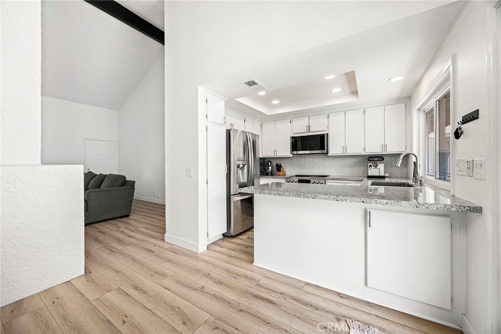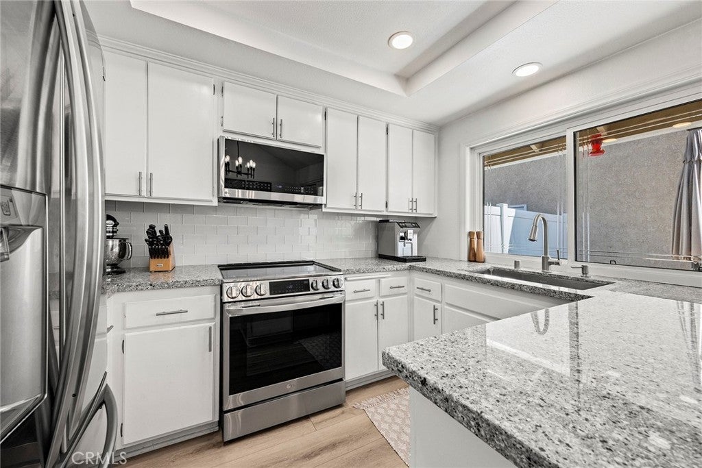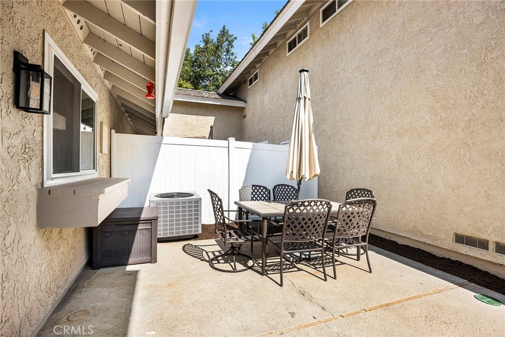 Located at the end of a cul-de-sac in the highly sought-after Rancho Dominguez Townhomes community in Yorba Linda, this fully move-in ready 3-bedroom, 2-bathroom home offers the perfect blend of comfort and convenience. Step inside to a spacious main living area with soaring ceilings that create an open, airy feel. The home features wide-plank luxury vinyl flooring throughout the living, dining, and kitchen areas, along with a beautifully updated kitchen complete with granite countertops and stainless steel appliances. Both bathrooms have been tastefully renovated with modern finishes. This single-level home offers the rare benefit of no interior steps and no unit above. Enjoy a private, enclosed back patio—perfect for relaxing or entertaining—with direct access to the two-car garage, which includes a 220V outlet ready for EV charging. Ideally situated on the northeast corner of the community, the home is just a short walk to amenities including the pool, tennis courts, and playground. Surrounded by lush greenbelt space, the community offers a peaceful, park-like setting. Located within the highly regarded Yorba Linda school district, the home is assigned to Travis Ranch K–8 and Esperanza High School. A wonderful opportunity for anyone from growing families to those looking to downsize without compromise.