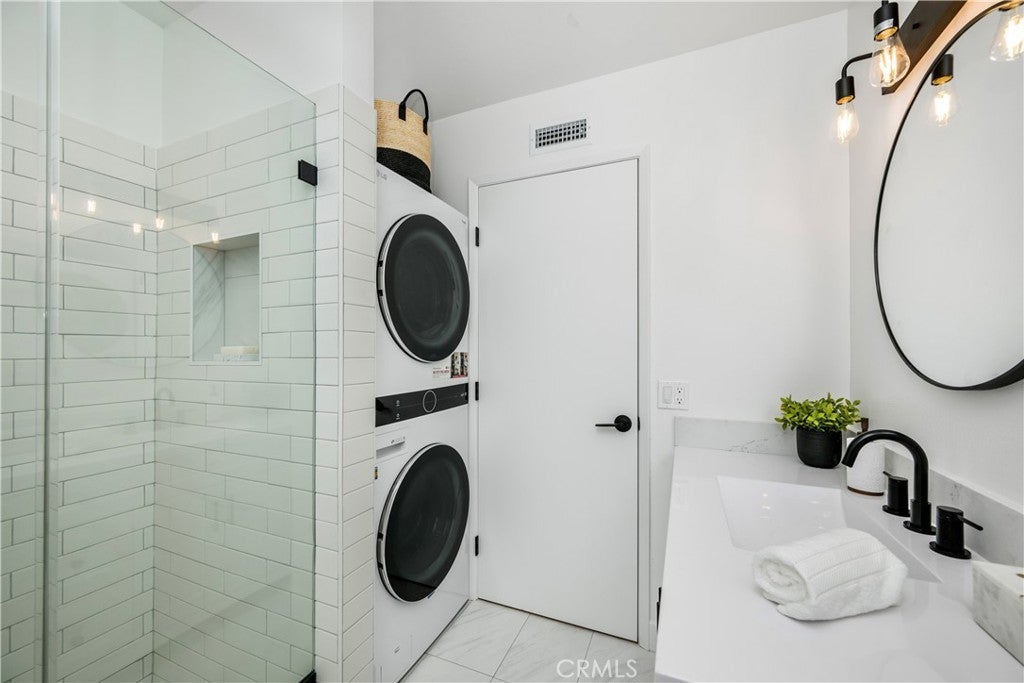 Welcome to this fully and stylishly remodeled 2-bedroom, 2-bath condo in the heart of Tustin. This bright second-floor, single-level condo features an open floor plan with a completely reimagined kitchen, including new cabinets, quartz countertops, an upgraded island with bar seating, and stainless steel appliances. Luxury vinyl plank flooring, recessed lighting, and fresh custom paint flow throughout the space. The primary suite offers a modern en-suite bathroom and a spacious walk-in closet, while the second bedroom is generously sized with a closet. Both bathrooms have been fully renovated with new vanities, a tub and a shower, each showcasing gorgeous soft palette tiles, along with new fixtures and plumbing. Additional upgrades include new double-pane windows, a brand-new HVAC system and an in-unit washer and dryer for added convenience. Enjoy three parking spaces, a shared garage with shelving, an assigned spot, and an unassigned space with a parking pass. The Williamshire community provides resort-style amenities including a pool, spa, clubhouse, and gym. Located within the award-winning Tustin Unified School District one of the best in the nation. This home combines style, comfort, and top-tier education. Centrally located near South Coast Plaza, Old Town Tustin, Irvine Spectrum Center, Laguna Beach, and Newport Beach, with easy access to freeways, dining, and attractions like Disneyland resort.
