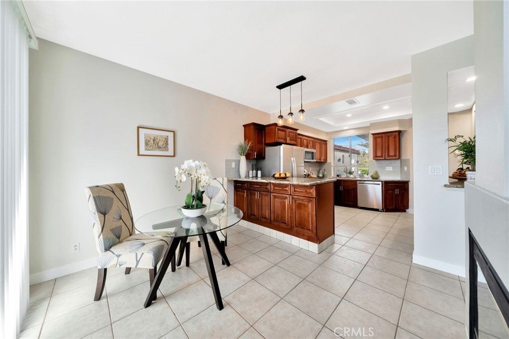 Welcome to your dream home! This beautiful two-story townhome is nestled in Rancho Santa Margarita; a vibrant community rated the safest city in California. 1,644 square foot layout with 3 spacious bedrooms and 2.5 updated bathrooms. Ideal, end of cul-de-sac location, with serene canyon views. The reimagined kitchen has been expanded and opened to adjoining living and dining rooms, enhancing a very comfortable living space. Features include granite counters, updated backsplash, stainless steel appliances (range and refrigerator are new), breakfast nook, and recessed lighting. The spacious dining and living rooms transition seamlessly and feature a cozy two-way fireplace (opposite side is in the breakfast nook). Two large sliding glass doors provide plenty of natural light, and open to a large back patio. The added outdoor space is perfect for larger gatherings (or just enjoying the environment). Upstairs: The large master suite features a sliding glass door (with canyon and sunrise views), balcony, and walk-in closet. The en-suite bathroom includes new garden tub with tile surround (and shampoo niche), new quartz counters, lighting, and plumbing fixtures. The hall bathroom has also been updated with new tub / shower surround, vanity, and plumbing fixtures. The 2nd and 3rd bedrooms provide ample room for queen beds and plenty of closet space. Hard surface flooring throughout, with tile downstairs and attractive luxury vinyl plank floors on the stairs and 2nd floor. In addition to the Candelero pool, your SAMLARC membership includes access to all the city-wide amenities, such as: multiple swimming pools, the Beach Club w/ sand bottom swimming lagoon, basketball, tennis, pickleball, and volleyball courts, clubhouse, parks, and fishing. Other local features: great schools, a skate park, dog park, miles of hiking & biking trails, and the Tijeras Creek golf course. Low property taxes (approximately 1.02%) Welcome to Rancho Santa Margarita, a great place to live!