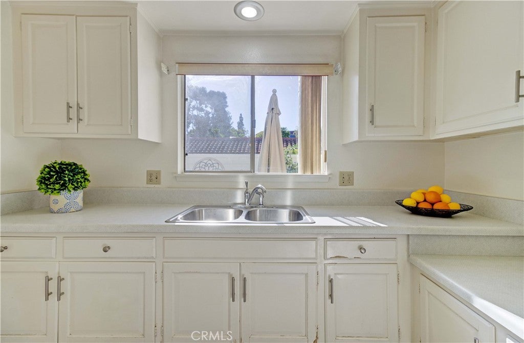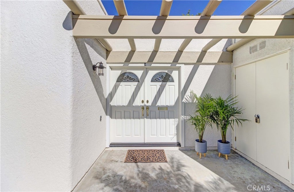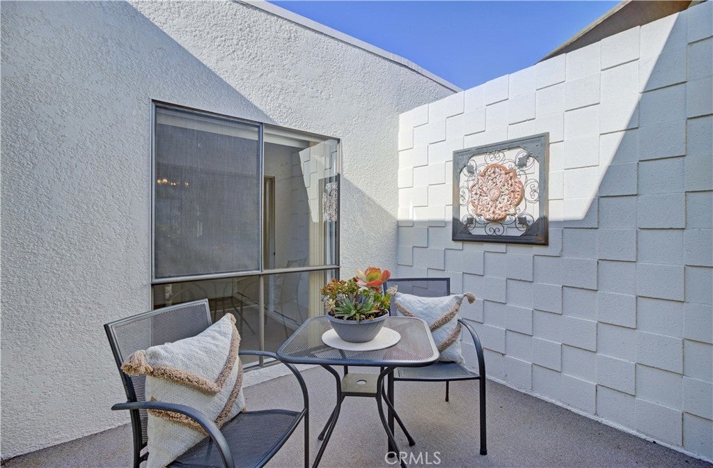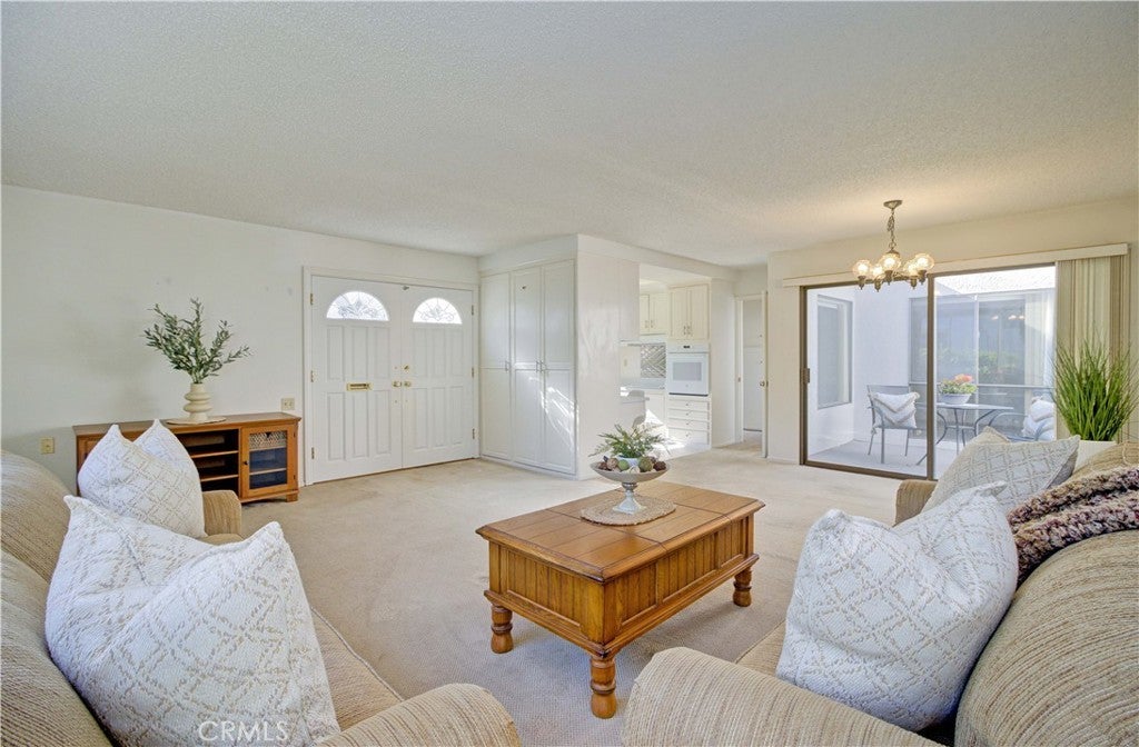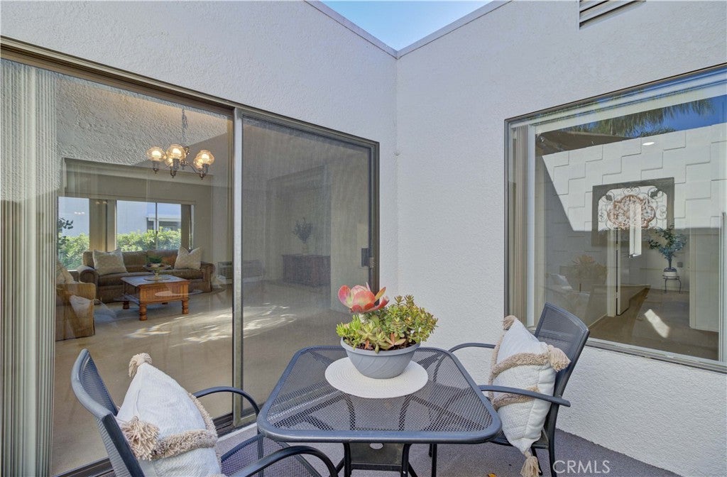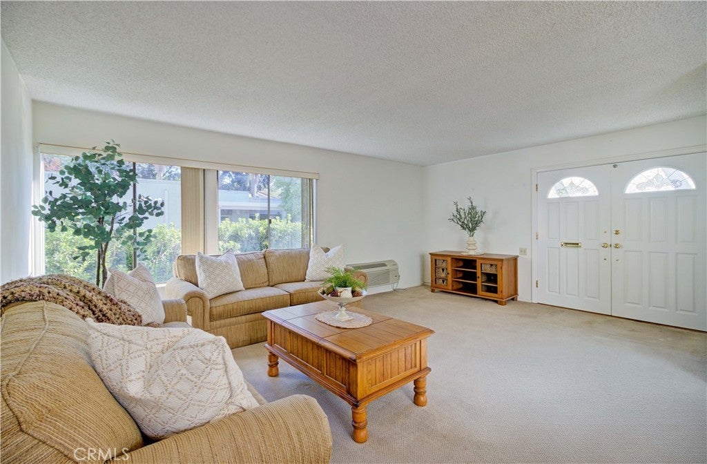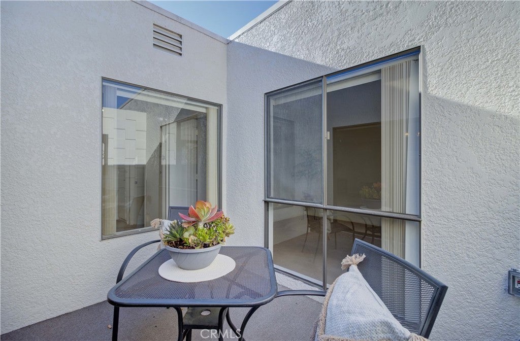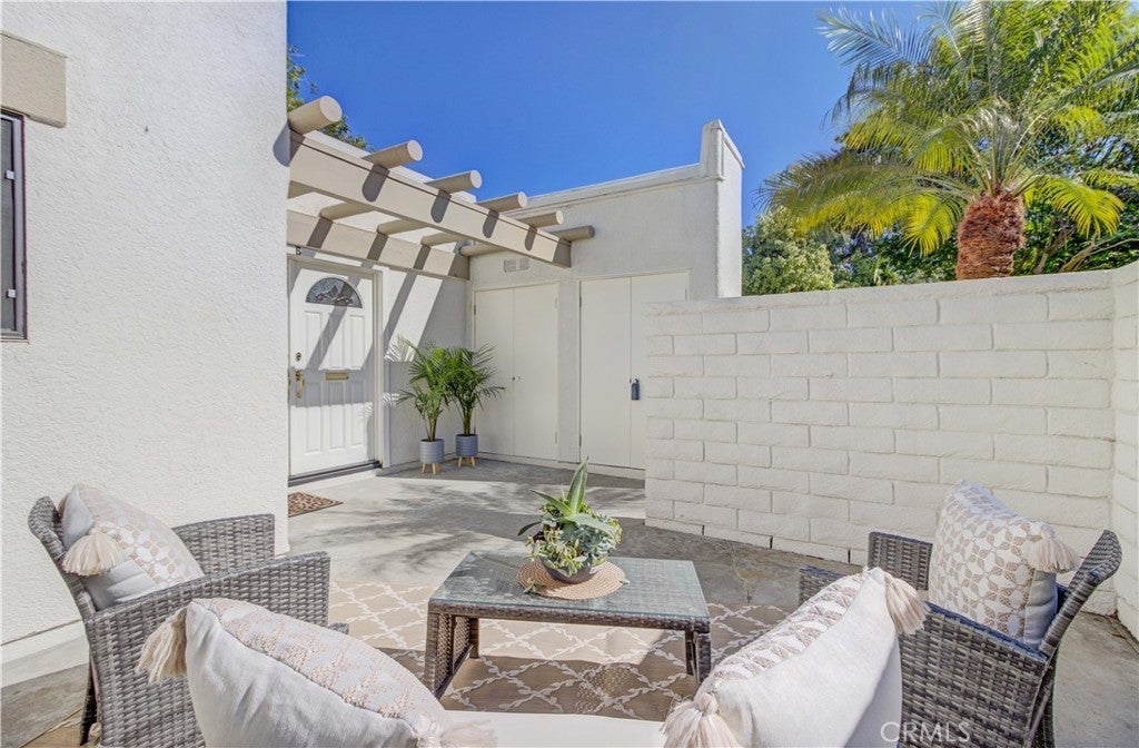 Bright and sunny southwest facing "Valencia" cottage - no steps, no one above or below. This popular patio home features a large, private front patio area with 2 spacious storage closets and adobe style beams over the front door. Upgraded double door entry with half moon windows provides extra light. Inside, you'll find a mostly original co-op recently upgraded by the HOA with countertops, fixtures and flooring in both kitchen and bathroom. Spacious living room area has wall heat pump and large south facing window. Adjacent is the dining area and atrium, the atrium supplies morning light and air flow for 3 areas - dining, hallway and guest bedroom. Kitchen features white appliances maintained by the HOA and window over the sink looking out to the front patio. Both bedrooms enjoy ample closet space and windows looking into private patio areas - no sidewalks. Large bathroom houses dual sink vanity, tub/shower combo + additional walk-in shower. STACK WASHER/DRYER in hallway closet! Carport is close, easy access to gates and shopping and Clubhouse 4 - the arts and crafts center for Laguna Woods with workshops and classes to enjoy plus lap swimming pool. Residents enjoy access to an unparalleled array of amenities, including championship and executive golf courses, multiple swimming pools, fitness centers, pickleball and tennis courts, lawn bowling, equestrian facilities, gardening centers, art studios, computer labs, classes, and over 200 clubs and social organizations. HOA LANDSCAPING IN PROCESS