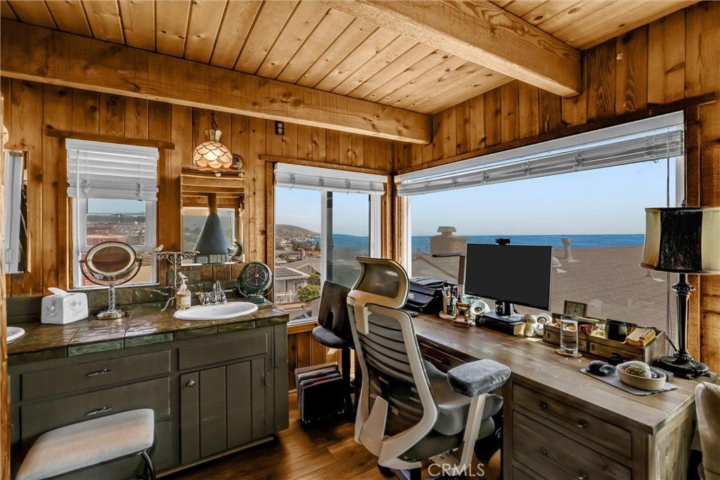 Beamed Ceilings, Wet Bar, Multiple Staircases, Wood Product Walls, Wine Cellar
