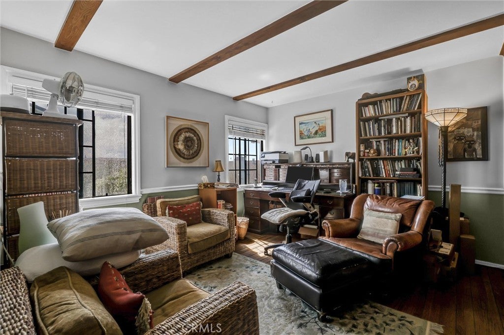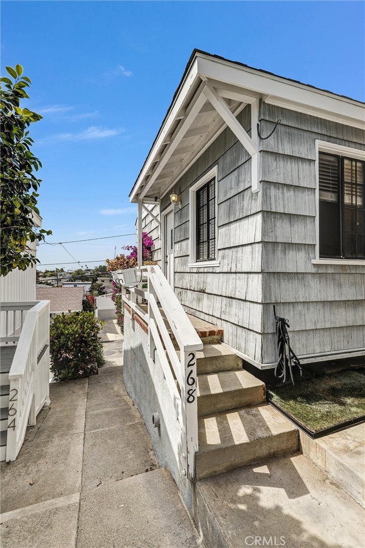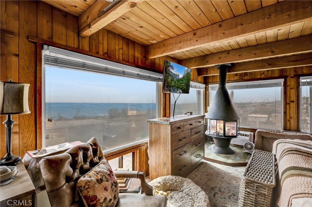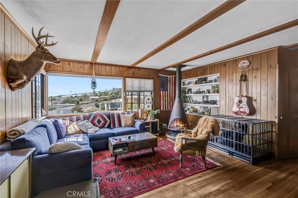 Situated on a 4,500 square foot hilltop lot, this residence offers exceptional views of the Pacific coastline and over 3,100 square feet of total living space. The main residence spans over 2,300 square feet across three levels and includes three bedrooms and two bathrooms. The interior features a spacious living room with a fireplace and open beam ceilings. Additional amenities include a walk-in sauna, an in-ground spa, and a den equipped with a solid oak bar and wine locker. The entire top floor is dedicated to a master suite featuring a private bathroom and walk-in closet. The property also includes a 700+ square foot rear apartment. This two-bedroom, one-bathroom unit offers a large living room with a fireplace and views of both the ocean and Catalina Island. Parking and utility features include a three-car garage with laundry facilities for the rear unit. Adjacent to the garage is an additional "bachelor" unit with a private bathroom, which has historically been reserved for personal use.