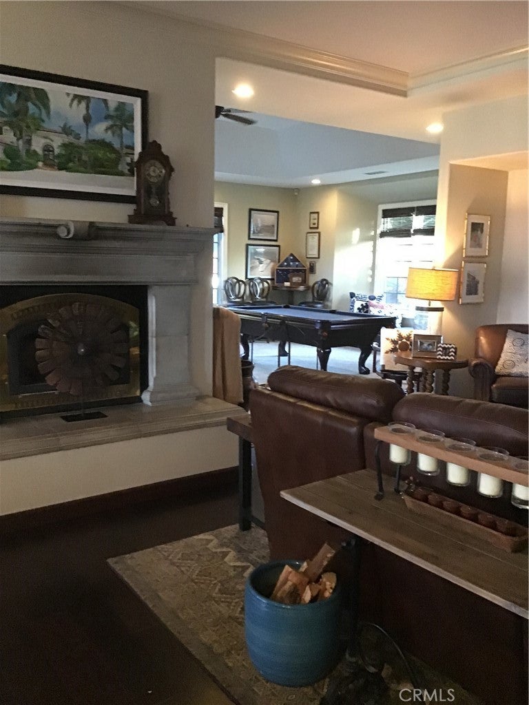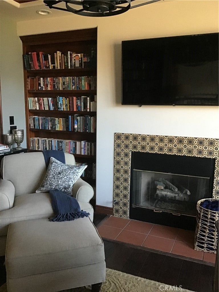 Family Room, Gas, Primary Bedroom, Multi-Sided, Outside, Raised Hearth, Wood Burning, Library