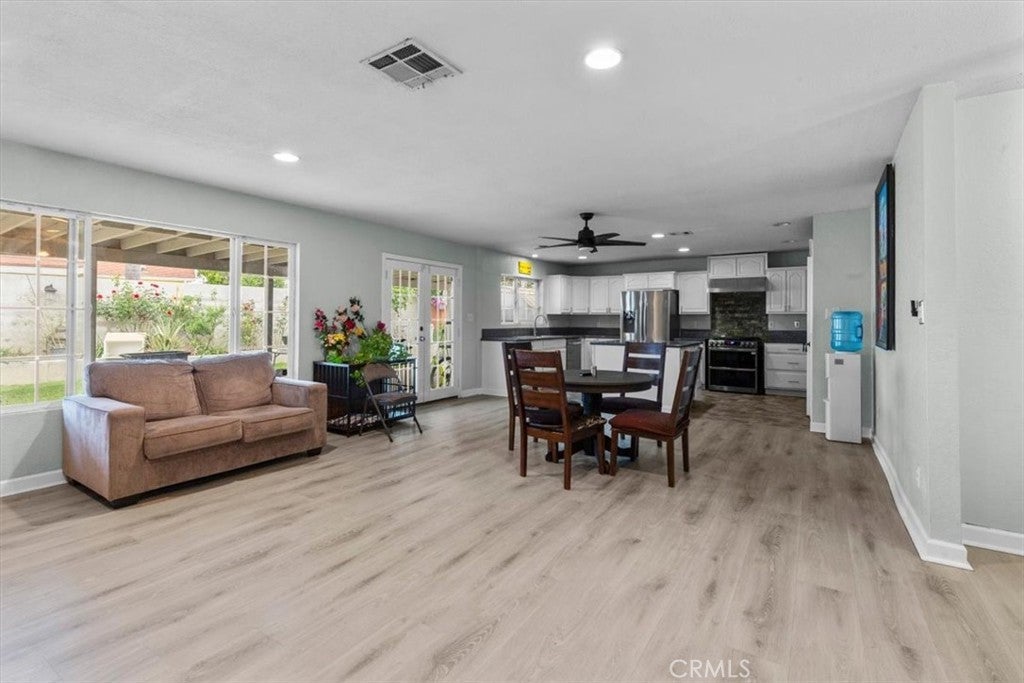 Tucked away on a quiet cul-de-sac in a desirable residential neighborhood, this 3-bedroom, 2-bath home offers a great opportunity with solid features and added improvements throughout. The living room showcases a beautiful stone fireplace, while the kitchen offers a functional layout with a spacious island, ideal for everyday living and entertaining. The home features an open layout, recessed lighting, and a mix of upgraded elements that provide a strong foundation for a buyer to make it their own. Recent exterior improvements include a rebuilt patio roof and upgraded rain gutters (2024), along with a permitted privacy wall added in 2023. A custom wooden gate separates the backyard into two distinct areas, offering added flexibility and use of space. The backyard is spacious with a covered patio, perfect for outdoor use and entertaining. With its location, layout, and added features, this home presents a fantastic opportunity for buyers looking to personalize and add value.