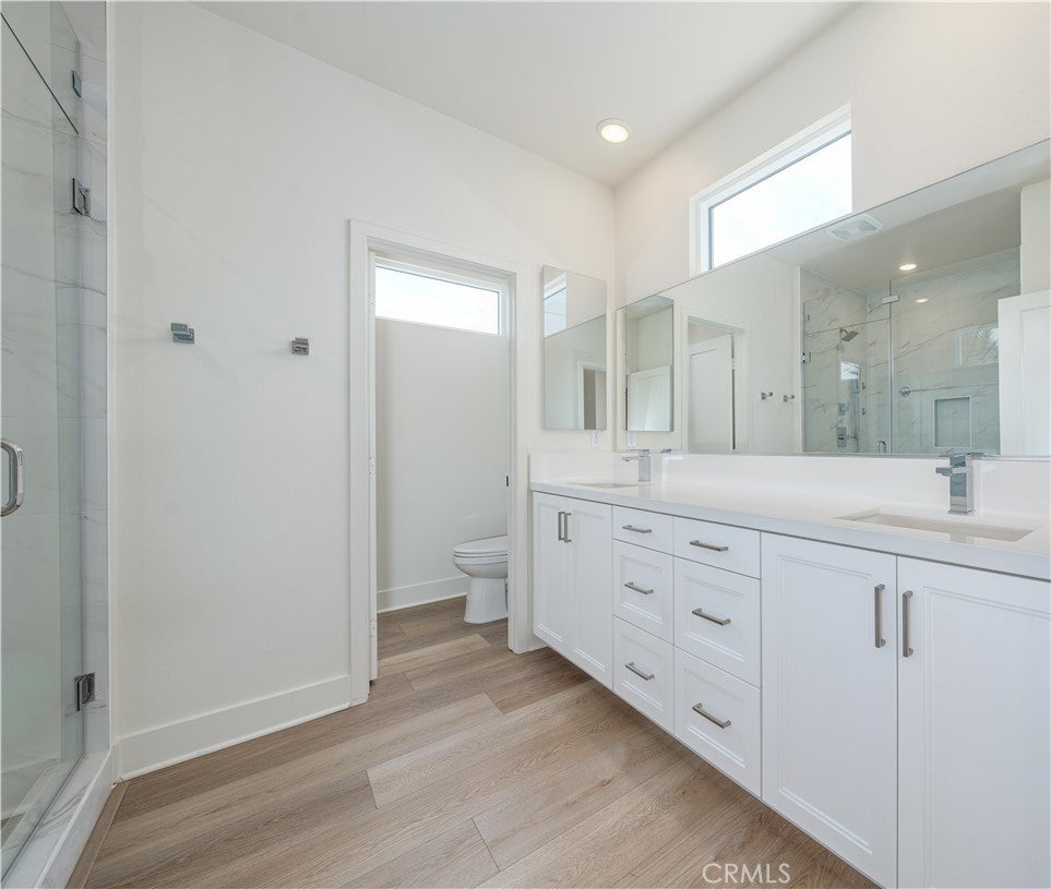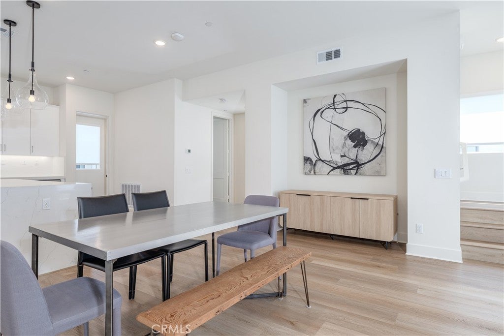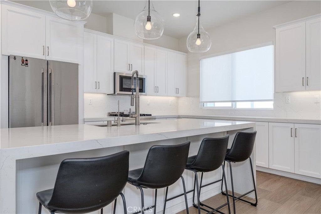 Welcome to the Luna at The Landing community, where unparalleled design harmonizes with upscale living upgrades to create a truly remarkable home. This stunning 4-bedroom, 3.5-bathroom residence offers three thoughtfully designed levels of luxurious living space. As you step into the first level, you're welcomed by a beautifully appointed main floor bedroom that boasts an ensuite bathroom and a spacious walk-in closet. This level also features a convenient 2-car attached garage with storage options to keep your living space organized. Ascend to the second level, and you'll find a living area that exudes modern sophistication. The gourmet kitchen serves as the heart of this home, showcasing European-style cabinetry with sleek shaker-style doors, adjustable shelving with LED cabinet lighting, and luxurious quartz countertops with a custom backsplash. Gather around the waterfall kitchen island and enjoy the convenience of a spacious walk-in storage pantry. This level also features an expansive great room and dining area designed for effortless entertaining, along with a half bathroom and a private deck for unwinding from the day. The third level offers a tranquil sanctuary, highlighted by a sumptuous primary bedroom that boasts an ensuite bathroom featuring dual sinks and a luxurious walk-in shower. A large walk-in closet provides ample space for all your wardrobe needs. In addition, two well-appointed bedrooms and a stylish full bathroom, along with a laundry room, complete this floor. Other exquisite upgrades include LVP flooring, high-end Jenn Air appliances—including a dishwasher, range, and beverage fridge—and cabinets throughout with upgraded hardware, including soft-close doors & drawers, designer window shades, epoxy flooring in the garage and a water softener system. Designed with both technology and energy efficiency in mind, this home features LED lighting throughout, high-speed data connections, a smart thermostat, pre-plumbing for electric vehicle charging, and a paid-off solar system. The community itself offers an array of amenities, including a sparkling pool and spa with a relaxing lounging area, basketball and pickleball courts, a clubhouse for gatherings, and a dog run for your furry companions. All of this is conveniently located near picturesque community parks and scenic trails, with easy access to The District shopping center, Whole Foods, UCI, John Wayne Airport, major freeways, and the highly rated Tustin Unified School District.