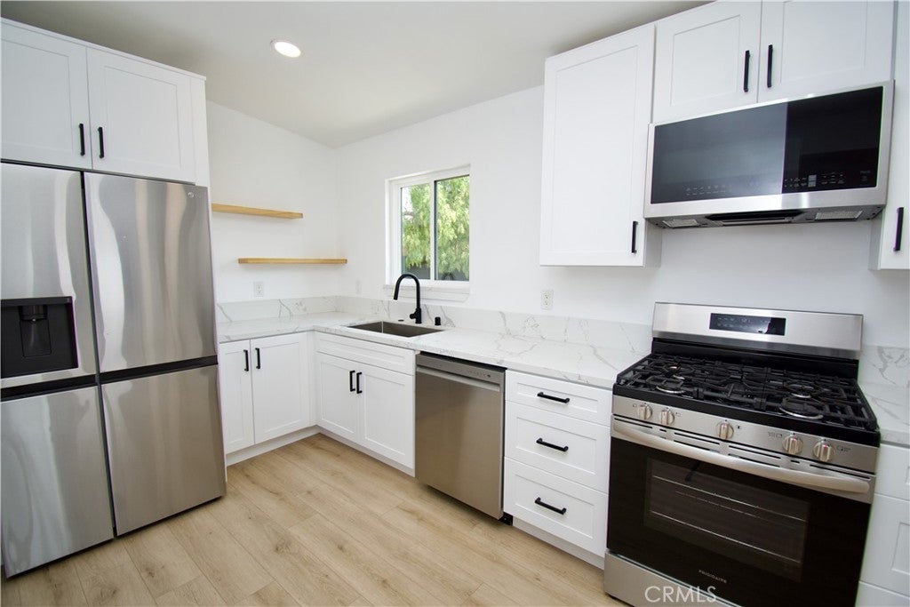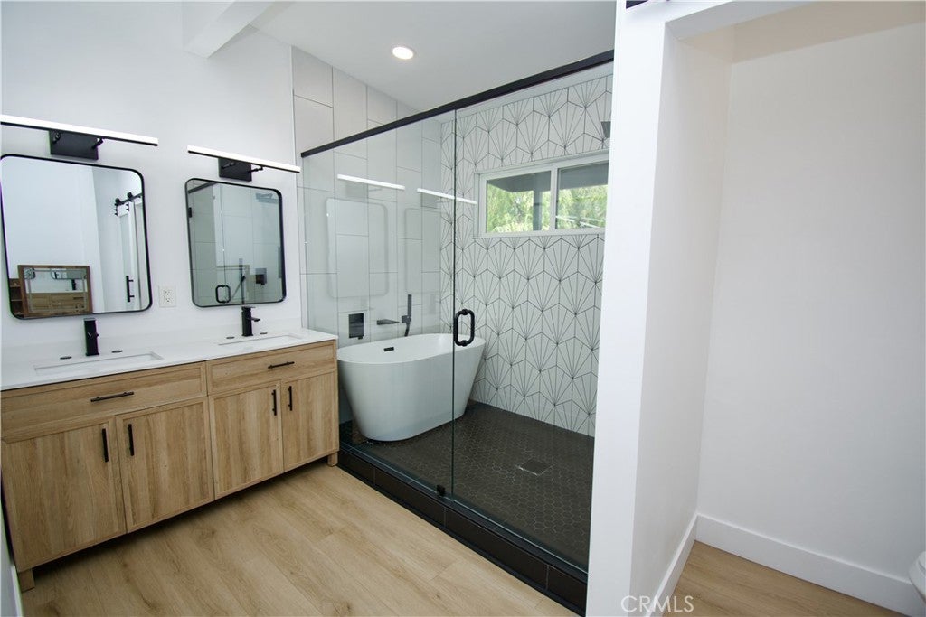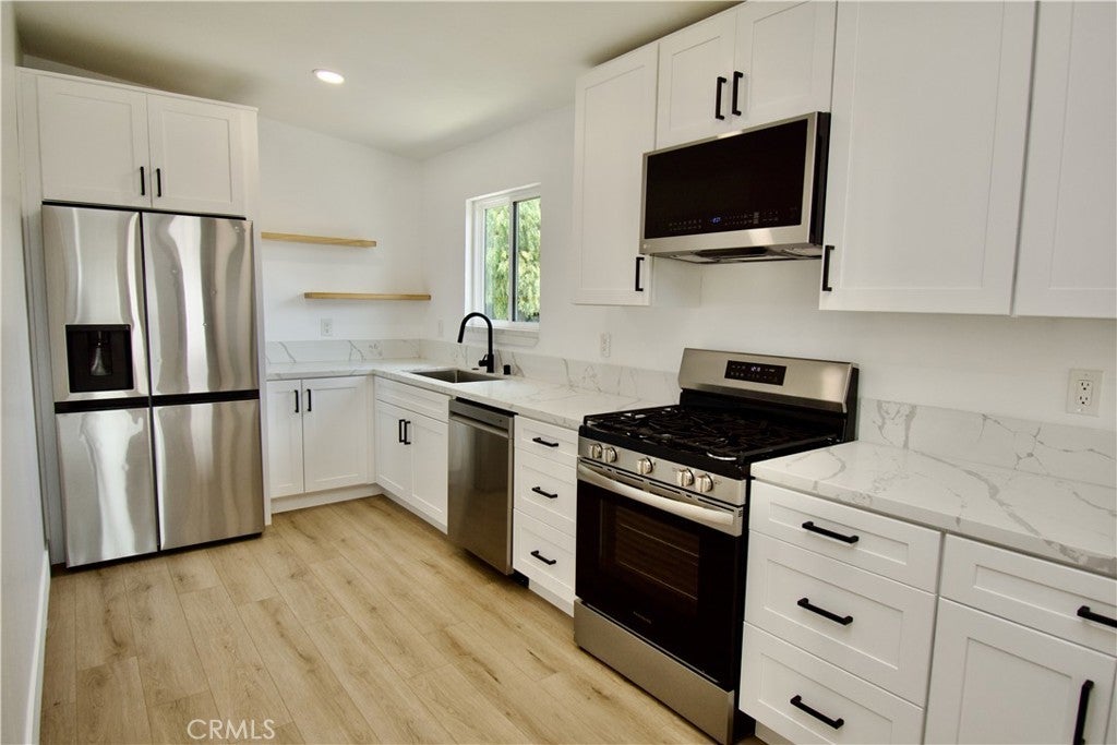 This updated single-story 3-bedroom, 2-bath home offers a bright, open layout with wide plank flooring throughout and a clean, modern feel. The remodeled kitchen features new cabinetry, quartz countertops, and stainless steel appliances, opening seamlessly to the main living area. Both bathrooms have been thoughtfully upgraded with contemporary finishes, including a sleek walk-in shower and a soaking tub. Outside, a large backyard provides plenty of space for relaxing or entertaining, while the home’s fresh curb appeal creates a welcoming first impression. This is a move-in ready home with style, comfort, and room to enjoy. Pets considered on a Case by Case Bases