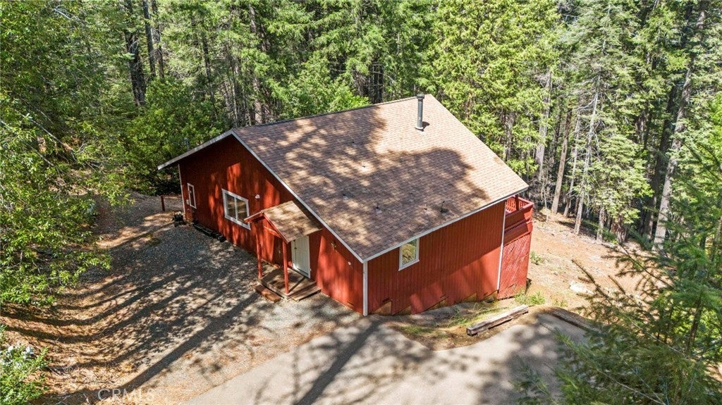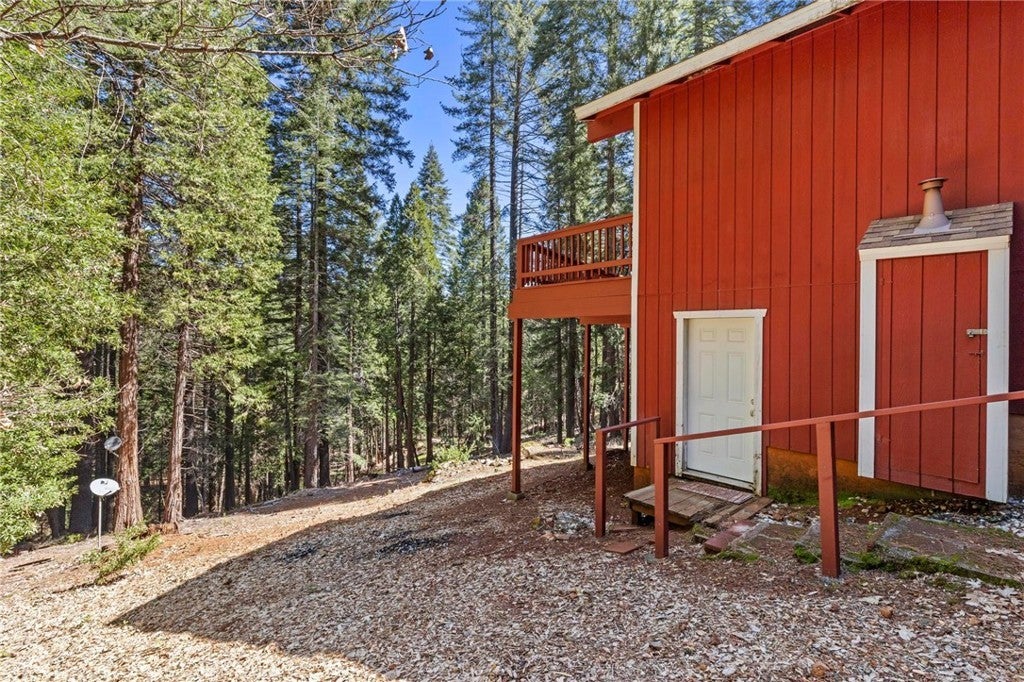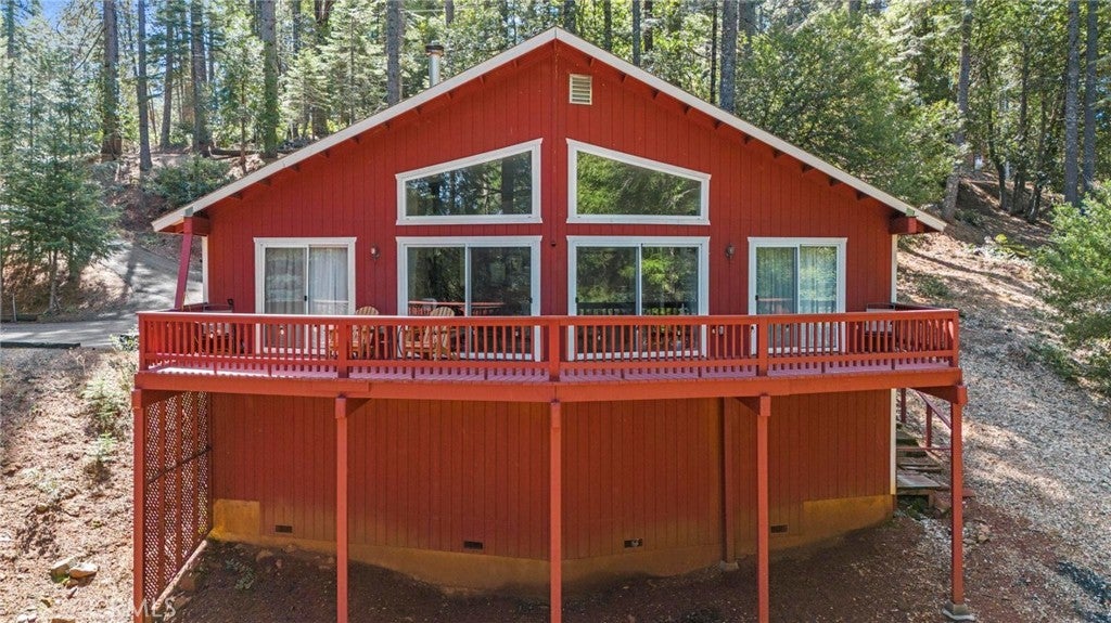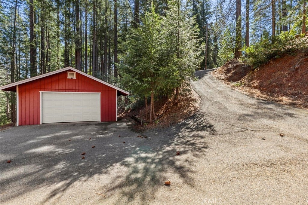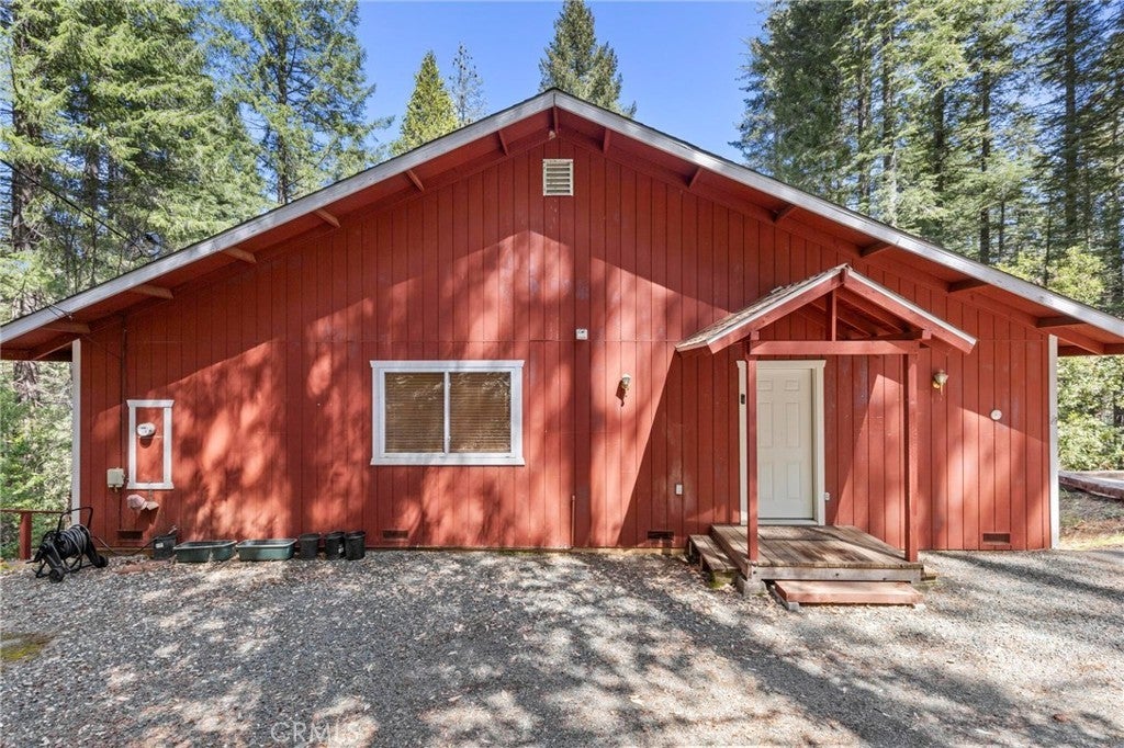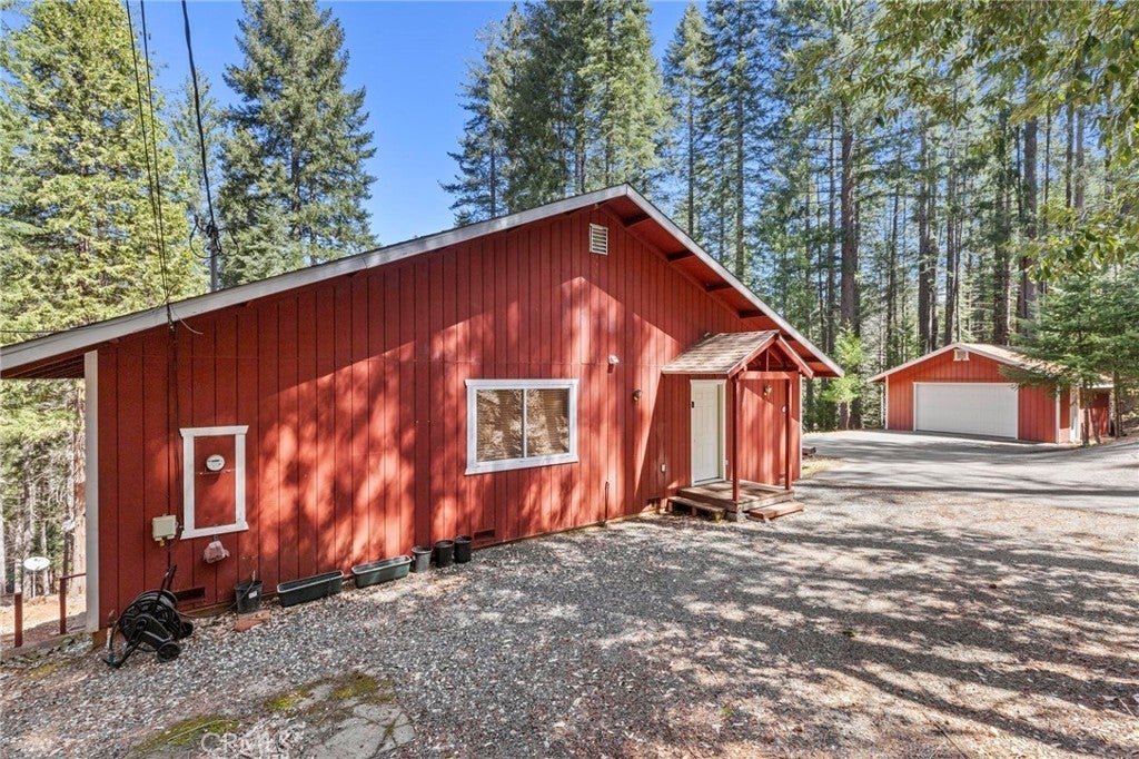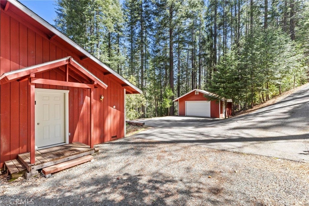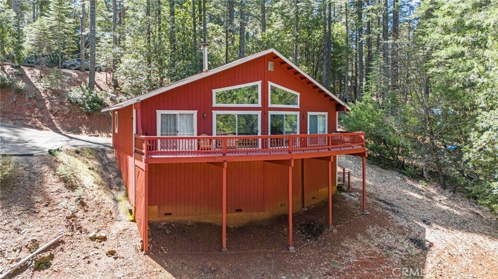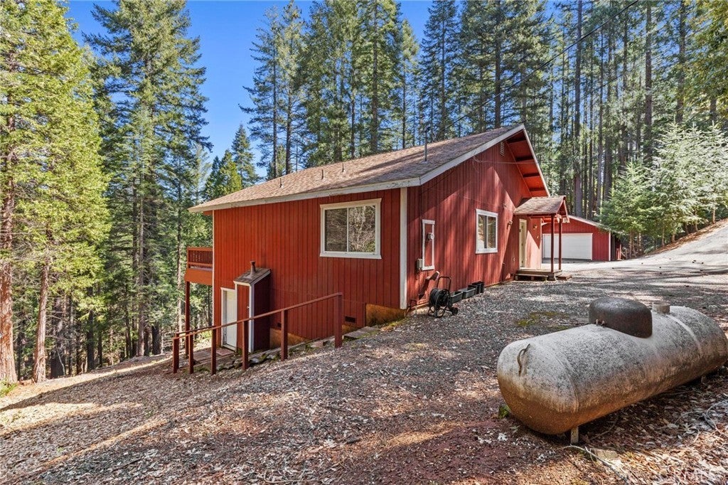 Tucked away in the peaceful, pine-studded community of Merry Mountain Village, this charming 3-bedroom, 2-bathroom cabin is the perfect mountain getaway for nature lovers and outdoor enthusiasts alike. With a thoughtful split floor plan, the spacious primary suite is set apart from the two additional bedrooms, offering privacy and comfort for all. Step into the cozy living room and warm up by the wood-burning fireplace during snowy winter days, or soak in the views through large picture windows and sliding glass doors that bring the outdoors in. Enjoy seamless access to the full-length back deck from the living room and two bedrooms—perfect for morning coffee, stargazing, or listening to the seasonal stream trickling through your own slice of forested paradise. The kitchen is ready for you with newer (2022) appliances included, and the laundry area is conveniently located in the basement. A detached 2-car garage offers plenty of room for vehicles, gear, and all your mountain toys. This home sits privately below the road, providing a peaceful setting surrounded by trees and nature. Plus, it includes a second parcel of vacant land—giving you 1.05 acres to utilize/explore. HOA amenities include water and access to a refreshing community pool in the warmer months, and you're just a short drive to Sly Creek Reservoir for swimming, boating, and fishing! Whether you’re looking for a vacation home, a full-time escape, or a smart investment, this mountain cabin checks all the boxes. Come experience the serenity and safety of owning in a Firewise-designated mountain community—your private retreat in the forest is waiting!