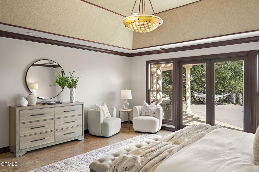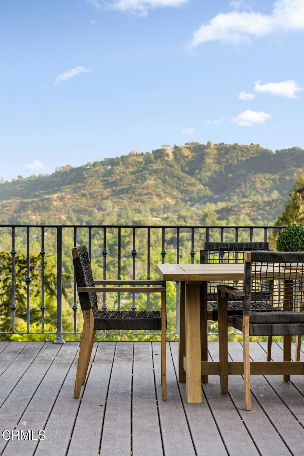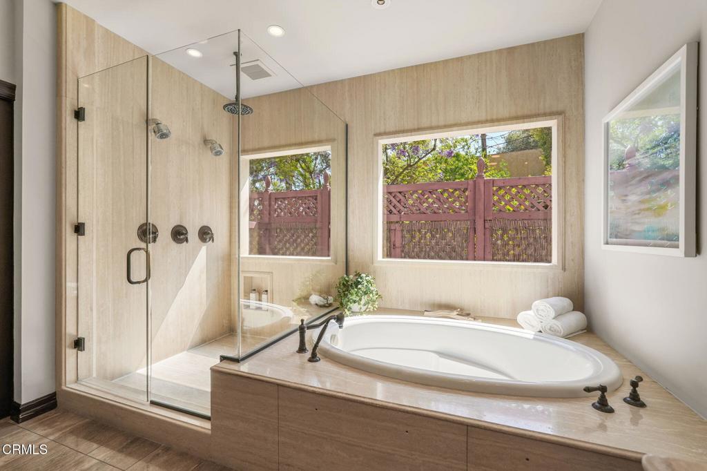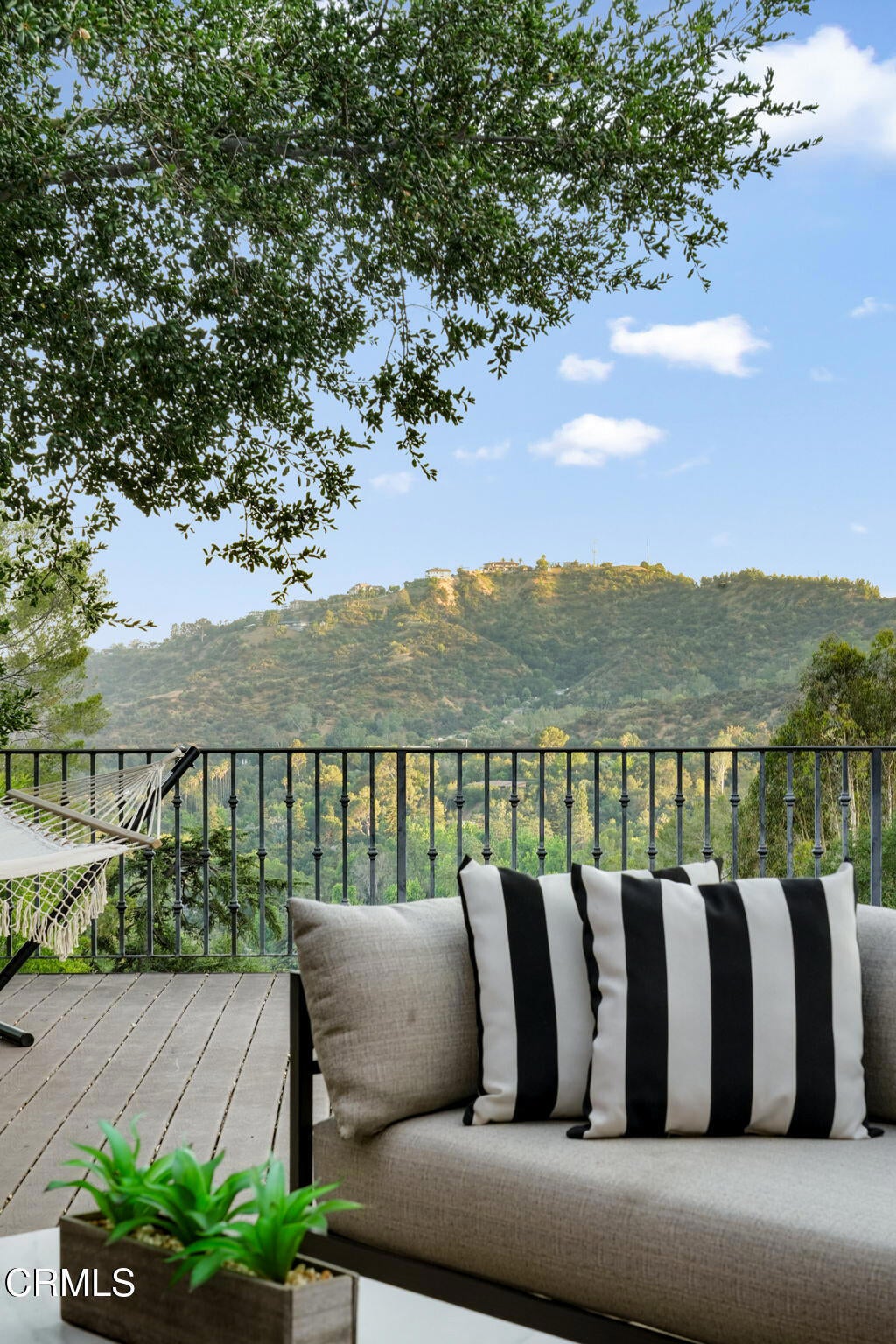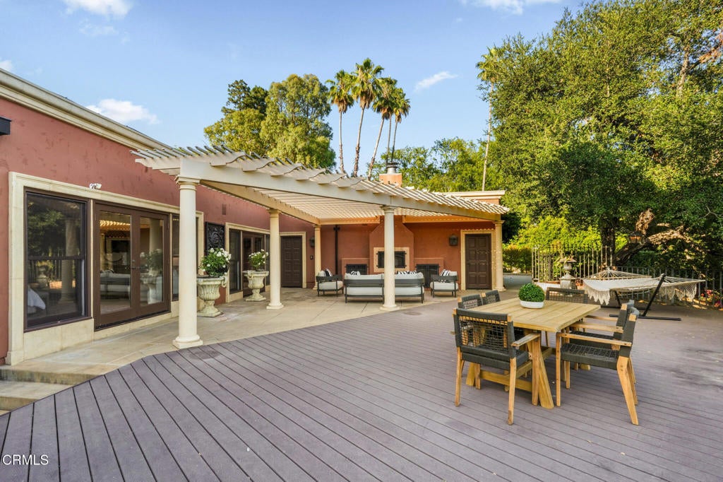 With its stunning architecture, coveted address in Upper Linda Vista, and beautifully-designed outdoor spaces, 1897 Braemar Rd is a secluded Pasadena treasure for those with discerning taste. Designed by esteemed Bel-Air architect Aleck Dugally, whose clients included Sylvester Stallone, Denzel Washington, and Sumner Redstone, this Contemporary Tuscan Villa stands apart with inspired details and a deeply peaceful setting. A grand foyer with a soaring ceiling offers an exquisite welcome. Sunlight pours in from the massive skylight overhead, illuminating the sumptuous travertine floors and offering a prelude to the elegance that awaits within. You'll instantly appreciate how Dugally's semi-open concept layout strikes the perfect balance between spaciousness and separation. The foyer adjoins both the dining room on the right and the sunken living room, which rests straight ahead. The latter offers the perfect setting for an intimate concerto or book reading. A chef-worthy kitchen features a cork floor, top-tier German appliances, and gorgeous wood cabinets. Wrapped in windows and boasting a radiant skylight, this dream kitchen overlooks the breakfast area-your sunlit spot for mindful mornings. Casual relaxation is always on offer in the inviting family room, which includes a large fireplace that creates the perfect ambiance during the winter months. Two bedrooms share a dual-vanity hallway bathroom, while the expansive primary suite is privately tucked on its own wing. This serene retreat is complete with a luxurious spa bath, walk-in closet, and French doors opening to the patio. Step out to your secluded outdoor haven shaded by a Walpole pergola and offering stunning views of the lush greenery in the canyon below. As beautiful as the home's interiors are, its outdoor spaces are equally impressive with expansive patios and decks wrapping all around. The main backyard space showcases modern art in a gorgeous natural setting, with striking abstract sculptures and a statement water feature set amidst lush plantlife. Additional outdoor amenities include a fireplace and numerous lounging areas. The attached two-car garage includes a workshop and an 800-bottle wine cellar to house your collection. A one-of-a-kind residence that imbues your days with beauty and peacefulness, 1897 Braemar is not to be missed.
