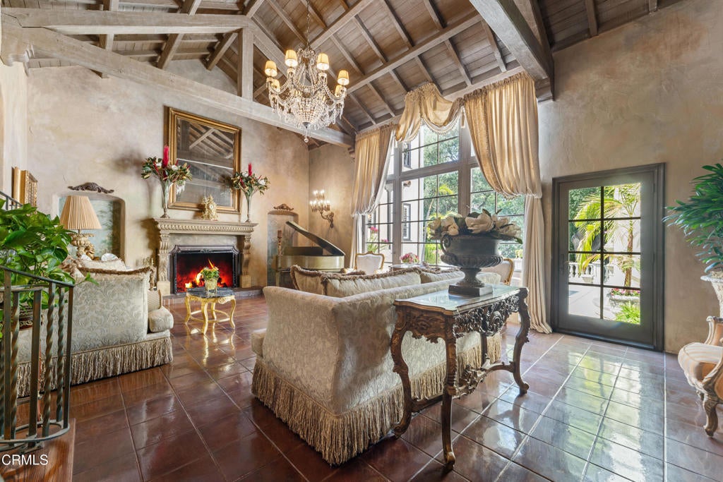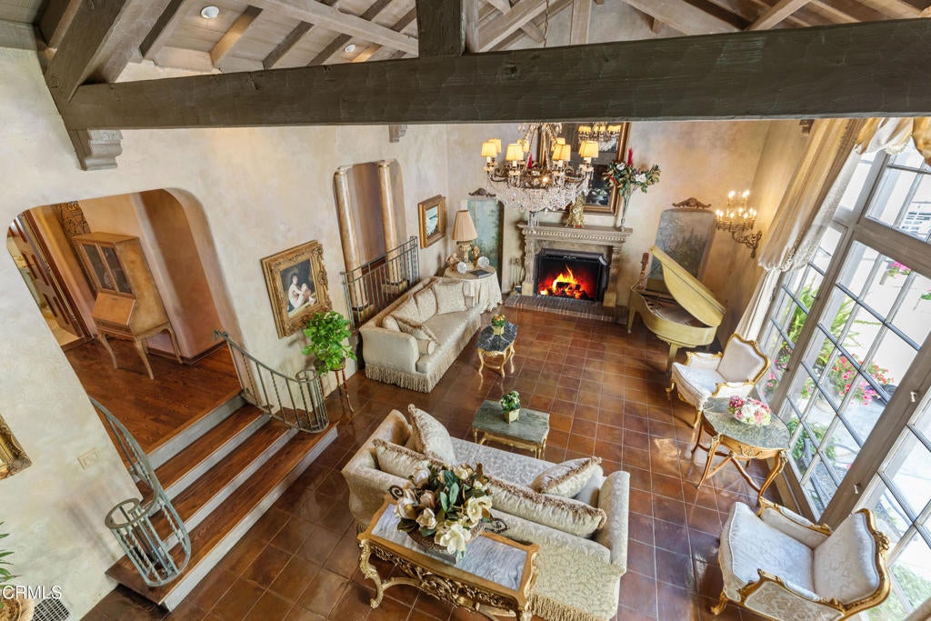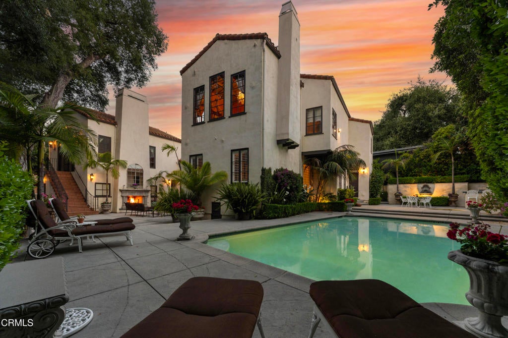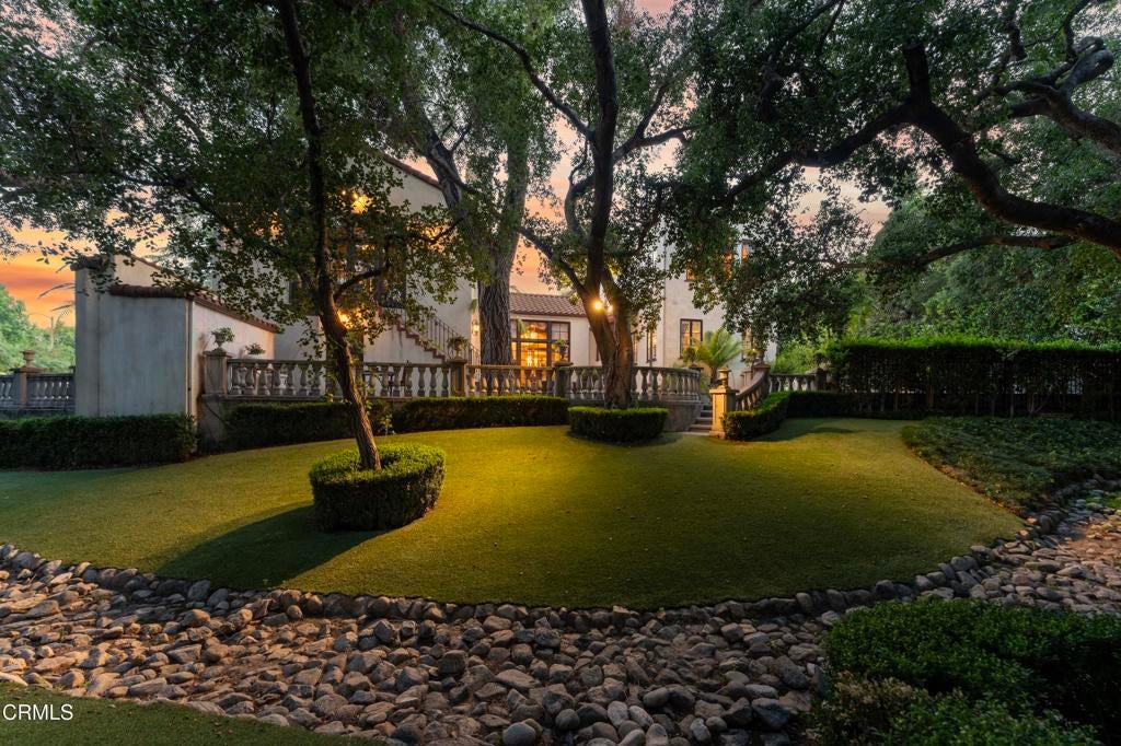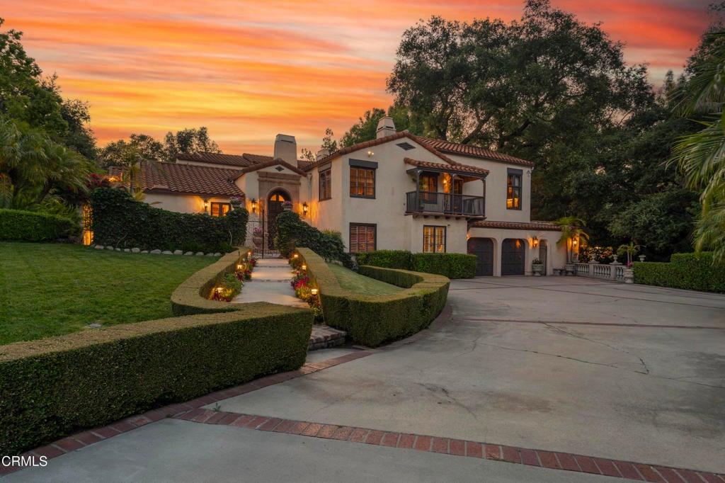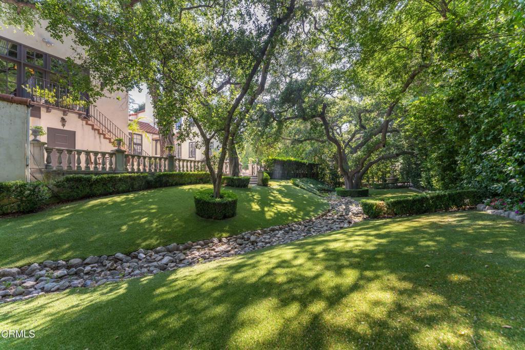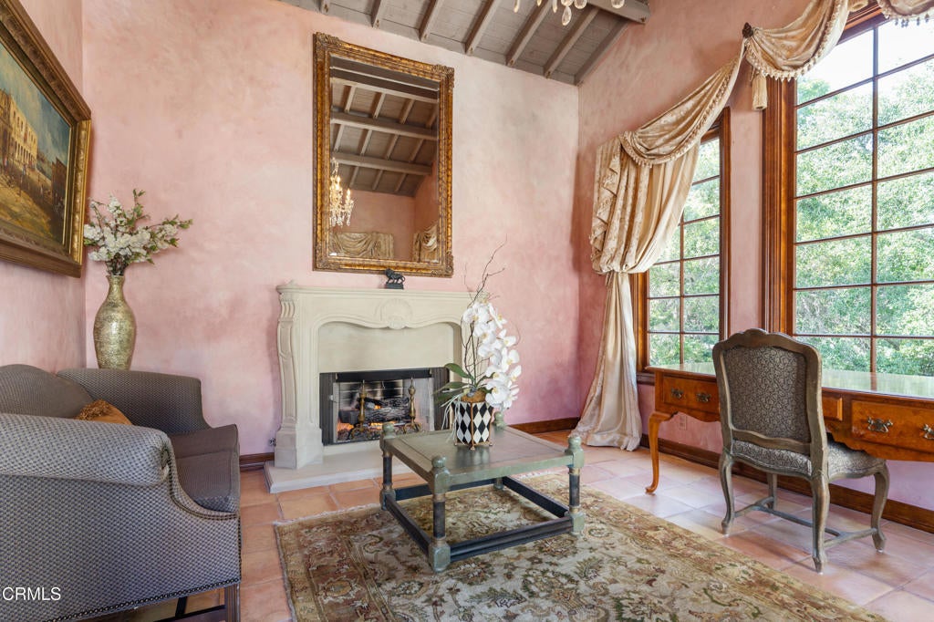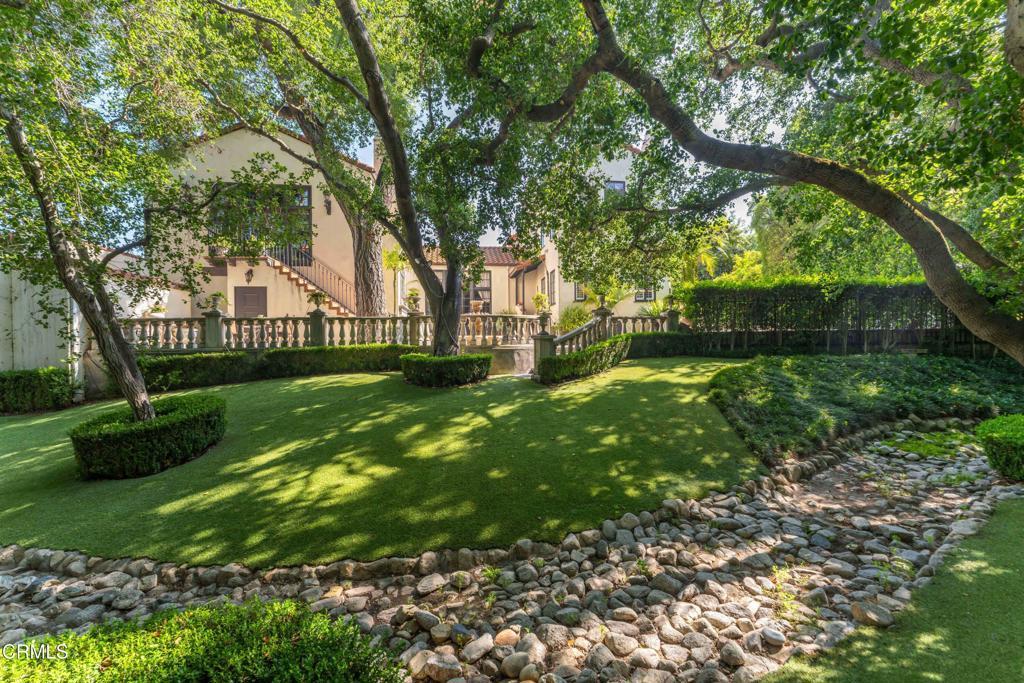 Welcome to the enchanting Orrin White House--an extraordinary 1924 estate originally designed by celebrated architect Garrett Van Pelt, Jr., for acclaimed Plein-Air painter Orrin White and his family. One of the first homes in the area, this rare architectural gem was thoughtfully sited for its breathtaking views of Mt. Wilson and the San Gabriel Mountains, which inspired White's artistry. The frontage is unusually generous at 160 feet. Tucked behind tall hedges and a gated entrance on over half an acre of lush, private grounds, this home is a sanctuary of peace and refinement. The current owners, only the second caretakers of the property in its century-long history, have masterfully restored and updated the residence with a reverence for its original character. Enter the grand formal entry past the 9-foot custom alder front door where 12-foot ceilings, handcrafted plaster cornices, and a Swarovski bronze and crystal chandelier set a tone of quiet elegance. The formal living room is breathtaking--anchored by 18-foot-fitted-old-growth redwood beams, a 2-story window framing majestic oaks, a wood-burning fireplace, and original stamped-concrete floors, with a choir loft above. The gracious formal dining room accommodates 14 guests. It exudes romance with a fireplace, custom wrought iron pocket gates, and French doors that open to the gardens. The chef's kitchen, outfitted with vaulted, beamed ceilings, French doors to a front courtyard and side patio, and top-tier appliances including a Viking 6-burner stove and Sub-Zero refrigerator. A built-in bar with hammered copper sink and beverage fridge completes the space. Up a half-flight of stairs lies an entertaining level with a family room and an impressive game room featuring a vaulted ceiling, wet bar, and French doors opening to an exterior stairway. With 5 bedrooms and 5.5 bathrooms, this home offers generous space. The luxurious primary suite is a true retreat, with 16-foot ceilings, dual fireplaces, and a sitting room. Modern upgrades include updated electrical and plumbing systems, foundation bolting, 3-zone HVAC, a music system, and partial dual-pane windows. Outside, the grounds evoke a European resort experience. Relax beneath a canopy of heritage oak trees, take a dip in the sparkling pool or spa, enjoy the built-in BBQ, or gather around the large outdoor fireplace. There are 7 fireplaces throughout. A rare fusion of historic artistry and modern luxury, this is more than a home--it's a living legacy.