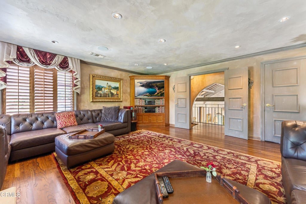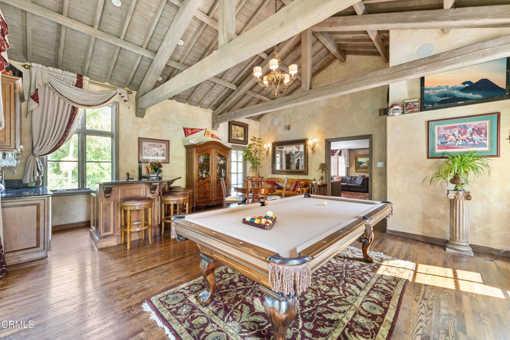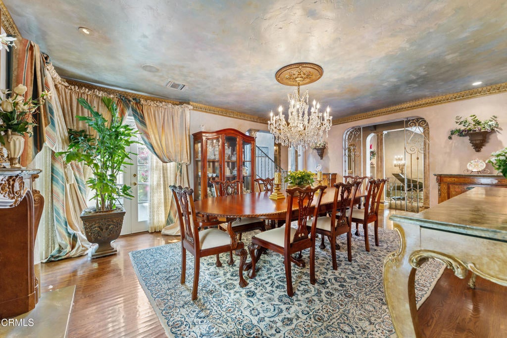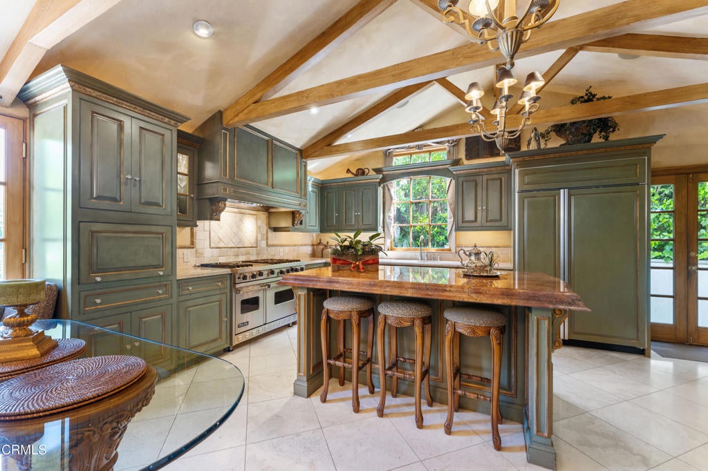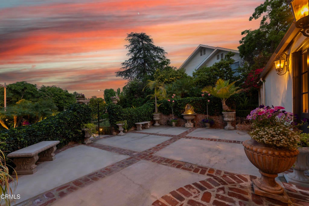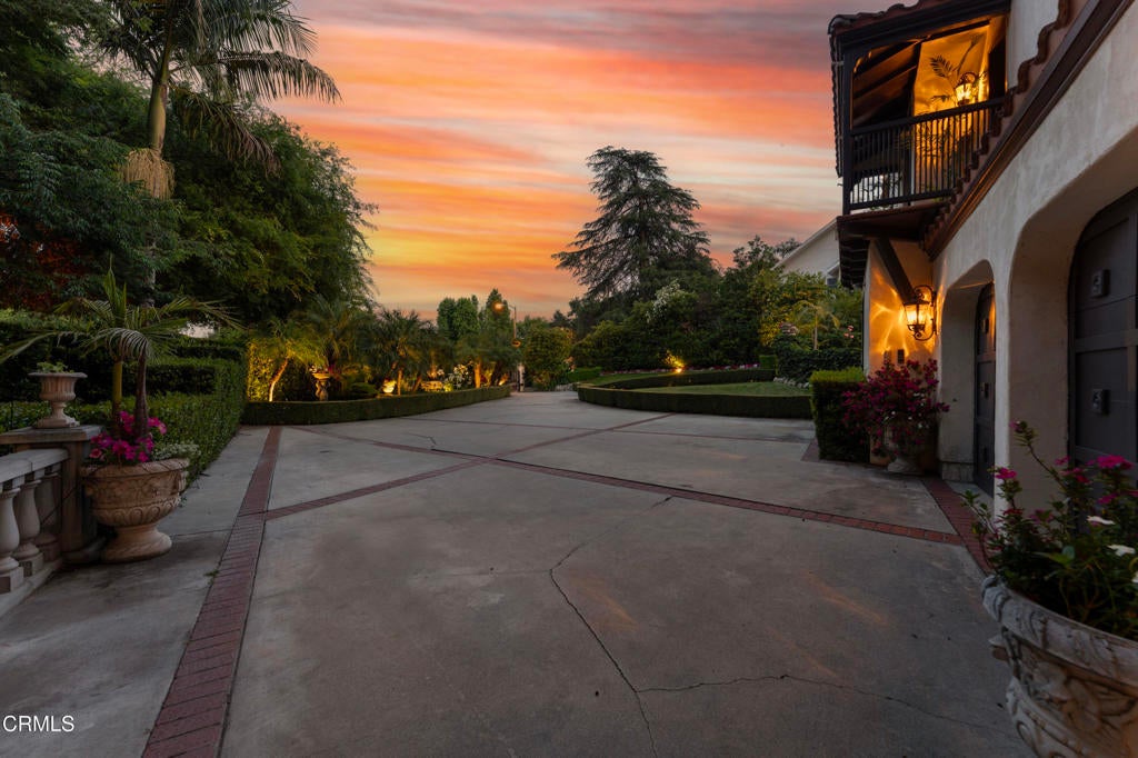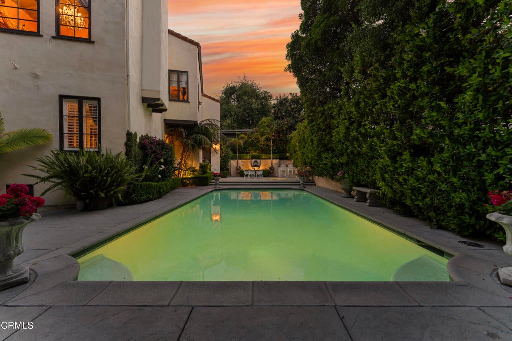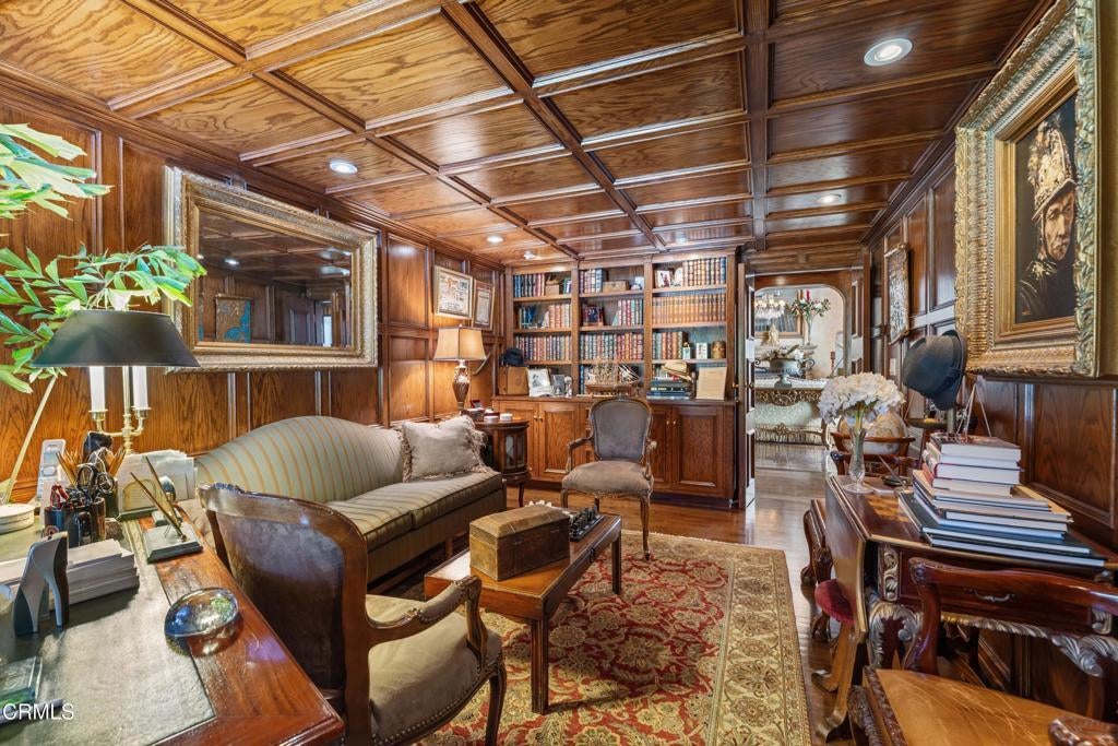 Welcome to the enchanting Orrin White House--an extraordinary 1924 estate originally designed by celebrated architect Garrett Van Pelt, Jr., for acclaimed Plein-Air painter Orrin White and his family. One of the first homes in the area, this rare architectural gem was thoughtfully sited for its breathtaking views of Mt. Wilson and the San Gabriel Mountains, which inspired White's artistry. The frontage is unusually generous at 160 feet. Tucked behind tall hedges and a gated entrance on over half an acre of lush, private grounds, this home is a sanctuary of peace and refinement. The current owners, only the second caretakers of the property in its century-long history, have masterfully restored and updated the residence with a reverence for its original character. Enter the grand formal entry past the 9-foot custom alder front door where 12-foot ceilings, handcrafted plaster cornices, and a Swarovski bronze and crystal chandelier set a tone of quiet elegance. The formal living room is breathtaking--anchored by 18-foot-fitted-old-growth redwood beams, a 2-story window framing majestic oaks, a wood-burning fireplace, and original stamped-concrete floors, with a choir loft above. The gracious formal dining room accommodates 14 guests. It exudes romance with a fireplace, custom wrought iron pocket gates, and French doors that open to the gardens. The chef's kitchen, outfitted with vaulted, beamed ceilings, French doors to a front courtyard and side patio, and top-tier appliances including a Viking 6-burner stove and Sub-Zero refrigerator. A built-in bar with hammered copper sink and beverage fridge completes the space. Up a half-flight of stairs lies an entertaining level with a family room and an impressive game room featuring a vaulted ceiling, wet bar, and French doors opening to an exterior stairway. With 5 bedrooms and 5.5 bathrooms, this home offers generous space. The luxurious primary suite is a true retreat, with 16-foot ceilings, dual fireplaces, and a sitting room. Modern upgrades include updated electrical and plumbing systems, foundation bolting, 3-zone HVAC, a music system, and partial dual-pane windows. Outside, the grounds evoke a European resort experience. Relax beneath a canopy of heritage oak trees, take a dip in the sparkling pool or spa, enjoy the built-in BBQ, or gather around the large outdoor fireplace. There are 7 fireplaces throughout. A rare fusion of historic artistry and modern luxury, this is more than a home--it's a living legacy.