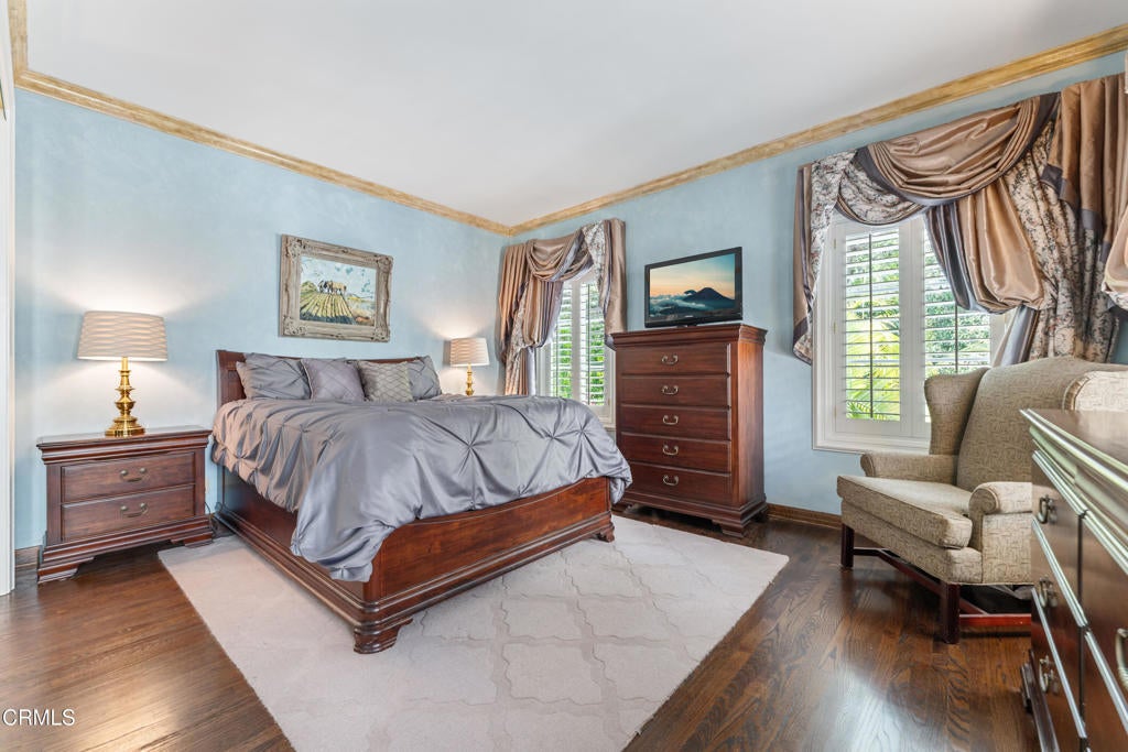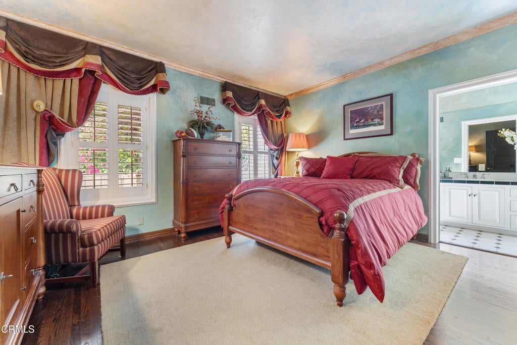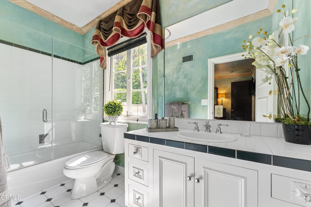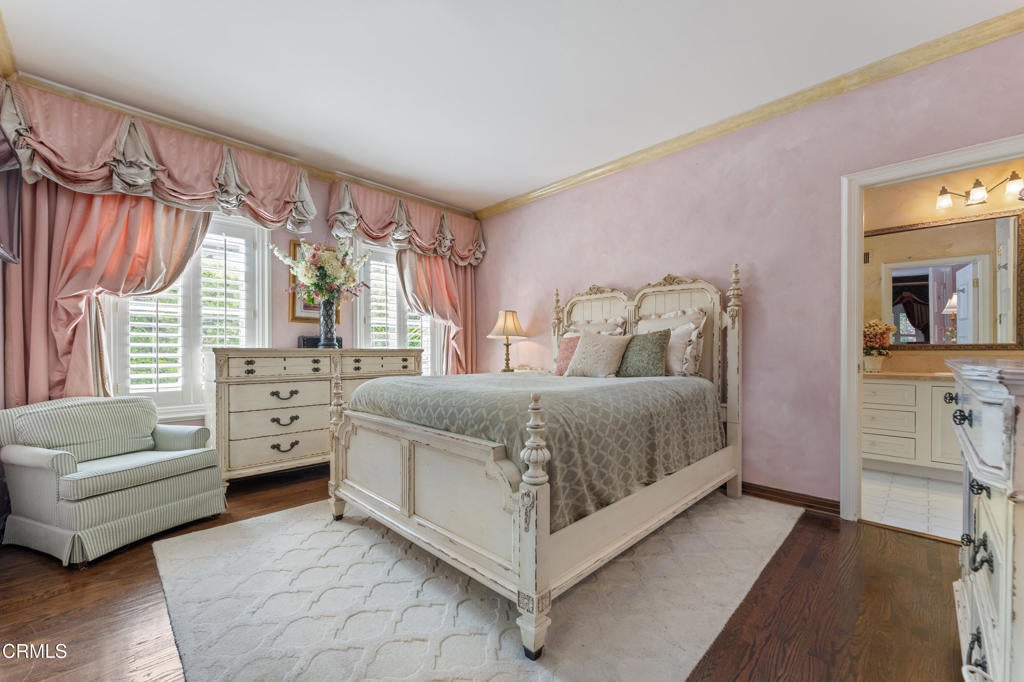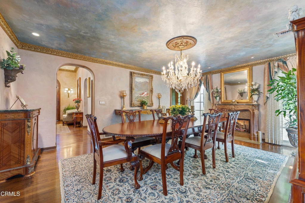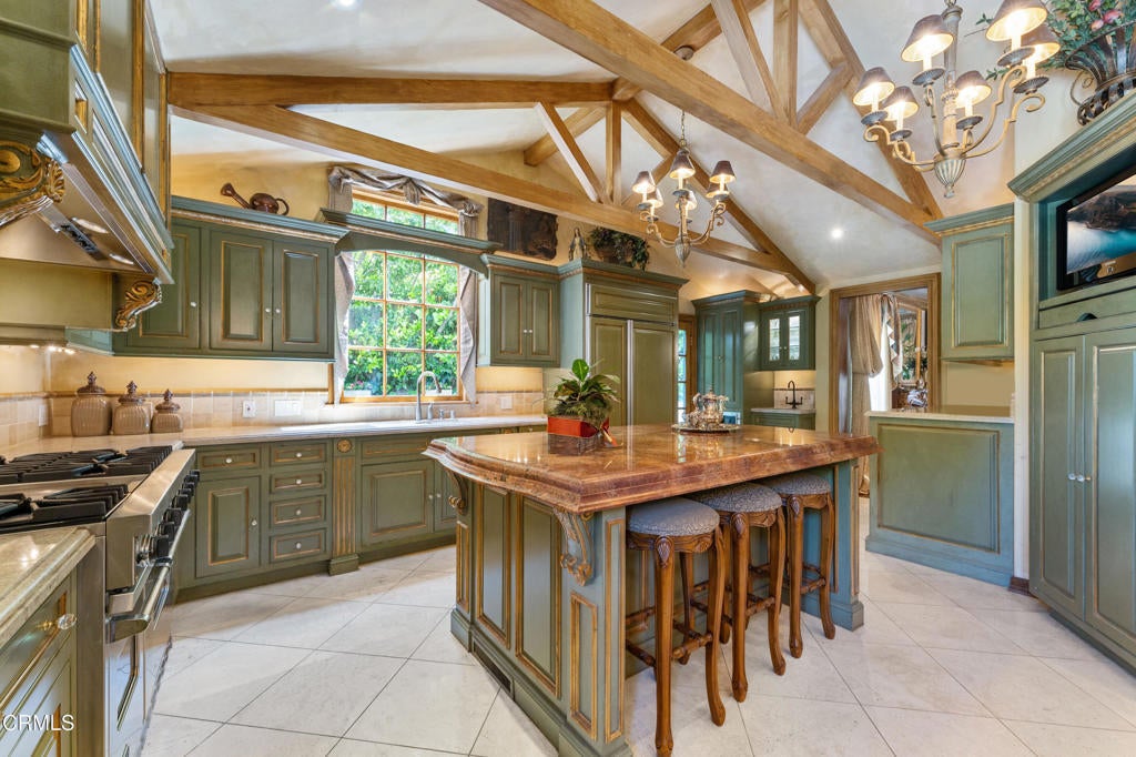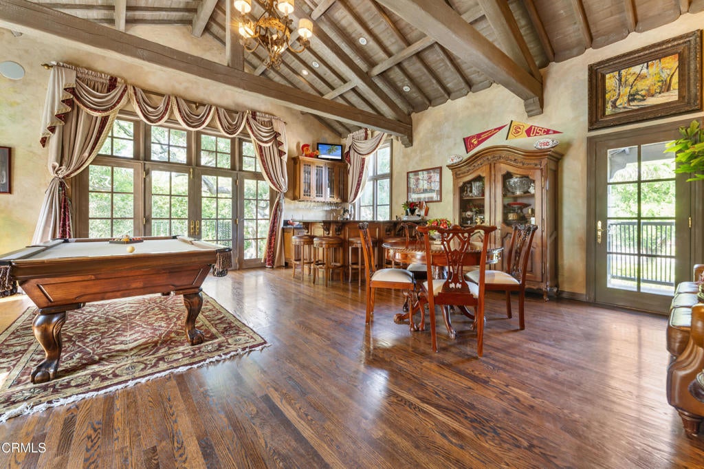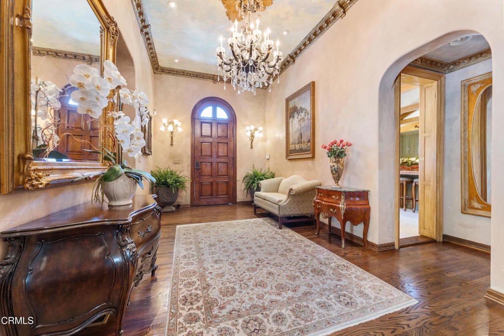 Welcome to the enchanting Orrin White House--an extraordinary 1924 estate originally designed by celebrated architect Garrett Van Pelt, Jr., for acclaimed Plein-Air painter Orrin White and his family. One of the first homes in the area, this rare architectural gem was thoughtfully sited for its breathtaking views of Mt. Wilson and the San Gabriel Mountains, which inspired White's artistry. The frontage is unusually generous at 160 feet. Tucked behind tall hedges and a gated entrance on over half an acre of lush, private grounds, this home is a sanctuary of peace and refinement. The current owners, only the second caretakers of the property in its century-long history, have masterfully restored and updated the residence with a reverence for its original character. Enter the grand formal entry past the 9-foot custom alder front door where 12-foot ceilings, handcrafted plaster cornices, and a Swarovski bronze and crystal chandelier set a tone of quiet elegance. The formal living room is breathtaking--anchored by 18-foot-fitted-old-growth redwood beams, a 2-story window framing majestic oaks, a wood-burning fireplace, and original stamped-concrete floors, with a choir loft above. The gracious formal dining room accommodates 14 guests. It exudes romance with a fireplace, custom wrought iron pocket gates, and French doors that open to the gardens. The chef's kitchen, outfitted with vaulted, beamed ceilings, French doors to a front courtyard and side patio, and top-tier appliances including a Viking 6-burner stove and Sub-Zero refrigerator. A built-in bar with hammered copper sink and beverage fridge completes the space. Up a half-flight of stairs lies an entertaining level with a family room and an impressive game room featuring a vaulted ceiling, wet bar, and French doors opening to an exterior stairway. With 5 bedrooms and 5.5 bathrooms, this home offers generous space. The luxurious primary suite is a true retreat, with 16-foot ceilings, dual fireplaces, and a sitting room. Modern upgrades include updated electrical and plumbing systems, foundation bolting, 3-zone HVAC, a music system, and partial dual-pane windows. Outside, the grounds evoke a European resort experience. Relax beneath a canopy of heritage oak trees, take a dip in the sparkling pool or spa, enjoy the built-in BBQ, or gather around the large outdoor fireplace. There are 7 fireplaces throughout. A rare fusion of historic artistry and modern luxury, this is more than a home--it's a living legacy.