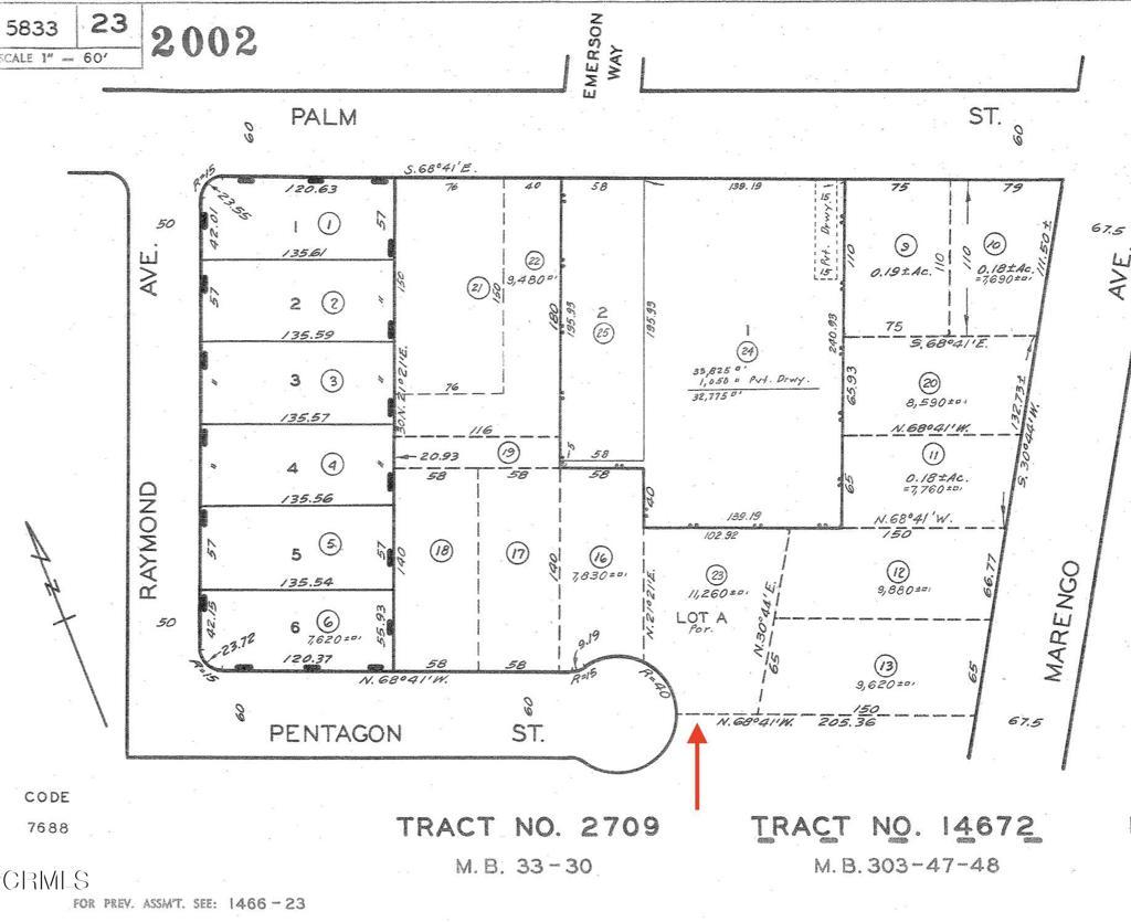 Located at the end of a quiet cul-de-sac, 281 E Pentagon sits on a private 11,232 square foot lot set behind a mature hedge and filled with traces of a life well-lived. A two-story, detached two-car garage remains standing, once home to an art studio where stories were shared and creativity unfolded across generations. This site was once part of the early 20th century Pentagon Ranch, a citrus and avocado orchard whose presence still lingers in the land. Several fruiting trees remain, and the property once supported a navel orange, persimmon, fig, and multiple avocado varieties. Birds still move through the canopy, and the setting carries the quiet, abundant feel of an urban farm. It is close to the city but grounded in something simpler. 281 E Pentagon offers space, privacy, and a connection to both history and nature. Whether reimagined for a new chapter or shaped with a nod to what came before, the setting invites something personal to take root. This was once the site of a three-bedroom, two-bathroom home with 1,621 square feet of living space. With Phase 2 debris removal complete, the site is cleared and ready for what comes next. The property is being sold as land only.