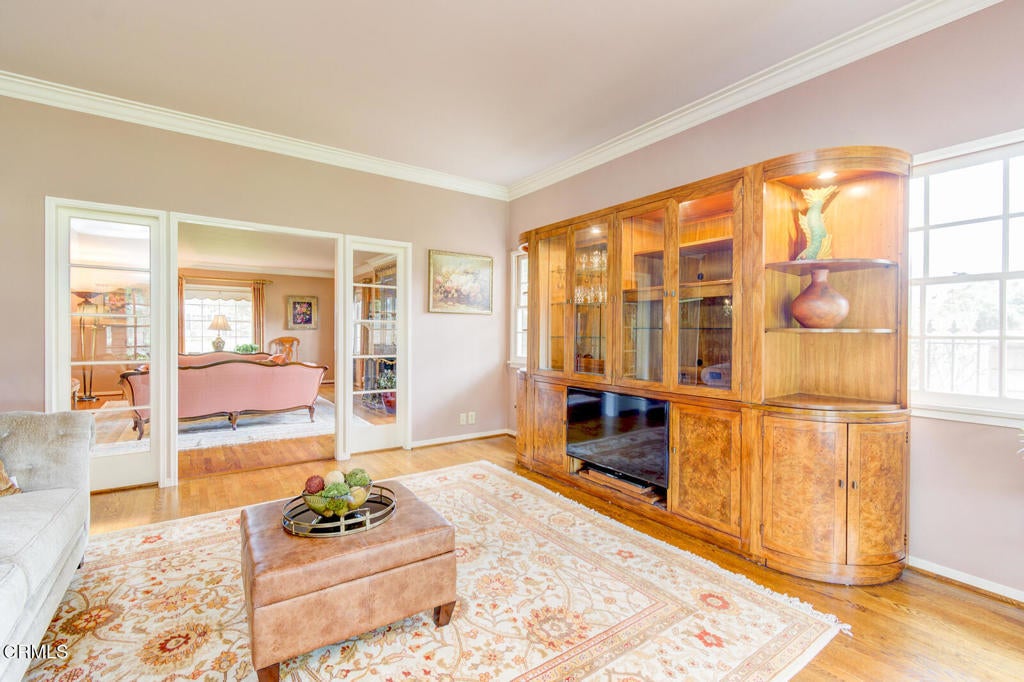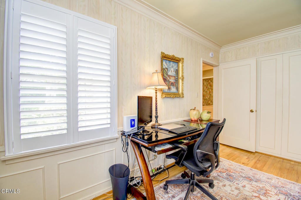 Balcony, Bedroom on Main Level, Built-in Features, Chair Rail, Crown Molding, Eat-in Kitchen