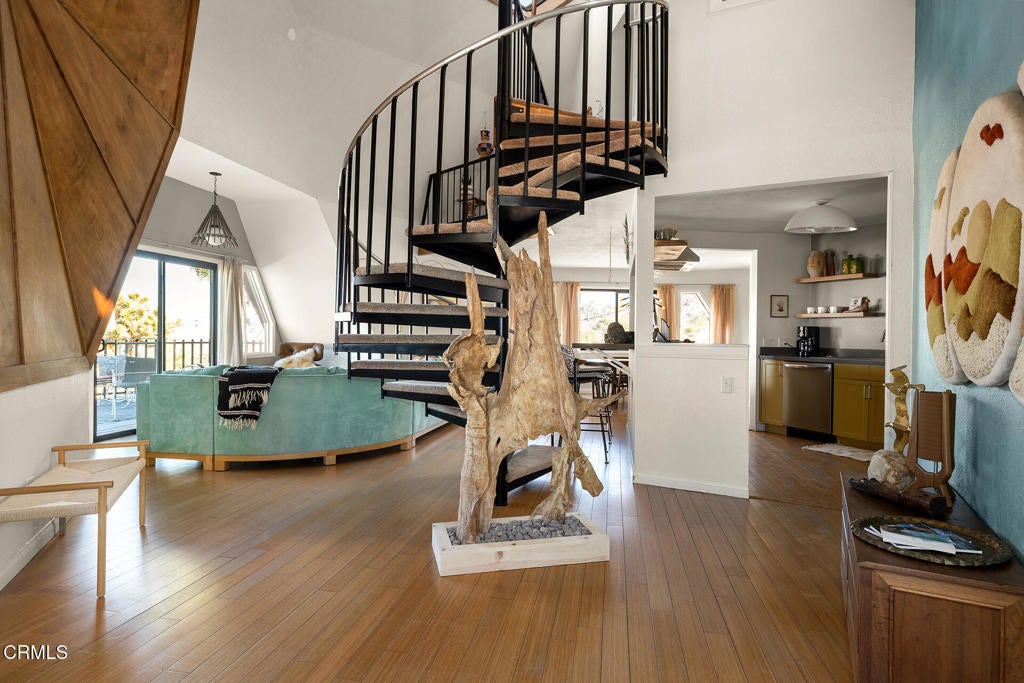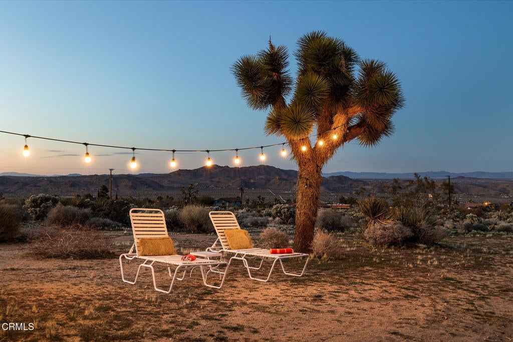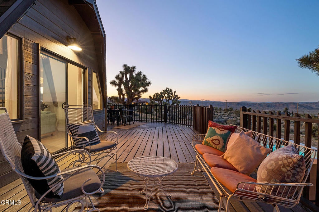 This architectural jewel sits amidst Joshua Trees on over two acres in Upper Friendly Hills. 7677 Wilton Rd is a striking Buckminster Fuller-inspired geodesic dome with soaring ceilings, dramatic skylights, and stunning views of the surrounding mountains and desert. The lower level welcomes you with bamboo flooring and a bright, open layout that flows between the living, dining, and kitchen areas. The kitchen features colorful accents and stainless steel appliances, while the spacious primary suite offers a generous bedroom, large closets, and an en-suite bath. A spiral staircase leads to the lofted second level, where two additional bedrooms with unique triangular windows overlook the grounds. A modern bath showcases designer tile and dual sinks, and a flexible bonus room provides extra living space. Designed to capture natural light and frame the desert sky, the dome's wooden hexagonal details and abundant skylights create a uniquely beautiful atmosphere. Outdoors, the property offers a wraparound deck for al fresco dining, a propane fire pit, and a hot tub perfect for stargazing. With thoughtful upgrades including a newer roof, windows and sliding doors, an updated AC condenser, refreshed baths, and a newer hot water heater, this extraordinary home blends architectural wonder with modern comfort. Whether envisioned as a serene family retreat or a one-of-a-kind vacation escape, this desert dome presents the rare opportunity to live inside a work of art.