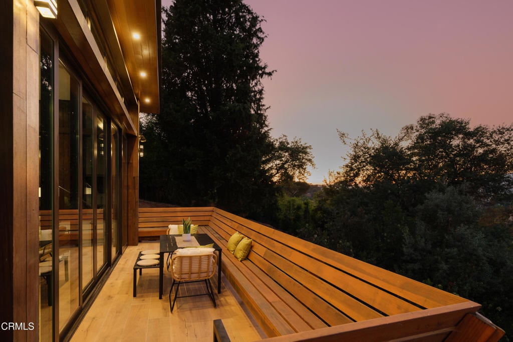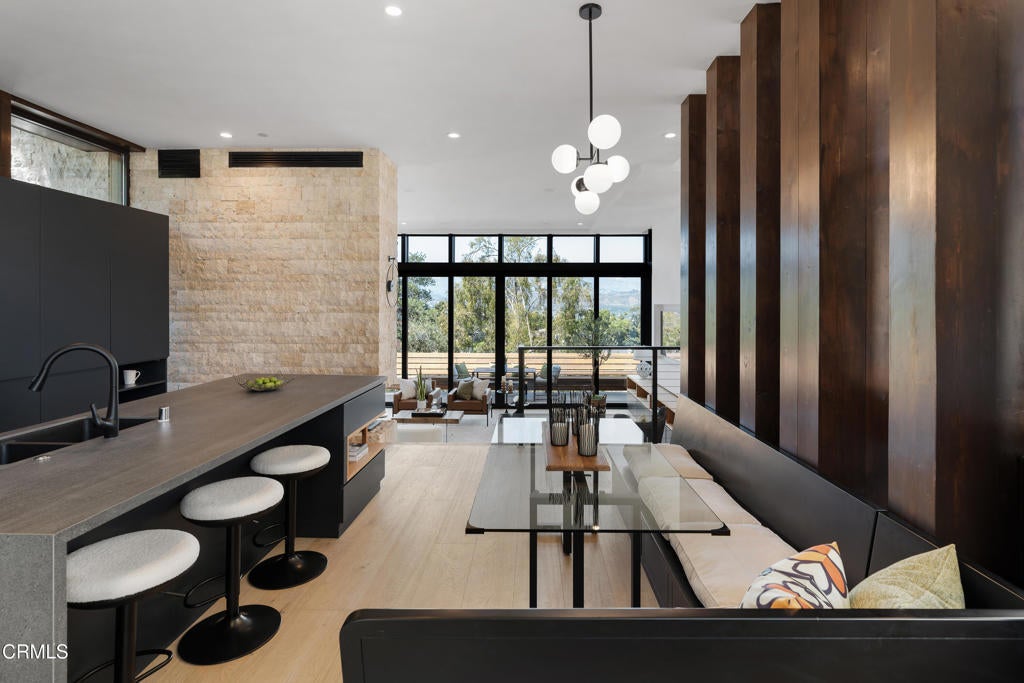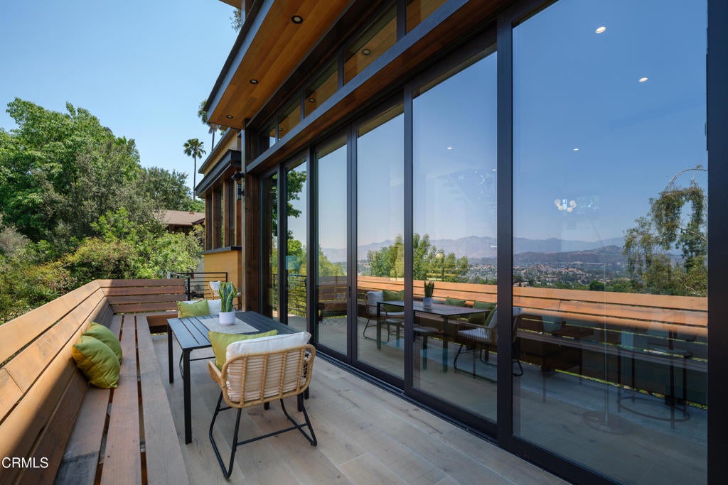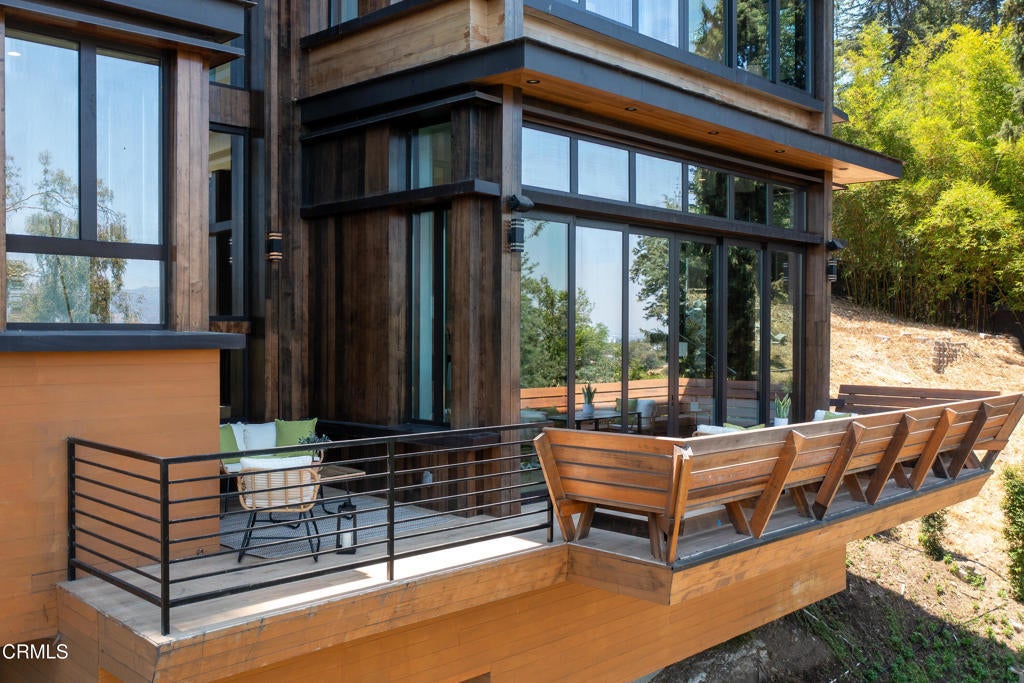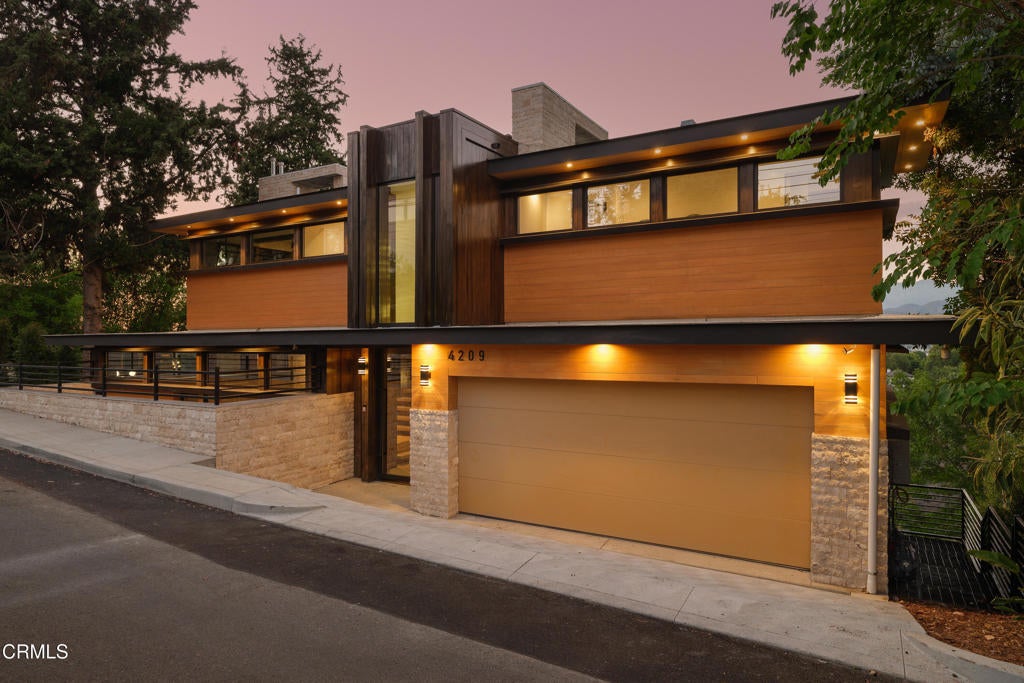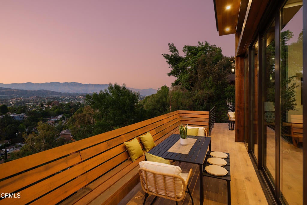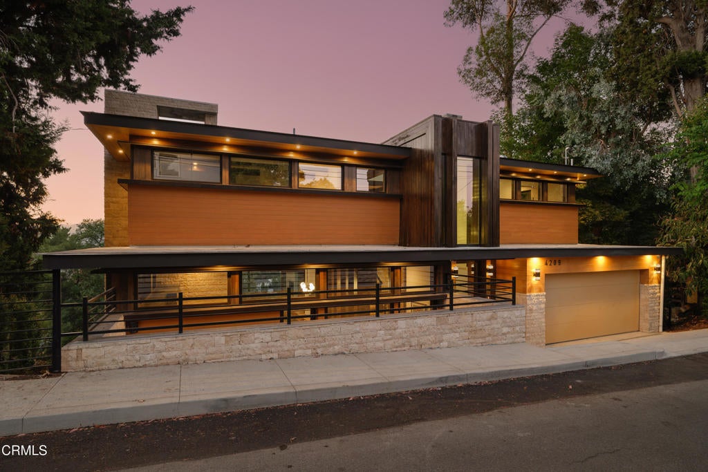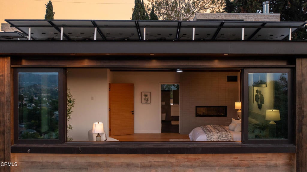 Poised in serene seclusion and designed with uncompromising attention to detail, this brand-new architectural estate is a triumph of form and function. A rare offering, this meticulously designed three-level residence redefines modern luxury in one of the area's most coveted hilltop settings. Clean lines, refined materials, and innovative technology come together in a home that reflects upscale living at every turn. From the moment you approach the sculptural facade--accented by Vale-engineered cedar siding and Porcelanosa deck tiles--you're met with elevated design. A custom front door opens into a formal foyer with a striking chandelier, Italian oak hardwood floors, and access to the attached two-car garage. Beyond the entry, the open-concept living space is filled with dramatic scale and natural light. European-imported windows and collapsible glass doors blur the boundary between indoors and out, offering stunning views and effortless flow to outdoor spaces. The grand living room boasts soaring ceilings and a European Home Element gas fireplace set into a floor-to-ceiling travertine wall--visible from both the living and kitchen areas. The chef's kitchen features porcelain countertops, a Bosch Benchmark appliance suite--including double ovens, induction cooktop, microwave drawer, refrigerator--and a deep sink within a generous island. Just off the living space, a guest suite offers sweeping views, a designer ceiling fan, and a luxury bath with a floating vanity, terrazzo bench, walk-in rainfall shower with dual showerheads, and a sleek Icera wall-mounted toilet. The floating staircase leads to the luminous primary suite, where expansive windows, a chevron wood ceiling, see-through fireplace, and large walk-in closet create a true retreat. The spa-like ensuite includes a Whirlpool soaking tub, oversized shower with terrazzo bench, dual showerheads, floating dual-sink vanity with Pental Misterio quartz, and a tankless wall-mounted toilet--wrapped in Italian tilework. Across the upper landing, another ensuite bedroom includes a balcony, modern fan, generous closet, and its own spa-style bath with floating vanity and rainfall shower. The lower level offers a large laundry room, storage, and direct access to the hillside backyard--ideal for quiet moments or enjoying views of the canyon trail below. A true sanctuary where design, performance, and natural beauty converge.