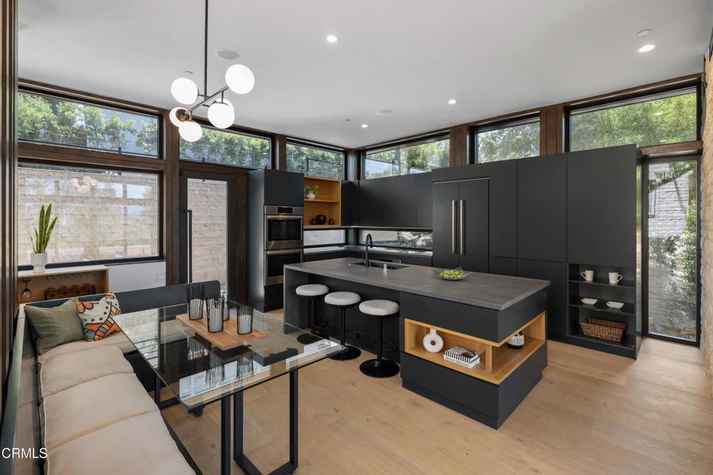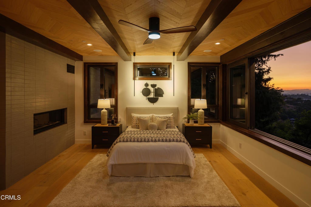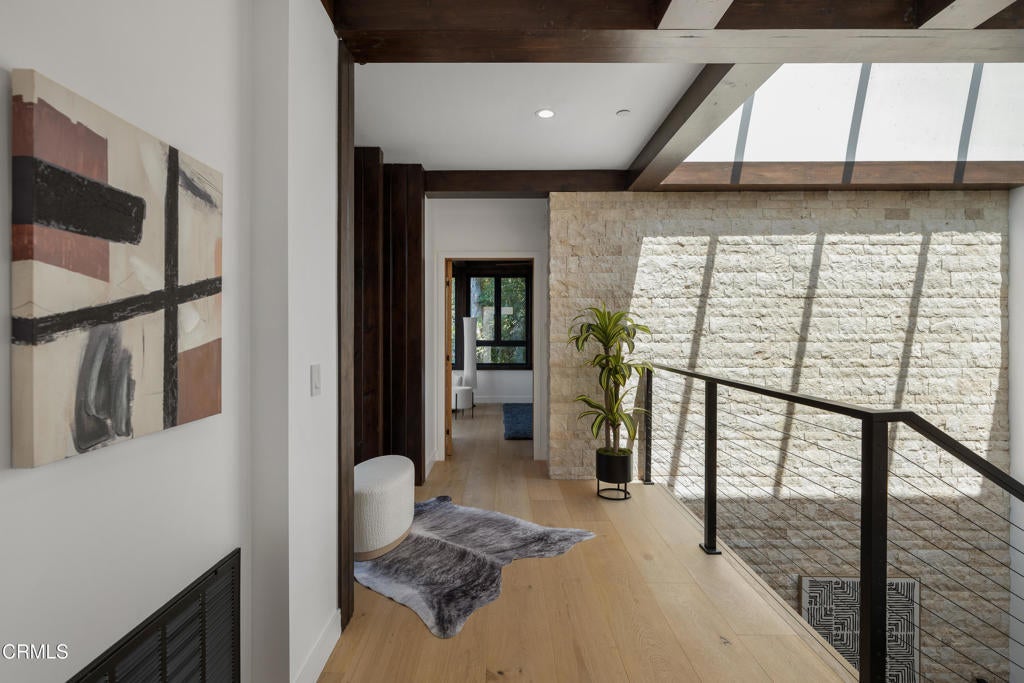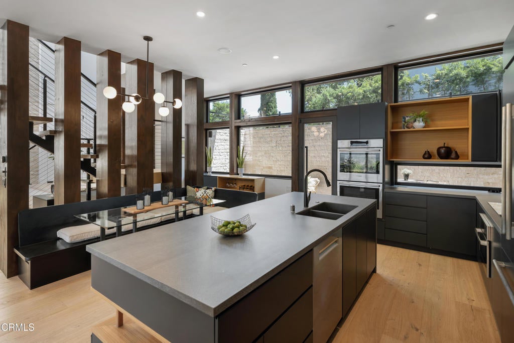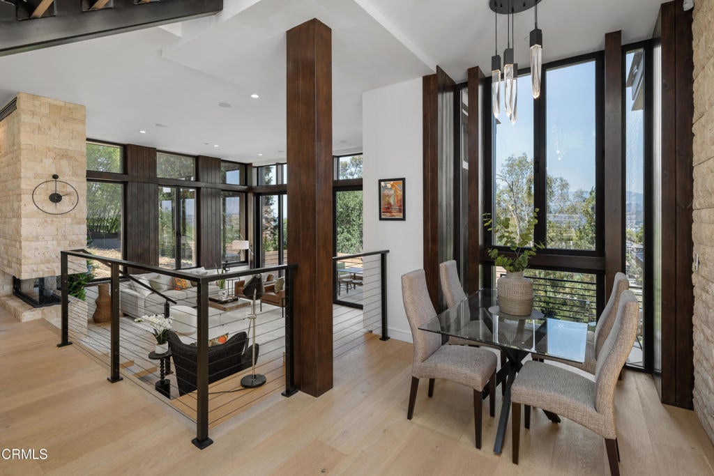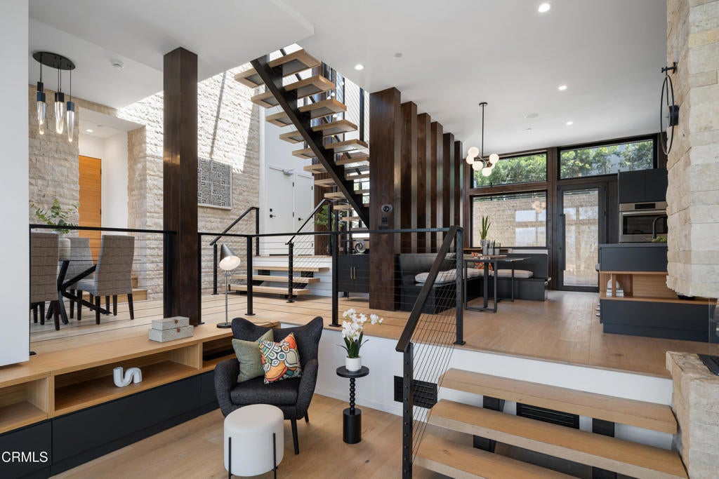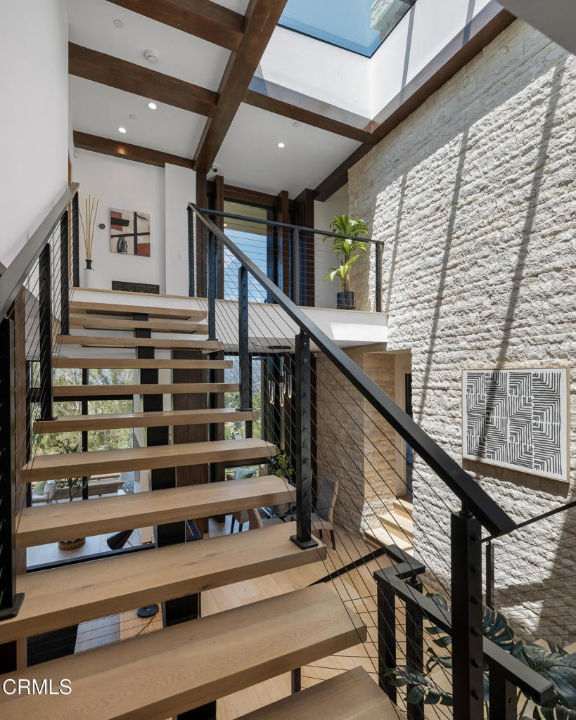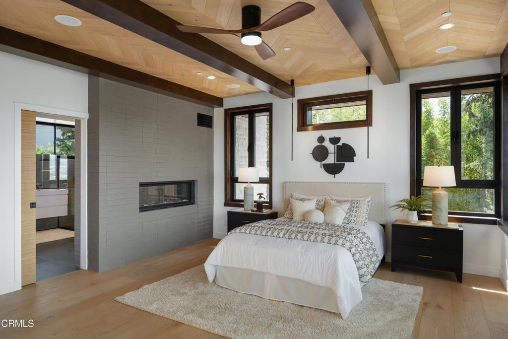 Poised in serene seclusion and designed with uncompromising attention to detail, this brand-new architectural estate is a triumph of form and function. A rare offering, this meticulously designed three-level residence redefines modern luxury in one of the area's most coveted hilltop settings. Clean lines, refined materials, and innovative technology come together in a home that reflects upscale living at every turn. From the moment you approach the sculptural facade--accented by Vale-engineered cedar siding and Porcelanosa deck tiles--you're met with elevated design. A custom front door opens into a formal foyer with a striking chandelier, Italian oak hardwood floors, and access to the attached two-car garage. Beyond the entry, the open-concept living space is filled with dramatic scale and natural light. European-imported windows and collapsible glass doors blur the boundary between indoors and out, offering stunning views and effortless flow to outdoor spaces. The grand living room boasts soaring ceilings and a European Home Element gas fireplace set into a floor-to-ceiling travertine wall--visible from both the living and kitchen areas. The chef's kitchen features porcelain countertops, a Bosch Benchmark appliance suite--including double ovens, induction cooktop, microwave drawer, refrigerator--and a deep sink within a generous island. Just off the living space, a guest suite offers sweeping views, a designer ceiling fan, and a luxury bath with a floating vanity, terrazzo bench, walk-in rainfall shower with dual showerheads, and a sleek Icera wall-mounted toilet. The floating staircase leads to the luminous primary suite, where expansive windows, a chevron wood ceiling, see-through fireplace, and large walk-in closet create a true retreat. The spa-like ensuite includes a Whirlpool soaking tub, oversized shower with terrazzo bench, dual showerheads, floating dual-sink vanity with Pental Misterio quartz, and a tankless wall-mounted toilet--wrapped in Italian tilework. Across the upper landing, another ensuite bedroom includes a balcony, modern fan, generous closet, and its own spa-style bath with floating vanity and rainfall shower. The lower level offers a large laundry room, storage, and direct access to the hillside backyard--ideal for quiet moments or enjoying views of the canyon trail below. A true sanctuary where design, performance, and natural beauty converge.