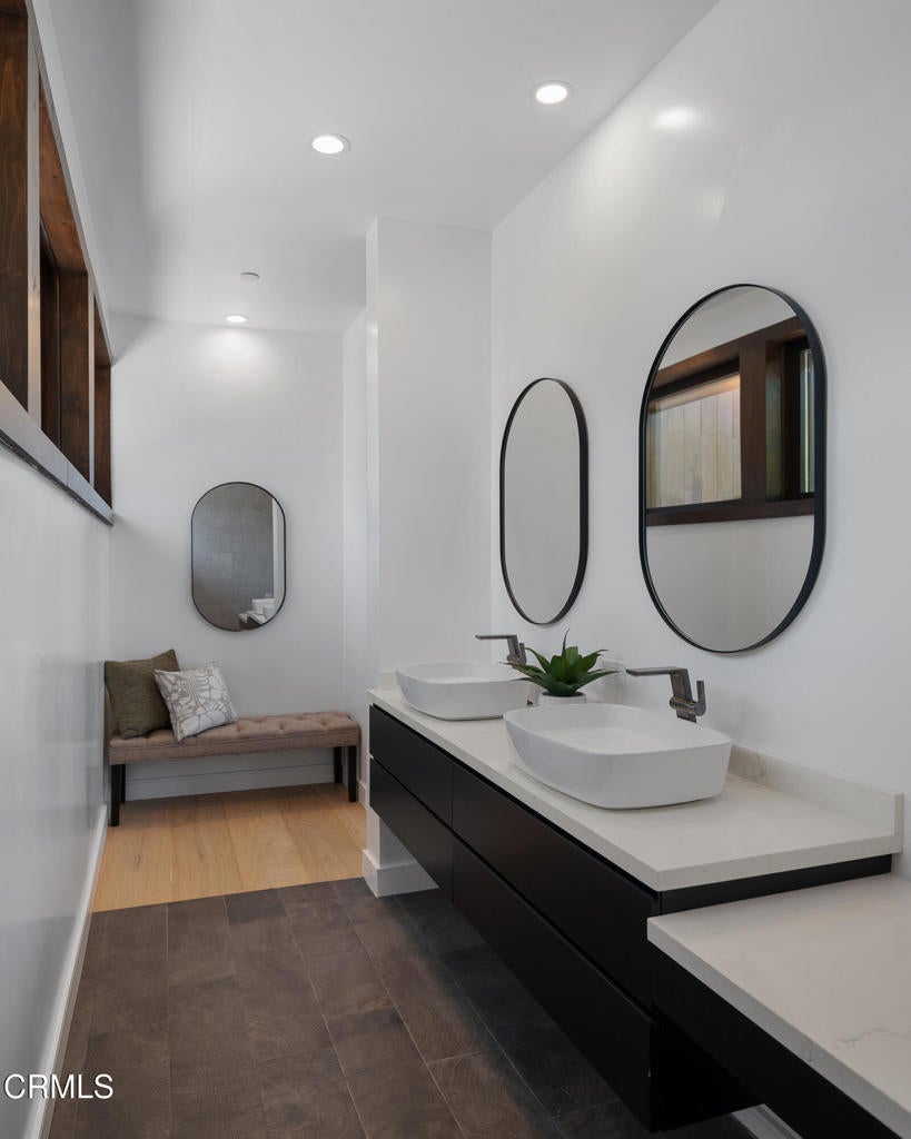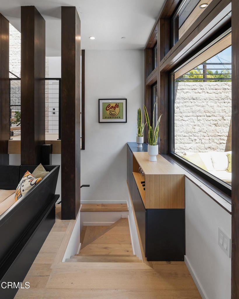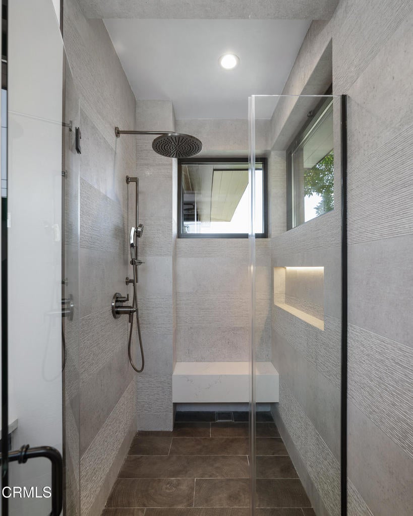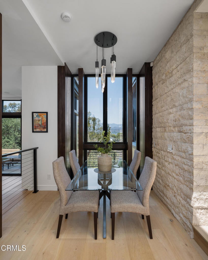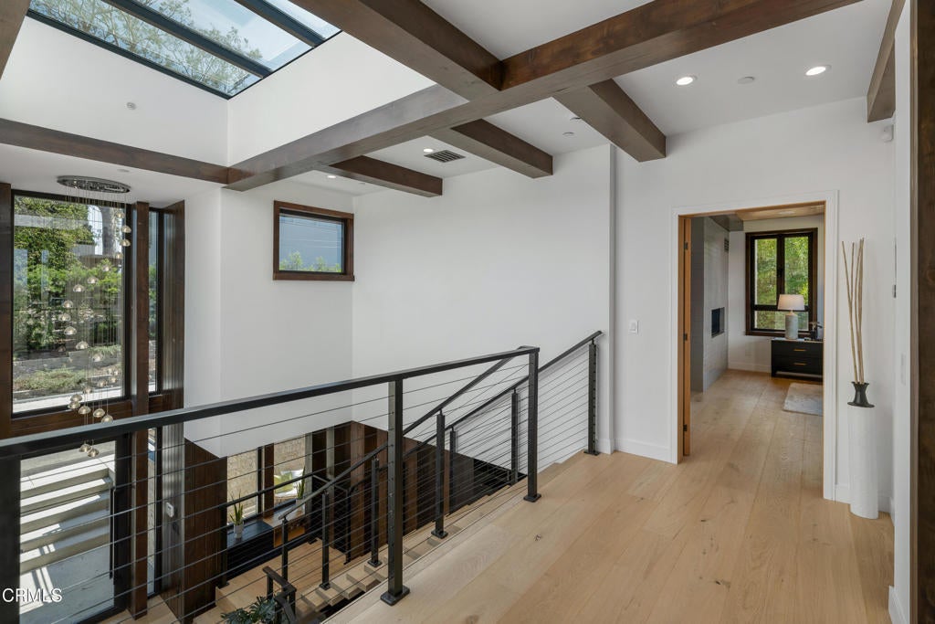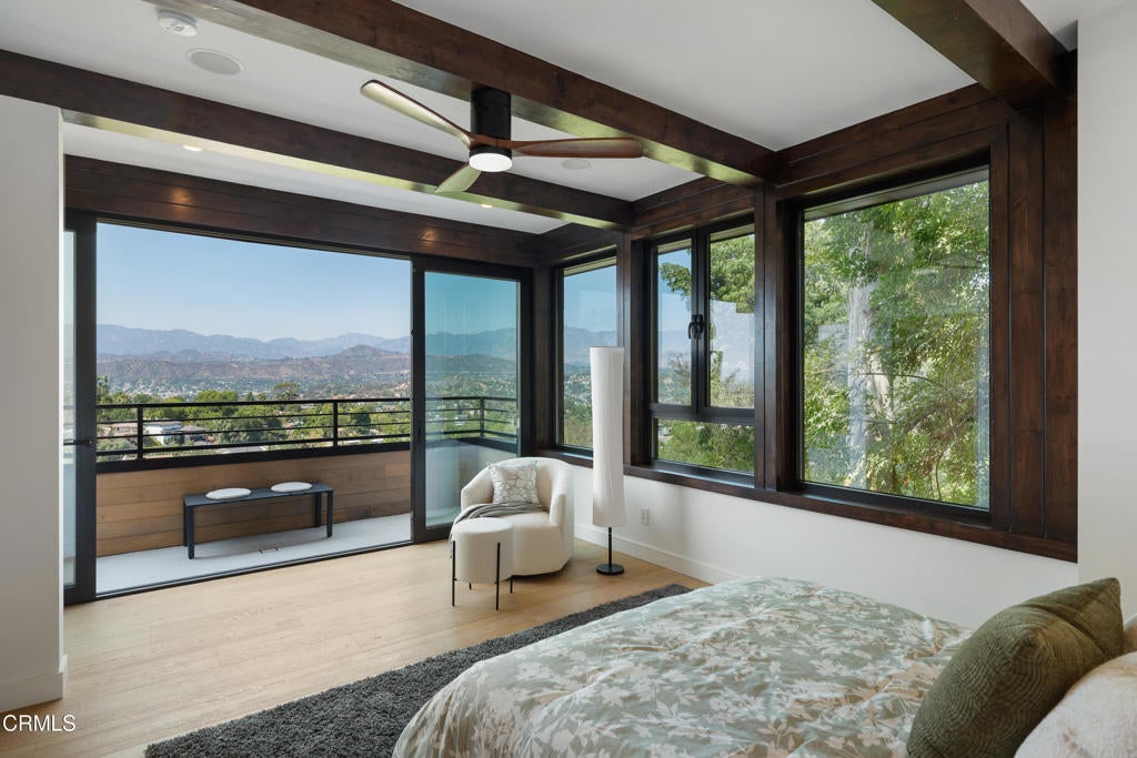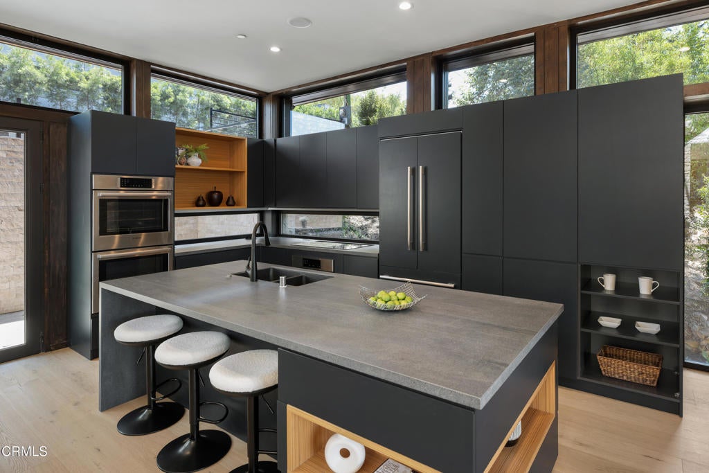 Poised in serene seclusion and designed with uncompromising attention to detail, this brand-new architectural estate is a triumph of form and function. A rare offering, this meticulously designed three-level residence redefines modern luxury in one of the area's most coveted hilltop settings. Clean lines, refined materials, and innovative technology come together in a home that reflects upscale living at every turn. From the moment you approach the sculptural facade--accented by Vale-engineered cedar siding and Porcelanosa deck tiles--you're met with elevated design. A custom front door opens into a formal foyer with a striking chandelier, Italian oak hardwood floors, and access to the attached two-car garage. Beyond the entry, the open-concept living space is filled with dramatic scale and natural light. European-imported windows and collapsible glass doors blur the boundary between indoors and out, offering stunning views and effortless flow to outdoor spaces. The grand living room boasts soaring ceilings and a European Home Element gas fireplace set into a floor-to-ceiling travertine wall--visible from both the living and kitchen areas. The chef's kitchen features porcelain countertops, a Bosch Benchmark appliance suite--including double ovens, induction cooktop, microwave drawer, refrigerator--and a deep sink within a generous island. Just off the living space, a guest suite offers sweeping views, a designer ceiling fan, and a luxury bath with a floating vanity, terrazzo bench, walk-in rainfall shower with dual showerheads, and a sleek Icera wall-mounted toilet. The floating staircase leads to the luminous primary suite, where expansive windows, a chevron wood ceiling, see-through fireplace, and large walk-in closet create a true retreat. The spa-like ensuite includes a Whirlpool soaking tub, oversized shower with terrazzo bench, dual showerheads, floating dual-sink vanity with Pental Misterio quartz, and a tankless wall-mounted toilet--wrapped in Italian tilework. Across the upper landing, another ensuite bedroom includes a balcony, modern fan, generous closet, and its own spa-style bath with floating vanity and rainfall shower. The lower level offers a large laundry room, storage, and direct access to the hillside backyard--ideal for quiet moments or enjoying views of the canyon trail below. A true sanctuary where design, performance, and natural beauty converge.