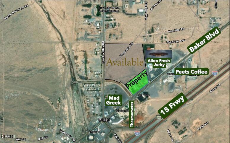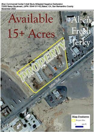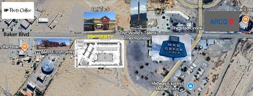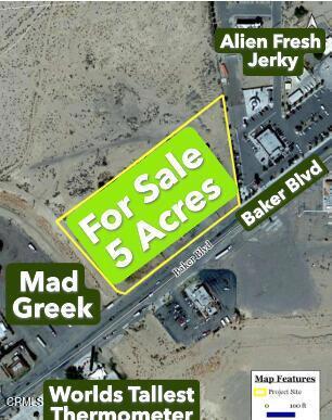 This Baker Blvd 5 Acres has a Condition Use Permit and plans to build a 20-pump fueling station, 20,400 sq ft convenience store, 3,864 sq ft coffee shop with a drive through, street improvements with two access points. It has approximately 500 feet frontage along Baker Blvd. Baker Blvd 5 Acres is strategically located on Baker Blvd, maximizing visibility of passing freeway traffic, on the I-15 corridor, the critical artery connecting Los Angeles and Las Vegas and high-volume traffic requiring a break before or after the long desert crossing. Its location ensures a constant stream of travelers, it is one of the busiest travel routes in the Southwest. This retail location will be another roadside encounter, like the Alien Fresh Jerky, World's Tallest Thermometer and Mad Greek. Baker Blvd 5 Acres is located next to the Iconic Alien Fresh Jerky and UFO Hotel, highly visible landmark. The store's unique, massive alien theme architecture is designed to resemble a huge alien space vehicle and soon to be an Alien Spaceship Hotel, visible directly from the 15 Frwy. A financially successful and well-established Tourist Roadside Attraction & High-Volume Retail Site, globally recognized, high-traffic commercial property and established brand strategically located on Baker Blvd. This is one of the best Locations along the 15 Freeway. The potential visitors the Baker Blvd 5 Acres can pull in from being located next to the Alien Fresh Jerky is unlimited. Baker Blvd 5 Acres is located next to the Mad Greek Cafe. The Mad Greek is located on the busiest corner of Baker Blvd and Highway 127. The Mad Greek is a famous and long-standing roadside stop known for bringing a 'slice of Greece' to the travelers driving on Interstate 15 between Southern California and Las Vegas and for being featured on the Food Network show Diners, Drive-Ins and Dives. Baker Blvd 5 Acres is also located across the street from the famous World's Tallest Thermometer, a popular landmark visible from Interstate 15 successfully attracting travelers to stop in the town of Baker. It is considered one of California's iconic and heavily seen Roadside Attraction with millions of drivers passing by it every year.Daily Traffic through Baker Blvd is 5,541 vehicles. Baker is a service hub for 15 Frwy traffic. Tourism and Travel Services are primary industries.New businesses coming to Baker: UFO Hotel, TA Express Travel Center, Peets Coffee and an WattEV Truck Charging Station.