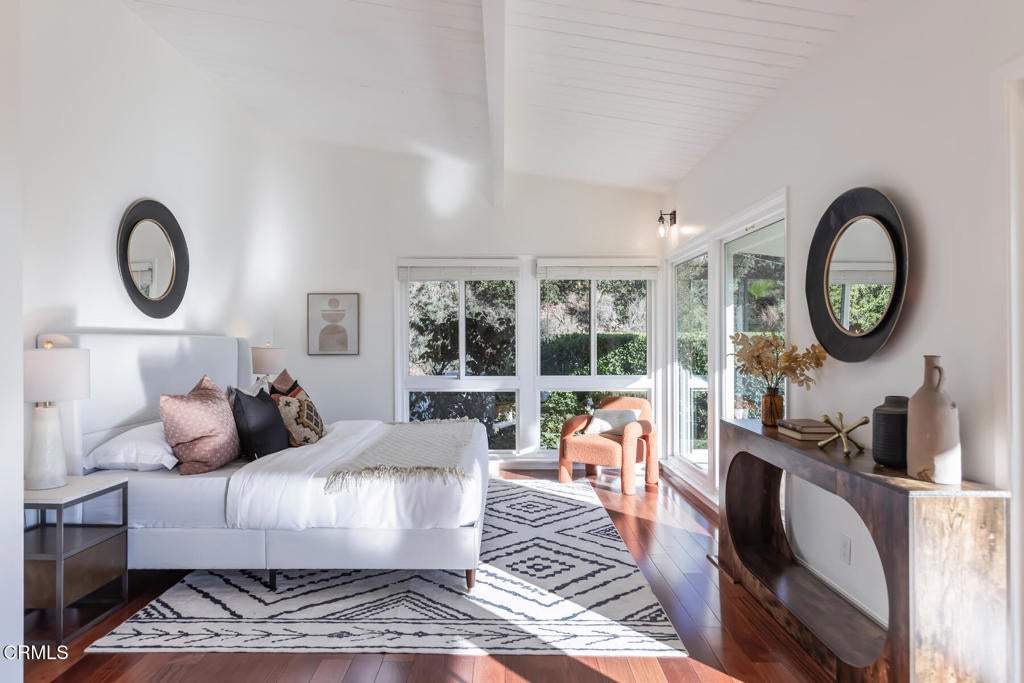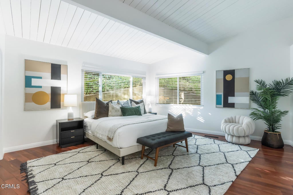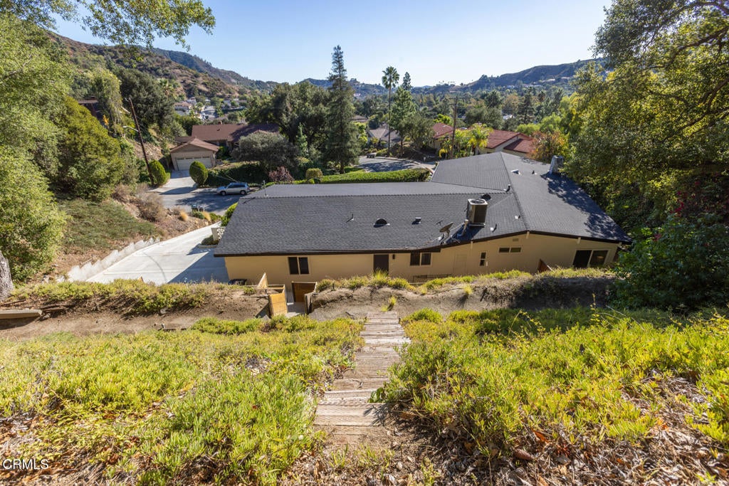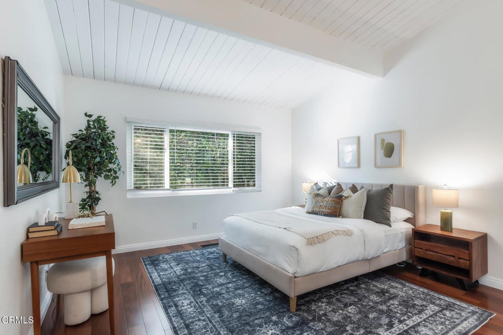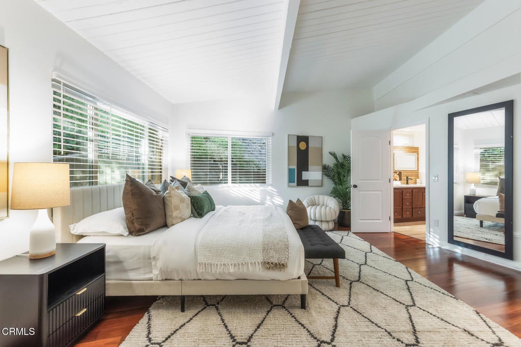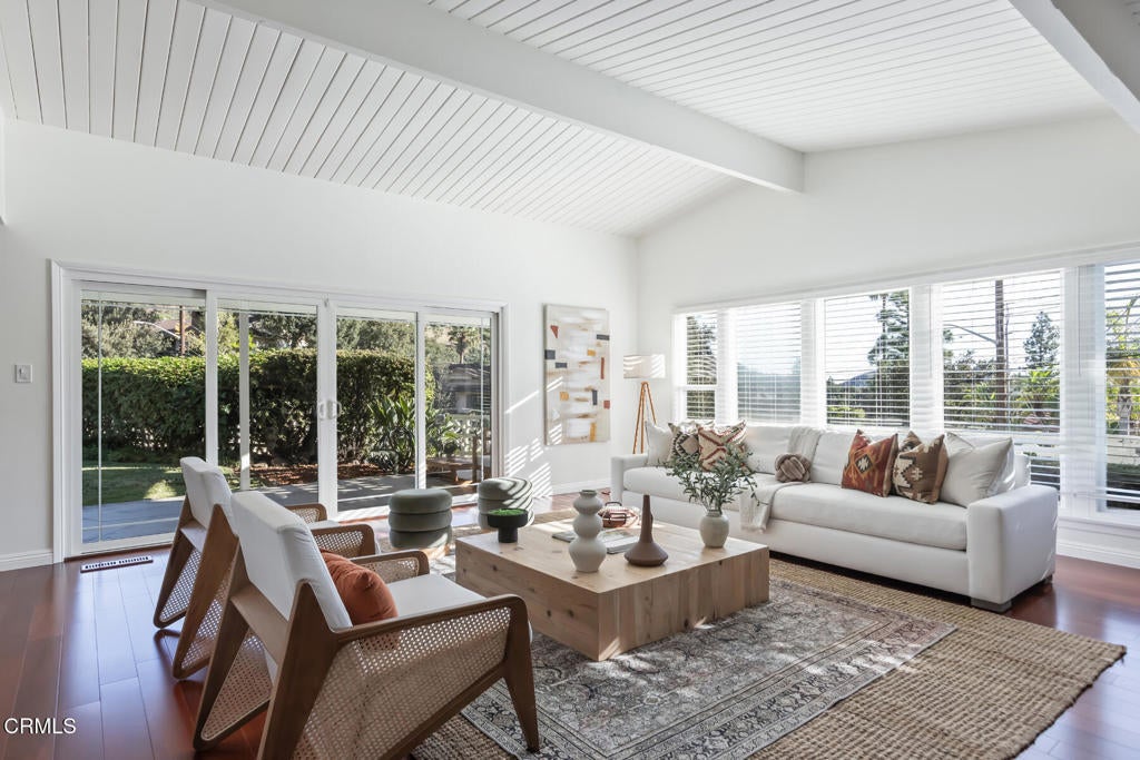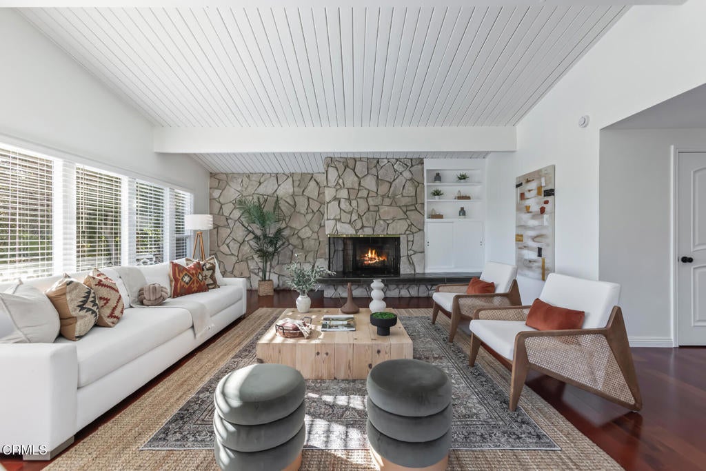Perched atop a gentle hill in the sought-after San Rafael Estates, this exceptional mid-century modern home blends timeless design with modern comfort to elevate everyday living. A flat, private front yard framed by lush greenery creates a serene escape from city life and a welcoming first impression. Classic double doors open to a formal entry that sets the tone for the home's warm and inviting style. The spacious living room is bathed in natural light, anchored by a floor-to-ceiling stone fireplace, soaring beamed ceilings, and an expansive wall of windows that bring the outdoors in, the quintessential mid-century touch. At the heart of the home, the open-concept kitchen and dining area are designed for both daily living and effortless entertaining. The sleek white kitchen features an island cooktop, allowing the chef to stay connected while preparing meals, with views of the front yard. A designer chandelier, built-in shelving, and direct patio access make the dining area an ideal gathering space. The primary BR suite is a peaceful retreat, offering a private entry, a wall of closets, and a beautifully updated bath with dual vanities, illuminated mirrors, and a separate tub and shower. Two additional spacious, bright and airy bedrooms share a hallway bath. The back has a patio area and hillside stairs that lead to an upper terrace with sweeping views of the city and beyond offering a blank canvas for your outdoor vision, whether it's a garden, seating area, or entertaining space. Additional features include: an oversized two-car garage with direct interior access and newly finished epoxy floors, Central AC & Heat, wood engineered flooring & exposed beamed ceilings throughout, stainless steel appliances, and so much more. Located just minutes from the 2, 134, 5 & 210 freeways and a short drive to DTLA, it's the perfect combination of convenience and tranquil escape.