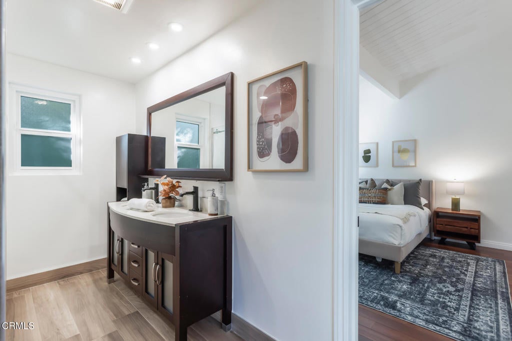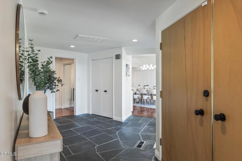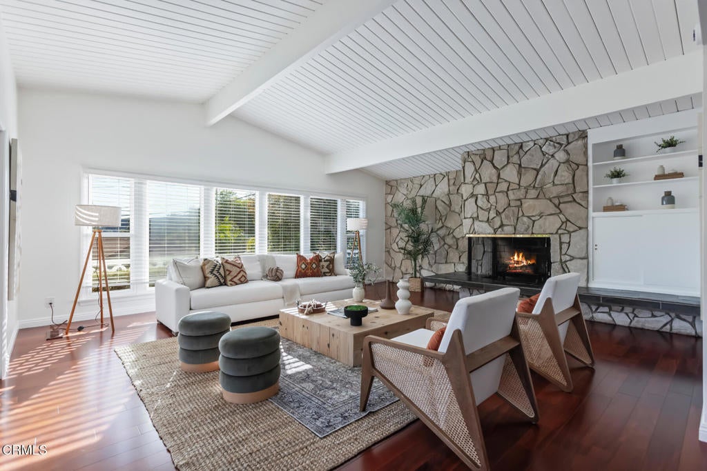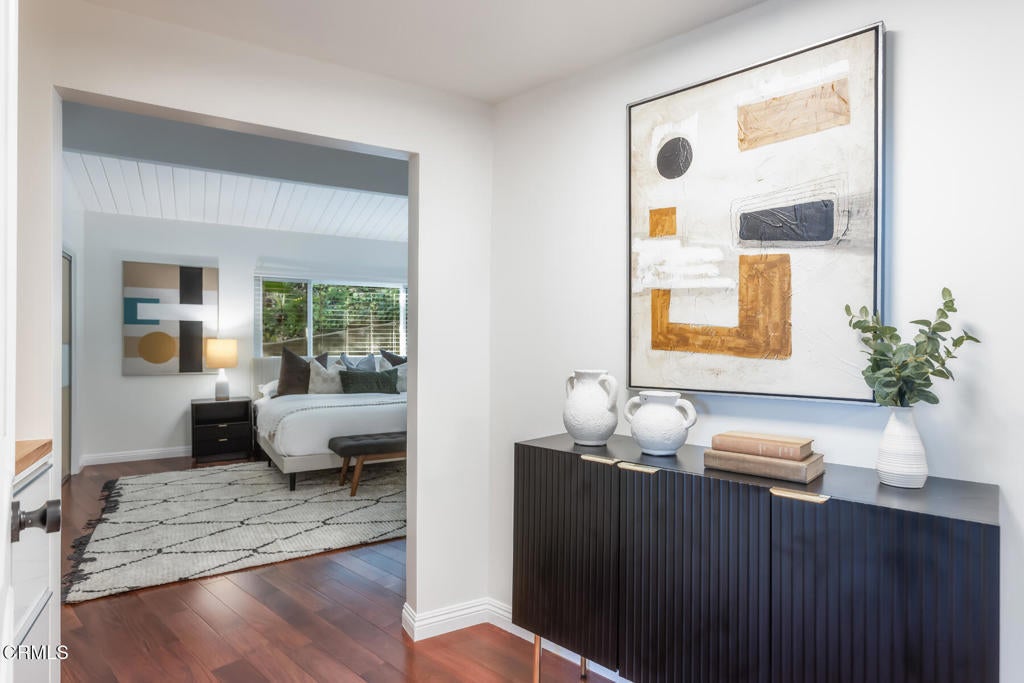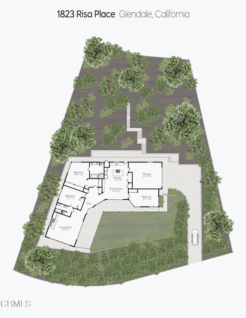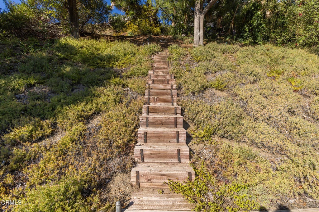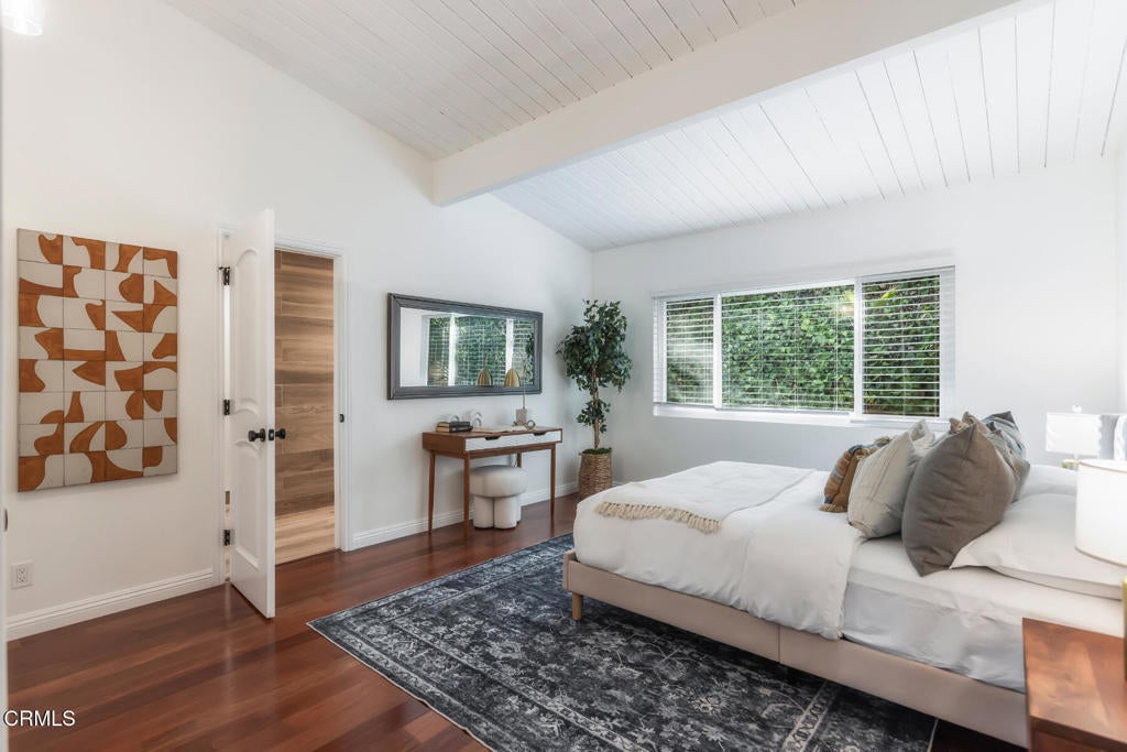 Perched atop a gentle hill in the sought-after San Rafael Estates, this exceptional mid-century modern home blends timeless design with modern comfort to elevate everyday living. A flat, private front yard framed by lush greenery creates a serene escape from city life and a welcoming first impression. Classic double doors open to a formal entry that sets the tone for the home's warm and inviting style. The spacious living room is bathed in natural light, anchored by a floor-to-ceiling stone fireplace, soaring beamed ceilings, and an expansive wall of windows that bring the outdoors in, the quintessential mid-century touch. At the heart of the home, the open-concept kitchen and dining area are designed for both daily living and effortless entertaining. The sleek white kitchen features an island cooktop, allowing the chef to stay connected while preparing meals, with views of the front yard. A designer chandelier, built-in shelving, and direct patio access make the dining area an ideal gathering space. The primary BR suite is a peaceful retreat, offering a private entry, a wall of closets, and a beautifully updated bath with dual vanities, illuminated mirrors, and a separate tub and shower. Two additional spacious, bright and airy bedrooms share a hallway bath. The back has a patio area and hillside stairs that lead to an upper terrace with sweeping views of the city and beyond offering a blank canvas for your outdoor vision, whether it's a garden, seating area, or entertaining space. Additional features include: an oversized two-car garage with direct interior access and newly finished epoxy floors, Central AC & Heat, wood engineered flooring & exposed beamed ceilings throughout, stainless steel appliances, and so much more. Located just minutes from the 2, 134, 5 & 210 freeways and a short drive to DTLA, it's the perfect combination of convenience and tranquil escape.