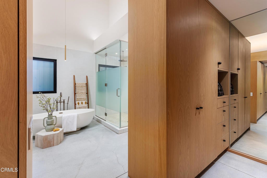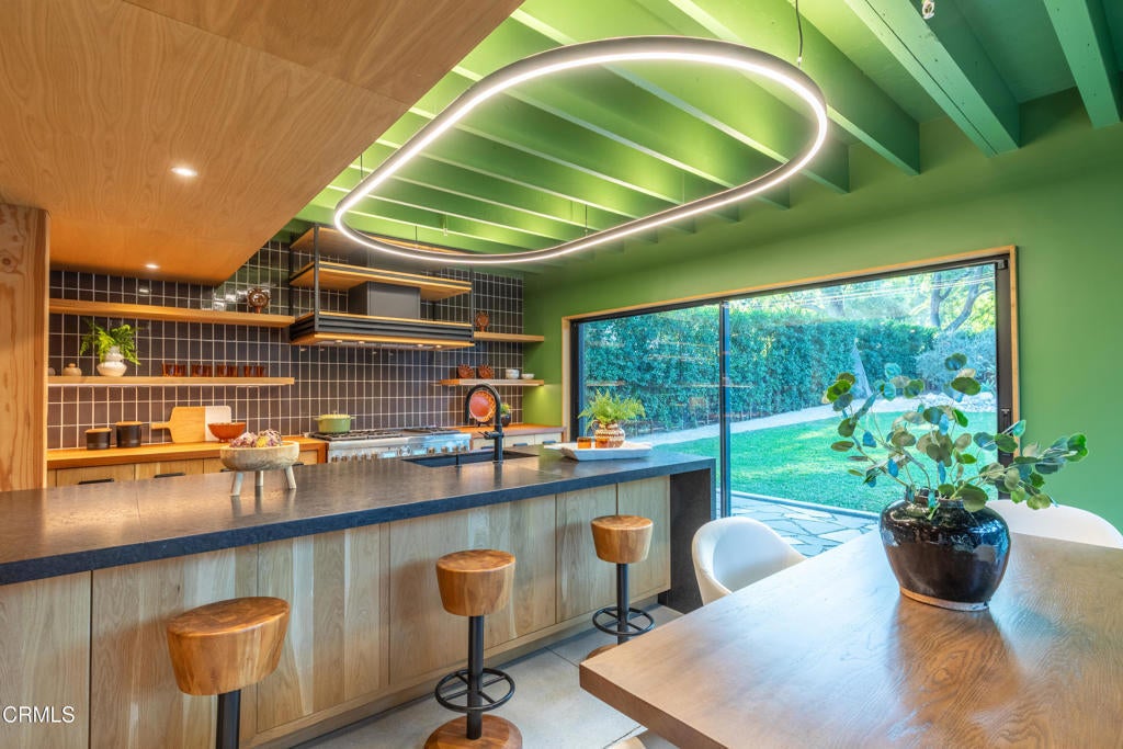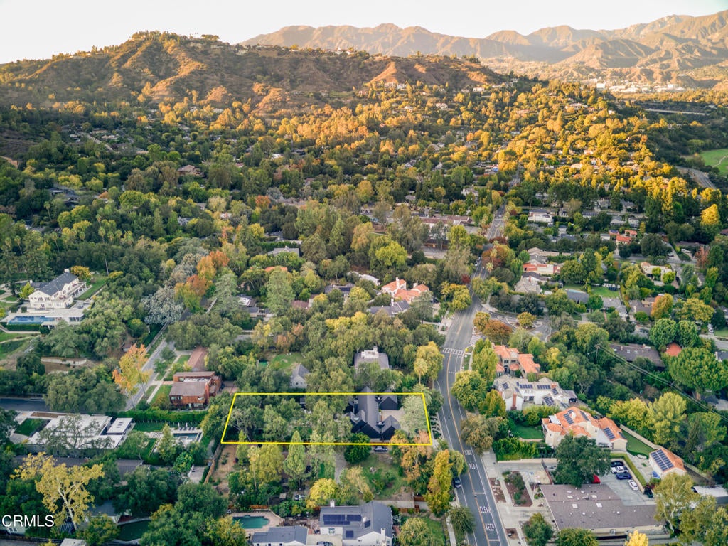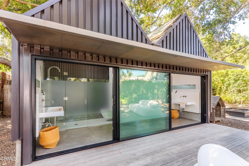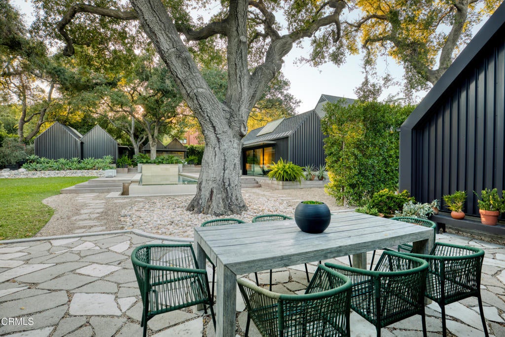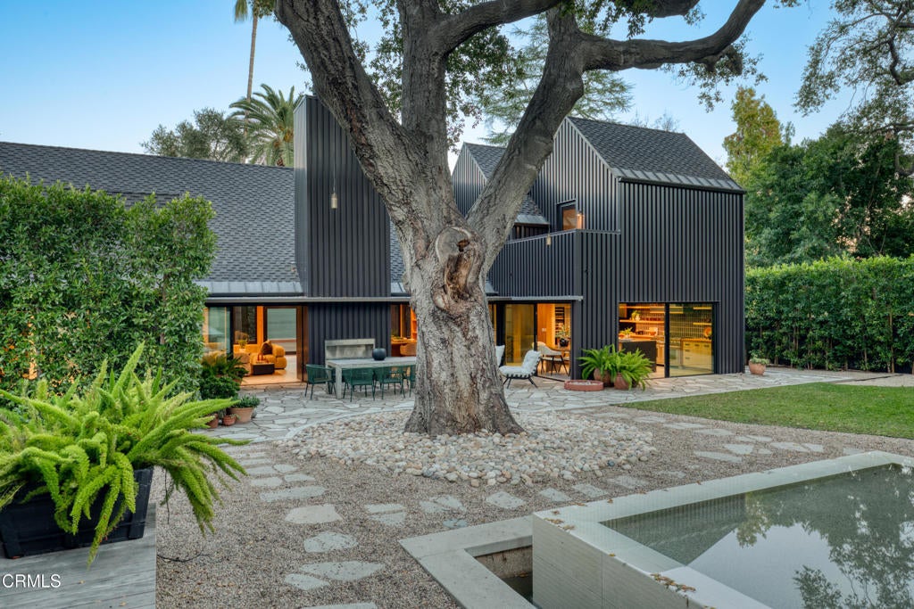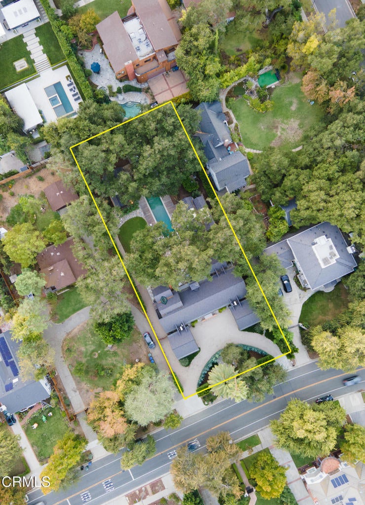 Stunning and newly constructed in 2021, this extraordinary Pasadena compound is thoughtfully nestled on over half an acre within a grove of majestic California oak trees in the beautiful Linda Vista neighborhood above the iconic Rose Bowl. Designed with great sensitivity to its natural surroundings, the residence blends a striking yet harmonious palette of concrete, steel, glass, and wood. Expansive angled gables, grand scale, and restrained details create an aesthetic that feels both modern and timeless--embracing the serenity of the landscape and the enduring character of California architecture.The heart of the home is the warm and inviting kitchen, outfitted with custom-milled cabinetry, chef's-grade appliances, and refined finishes. Sliding glass doors open directly to an outdoor dining patio and fireplace, a seamless connection between indoor and outdoor living. The main living area is defined by vaulted ceilings, walls of glass, and a fluid layout that blurs the boundaries between architecture and nature, filling the space with light and tranquility.The first-floor primary suite serves as a private retreat, featuring a luxurious, paneled dressing room and spa-like bath. A guest suite and private den or library complete the main level, while a sculptural, wood-shelved staircase ascends to two additional bedrooms--each with its own balcony and a shared bath. The lower level is dedicated to entertainment and leisure, offering a grand media and play space anchored by a dramatic fireplace. Outdoors, the estate unfolds around a large east-west swimming pool and spa framed by two magnificent specimen oaks. Surrounding the pool, three complementary structures--a guest house, an office or studio building, and a pool bath house--mirror the main residence's elegant double-gable design and soaring ceilings. A motor court, flanked by dual two-car garages, provides both convenience and a sense of stately arrival.This masterfully crafted property embodies the rare synthesis of architectural innovation, natural beauty, and timeless California living--an inspired retreat where design and environment exist in perfect harmony.