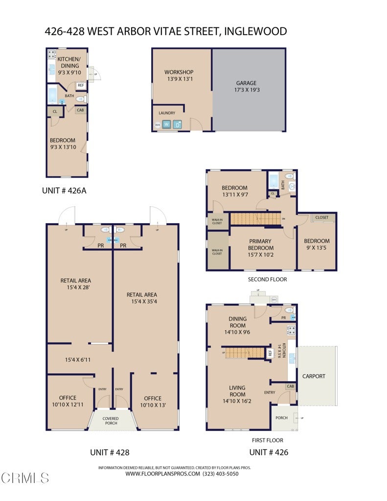 Well cared for property with measured1,589 square foot print shop and two houses in rear. The print shop may be divisible into two units of approximately 795 square feet each. They have been at this location for apx 30 years and would like to remain. Unit has central air and two restrooms. The three bedroom, one and one-half bath two story home has 1,305 square feet. Living room has wood floors, floor furnace and mini-blinds. Kitchen has linoleum flooring and counters, dual metal sinks, ample cabinetry and garbage disposal. Three bedrooms are all upstairs with ceiling fans and wood flooring. Larger bedroom has a walk-in closet. One full bathroom upstairs. One bedroom, one bathroom quaint cottage measured at 317 square feet has wood flooring, window AC, and wall heater. Oversized two-car garage, measured at 654 square feet with laundry and workshop. Residential units subject to state rent control. City of Inglewood offers a sound remediation program which may include new windows, air conditioning, and insulation. Please contact the city for additional information.