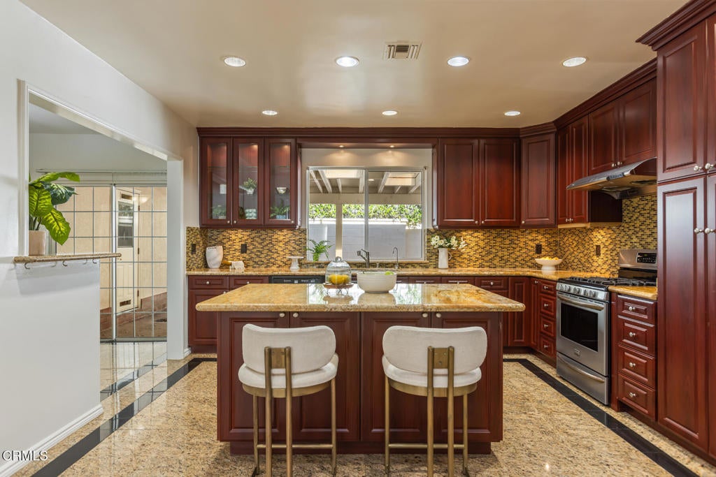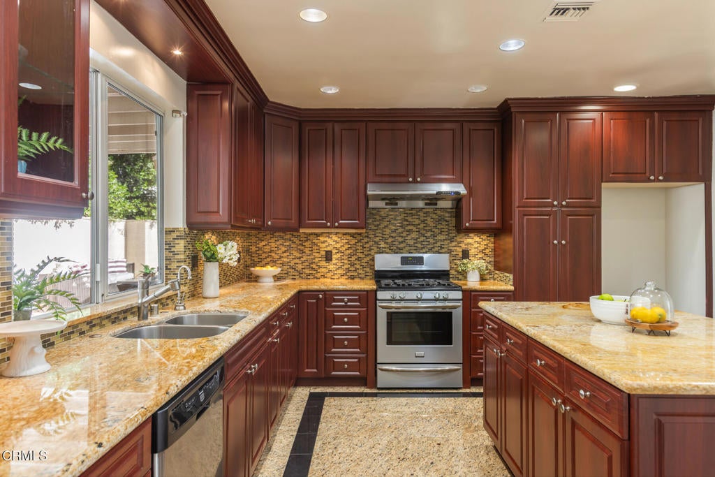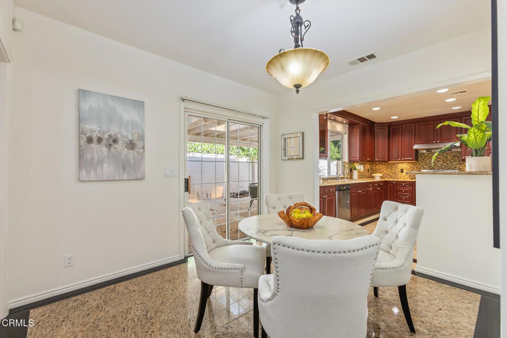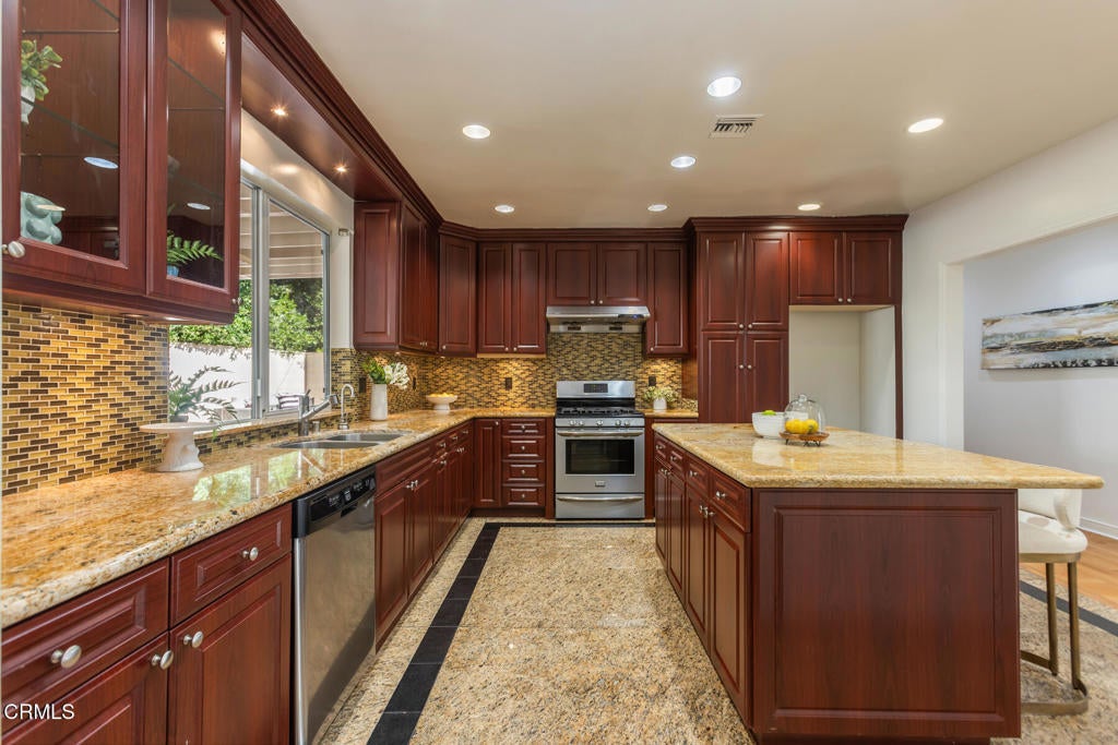 Located in the heart of La Canada Flintridge, this inviting single-level home blends generous living spaces with timeless comfort. The impressive entry opens into a large family room appointed with a stylish built-in bar and sleek granite flooring, setting the tone for relaxed living. Just beyond, the formal living room showcases impressive high ceilings, a classic fireplace, and warm hardwood floors, creating an inviting environment for gatherings of any size.The formal dining room provides a warm and elegant setting for hosting dinners. The large, gourmet kitchen offers a functional and open workspace, complete with a center island and stainless- steel appliances, granite countertops, and matching granite floors. Adjacent to the kitchen, a bright breakfast room flows effortlessly to a covered side patio, creating a seamless indoor-outdoor dining experience.All three bedrooms are generously sized and include their own en-suite bathrooms, ensuring comfort and privacy throughout. Step outside to the serene backyard, where a sparkling pool and inviting spa create a peaceful retreat for year-round enjoyment. Enjoy close proximity to award-winning La Canada Schools, JPL, local shopping and dining, freeway access, and more.
