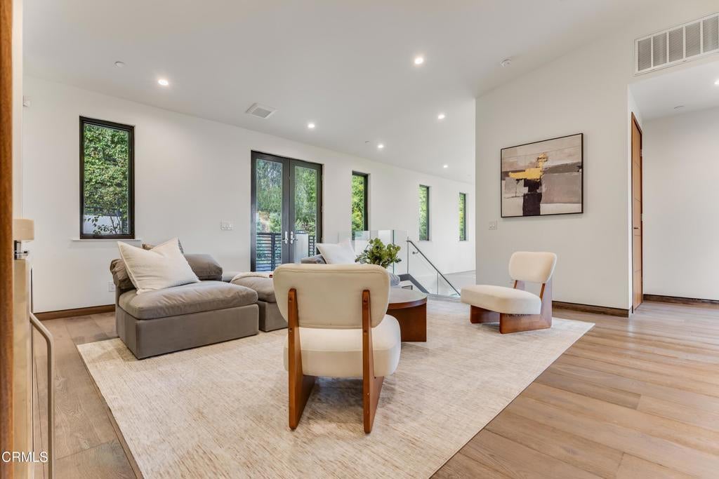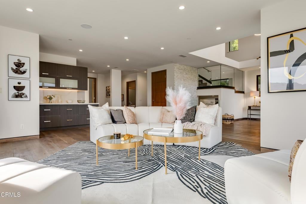 Located in the coveted Silver Triangle of Studio City, this private three-level luxury home offers over 5,000 sq ft of living space with 5 bedrooms and 7 bathrooms. The home features an open lower level with a chef's kitchen and spacious living area, ideal for entertaining. The primary suite is a true retreat, offering stunning 270-degree valley and mountain views, a private balcony, and a spa-style bathroom. Enjoy multiple outdoor patio spaces, a large private entertaining area, home gym, ample storage, and room to add an elevator. A two-car garage with long driveway provides convenience and privacy. Just minutes from Fryman Canyon trails, this exceptional home combines luxury, privacy, and a prime Studio City location.