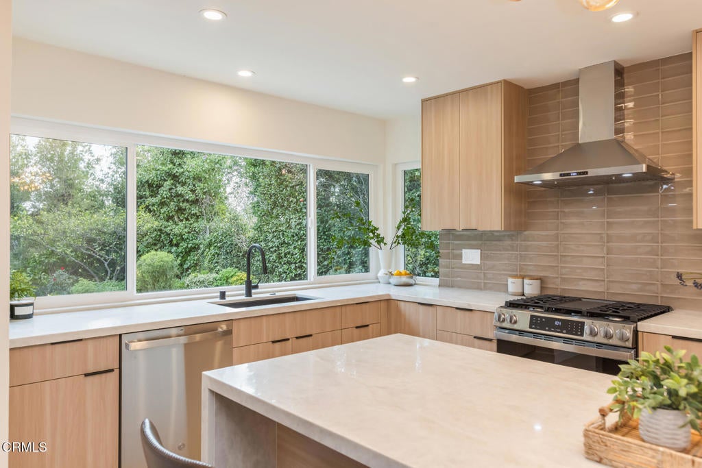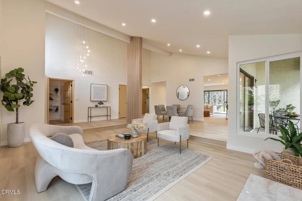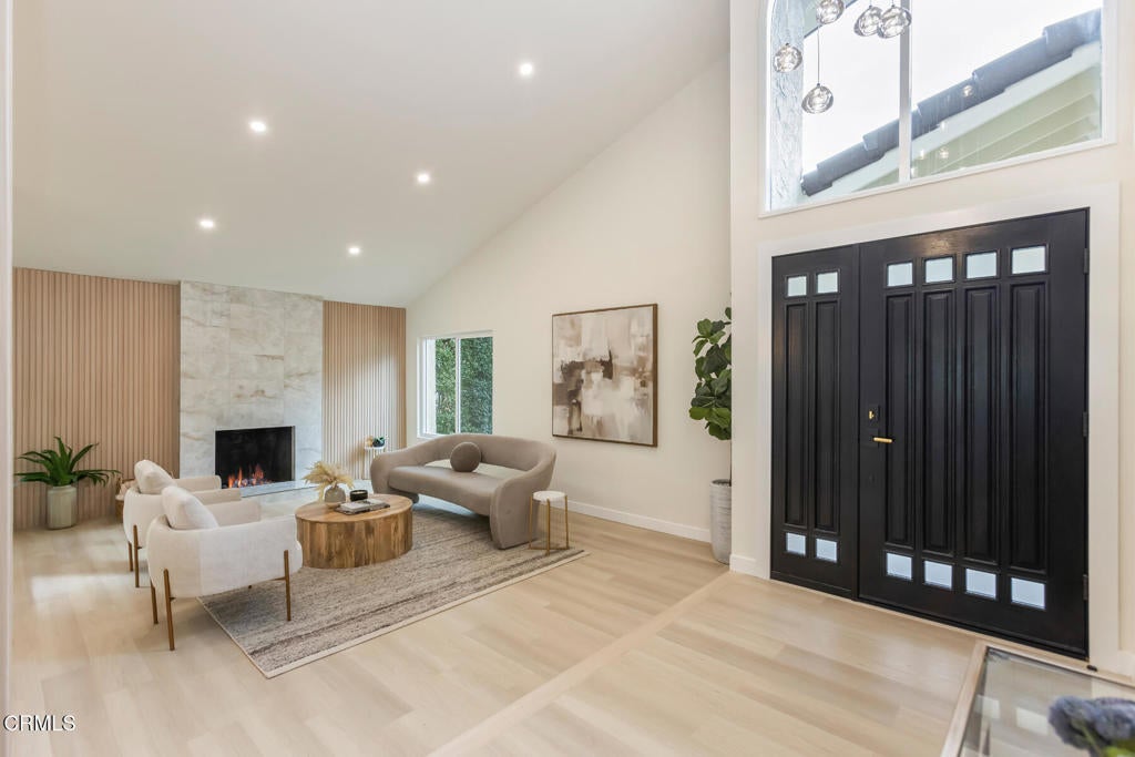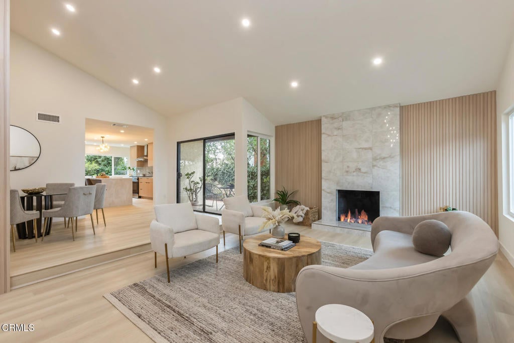 This beautifully reimagined, single-story home, located in one of Porter Ranch's most desirable neighborhoods, has been thoughtfully updated, blending modern luxury with timeless design. Step inside and into the inviting entry foyer, highlighted by high ceilings and natural light. Throughout the home, brand-new water-resistant flooring and fresh interior and exterior paint create a clean, contemporary feel.The main living area is anchored by a renovated fireplace with new tile and paneling, offering a refined focal point for gatherings. At the heart of the home, the fully renovated kitchen showcases brand-new cabinetry, Taj Mahal quartz countertops, a waterfall island accented by a mid-century modern chandelier, and a complete suite of new GE appliances--including refrigerator, range, dishwasher, and hood. The primary suite features high ceilings, a walk-in closet as well as a secondary closet, access to the backyard, and an en-suite bath. Both bathrooms have been completely renovated to include new vanities, fixtures, lighting, shower tiles/doors and more. A bonus room/office provides the ideal work from home space with bookshelves and new lighting. New windows throughout the home enhance natural light and energy efficiency, while all doors have been repainted and upgraded with modern hardware. A brand-new front door and garage door further elevate the home's curb appeal. Additional highlights include a well-appointed laundry room with LG washer and dryer, updated sink, and fixtures, as well as a fully drywalled and painted garage. Outside, enjoy the peaceful setting with new landscaping and irrigation system, as well as a covered patio. Minutes away from top-rated schools, local shopping and dining, parks, golf courses, and more.