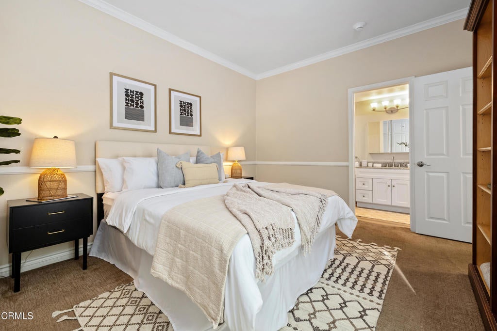 This private top floor, end unit condo blends treetop and mountain view living with a refined, modern sensibility, and is set along a grand Pasadena boulevard near the historic Bungalow Heaven neighborhood. Located within a gated complex with controlled access and elevator service, the home offers a tucked-away feel paired with the coveted privacy of a top-level location with no neighbors above. Inside, stylish turnkey upgrades create a sophisticated yet approachable atmosphere, highlighted by a beautifully renovated kitchen with custom selected granite countertops, a Fisher & Paykel dishwasher, and stainless steel refrigerator, designed to feel equally at home hosting friends or easing into everyday routines. The living area is open plan style and features soaring ceilings with light cascading in from clerestory windows above. Both bedrooms feature an entire wall of custom designed built-in closet and cabinetry, a rare and highly sought-after luxury in condominiums which delivers exceptional storage with a clean, tailored aesthetic. Each bedroom enjoys its own updated, spa-inspired bathroom, offering comfort and privacy rarely found at this price point. Step onto the dining-size balcony to take in a calming mountain backdrop, perfect for morning coffee, sunset unwinding, or a reset at the end of the day. In-unit laundry, central air and heat and 2 side-by-side parking spaces in the secure garage, top off the generous features list. Ideally situated in the center of Pasadena, one is never far from Old Town Pasadena, the Lake Avenue District, Caltech, and all the daily necessity shopping of East Pasadena, including Trader Joes, Whole Foods and Target, and easy access to the 210 Freeway is just a 1/2 mile away. A rare opportunity to enjoy private, modern condo living in Pasadena, set within an established, architecturally rich neighborhood, with the city's energy, culture, dining, and everyday conveniences just moments away.