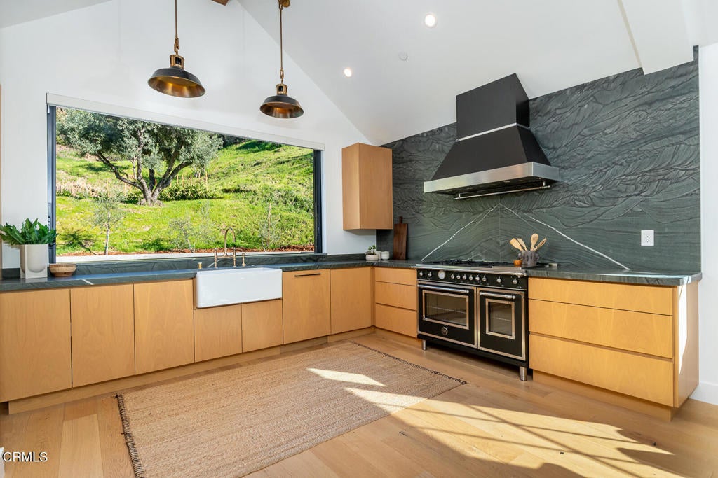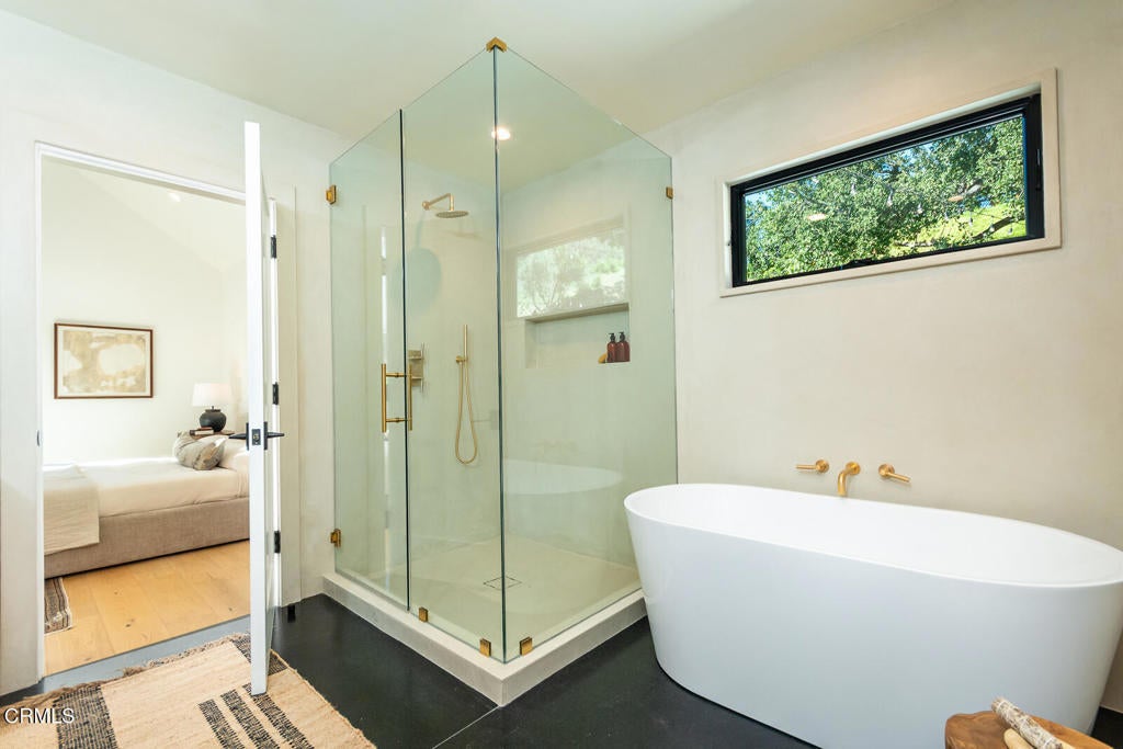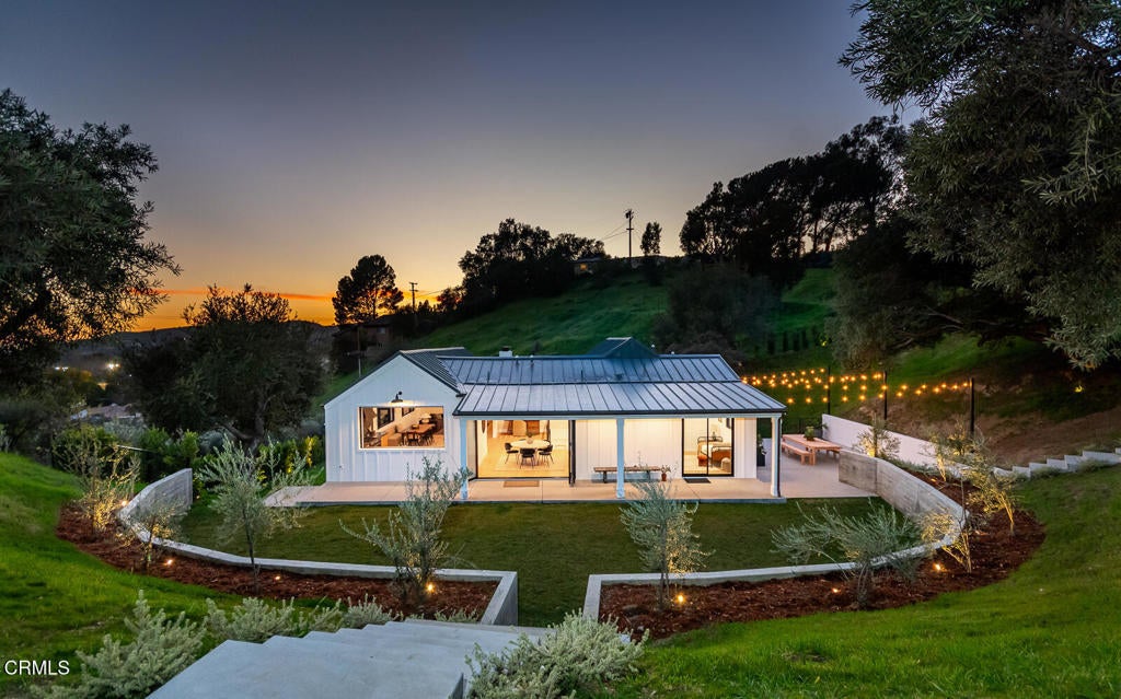 This elegantly redesigned Sonoma style farmhouse residence offers four bedrooms and five beautifully appointed bathrooms, blending timeless architecture with refined modern living. Thoughtfully designed interiors feature wide-plank white oak flooring and exceptional finishes throughout, creating a warm yet sophisticated atmosphere. Every space has been curated with attention to detail, from the gracious living areas to the serene bedroom suites, delivering both comfort and understated luxury. Designed for both everyday living and gracious entertaining, the home seamlessly blends classic farmhouse charm with contemporary luxury. Located at the end of a cul-de-sac with a gated perimeter this home offers over 4.5 acres of privacy, studded with mature olives trees and views of DTLA.