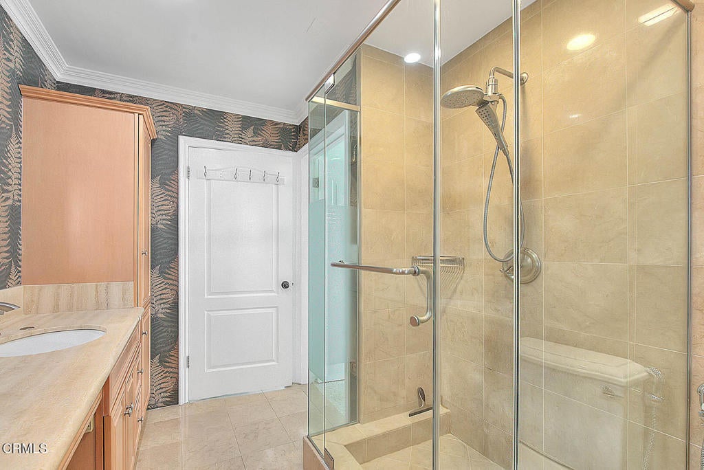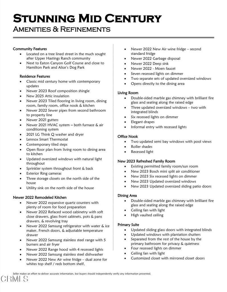 Step into this exceptional mid-century residence nestled in the heart of coveted Hastings Ranch, where iconic architectural lines have been thoughtfully elevated with refined, contemporary upgrades. Designed for both grand entertaining and everyday comfort, the home immediately impresses with a spacious living room anchored by a striking marble fireplace, recessed lighting, and a picturesque bay window that fills the space with natural light and timeless elegance.At the heart of the home is the stunning chef's kitchen, a true showpiece featuring premium stainless steel appliances, expansive quartz countertops, custom-designed cabinetry, and dual wine refrigerators--perfect for hosting in style and was updated in 2022. The kitchen flows effortlessly into the dining area, highlighted by soaring vaulted ceilings and a built-in office nook overlooking the pool and lush gardens, blending function with inspired design. The family room offers a wall of windows framing serene pool and garden views, recessed lighting, its own split-system air conditioning, and direct access to the outdoor entertaining areas was refreshed in 2023.The luxurious primary suite is a private retreat, complete with a large custom closet, recessed lighting, ceiling fan, and direct access to the pool. The spa-inspired primary bath indulges with a jetted soaking tub featuring a built-in flat-screen TV, a spacious walk-in shower, and dual vanities. Two additional generously sized bedrooms feature new ceiling fans and plantation shutters, while the beautiful hallway bath elevates the experience with marble finishes, an oversized shower with seating and niches, a newer vanity, and a Toto Washlet bidet was renovated in 2022.Outdoors, the home truly shines, embracing the best of the California lifestyle. The backyard is an entertainer's paradise with a generous swimming pool, a charming trellis ideal for alfresco lounging, and a tiki-themed succulent garden that perfectly complements the home's mid-century aesthetic. To top it off, enjoy sweeping views of the San Gabriel Mountains while lounging in the pool.Additional highlights include updated windows, recessed lighting, crown molding throughout, and abundant storage. This remarkable property offers multiple spaces to relax, work, and entertain, making it far more than a home--it's a lifestyle opportunity. Experience refined mid-century living at its absolute best.